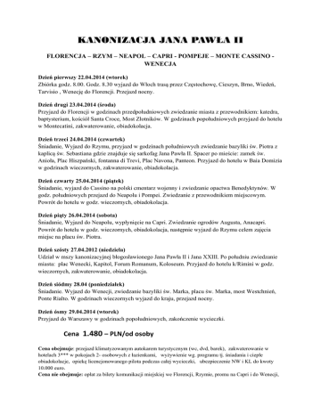 KANONIZACJA JANA PAWŁA II FLORENCJA – RZYM – NEAPOL – CAPRI - POMPEJE – MONTE CASSINO WENECJA Dzień pierwszy 22.04.2014 (wtorek) Zbiórka godz. 8.00. Godz. 8.30 wyjazd do Włoch trasą przez Częstochowę, Cieszyn, Brno, Wiedeń, Tarvisio , Wenecję do Florencji. Przejazd nocny. Dzień drugi 23.04.2014 (środa) Przyjazd do Florencji w godzinach przedpołudniowych zwiedzanie miasta z przewodnikiem: katedra, baptysterium, kościół Santa Croce, Most Złotników. W godzinach popołudniowych przyjazd do hotelu w Montecatini, zakwaterowanie, obiadokolacja. Dzień trzeci 24.04.2014 (czwartek) Śniadanie, Wyjazd do Rzymu, przyjazd w godzinach południowych zwiedzanie bazyliki św. Piotra z kaplicą św. Sebastiana gdzie znajduje się sarkofag Jana Pawła II. Spacer po mieście: zamek św. Anioła, Plac Hiszpański, fontanna di Trevi, Plac Navona, Panteon. Przyjazd do hotelu w Baia Domizia w godzinach wieczornych, zakwaterowanie, obiadokolacja. Dzień czwarty 25.04.2014 (piątek) Śniadanie, wyjazd do Cassino na polski cmentarz wojenny i zwiedzanie opactwa Benedyktynów. W godz. południowych przejazd do Neapolu i Pompei. Zwiedzanie z przewodnikiem miejscowym. Powrót do hotelu w godz. wieczornych, obiadokolacja. Dzień piąty 26.04.2014 (sobota) Śniadanie, Wyjazd do Neapolu, wypłynięcie na Capri. Zwiedzanie ogrodów Augusta, Anacapri. Powrót do hotelu w godz. wieczornych, obiadokolacja, następnie wyjazd do Rzymu celem zajęcia miejsc na placu św. Piotra. Dzień szósty 27.04.2012 (niedziela) Udział w mszy kanonizacyjnej błogosławionego Jana Pawła II i Jana XXIII. Po południu zwiedzanie miasta: plac Wenecki, Kapitol, Forum Romanum, Koloseum. Przyjazd do hotelu k/Rimini w godz. wieczornych, zakwaterowanie, obiadokolacja. Dzień siódmy 28.04 (poniedziałek) Śniadanie. Wyjazd do Wenecji, zwiedzanie bazyliki św. Marka, placu św. Marka, most Westchnień, Ponte Rialto. W godzinach wieczornych wyjazd do kraju, przejazd nocny. Dzień ósmy 29.04.2014 (wtorek) Przyjazd do Warszawy w godzinach popołudniowych, zakończenie wycieczki. Cena 1.480 – PLN/od osoby Cena obejmuje: przejazd klimatyzowanym autokarem turystycznym (wc, dvd, barek), zakwaterowanie w hotelach 3*** w pokojach 2- osobowych z łazienkami, wyżywienie wg. programu tj. śniadania i ciepłe obiadokolacje, opiekę licencjonowanego pilota podczas całej wycieczki, ubezpieczenie NW i KL do kwoty 10.000 euro. Cena nie obejmuje: opłat za bilety komunikacji miejskiej we Florencji, Rzymie, promu na Capri i do Wenecji, dodatkowego rejsu wokół Capri z wpłynięciem do Lazurowej Groty 30 euro, opłat za przewodników miejscowych, kosztów wypożyczenia zestawów tour-guide , łącznie 130+ 30 (Lazurowa Grota) euro.