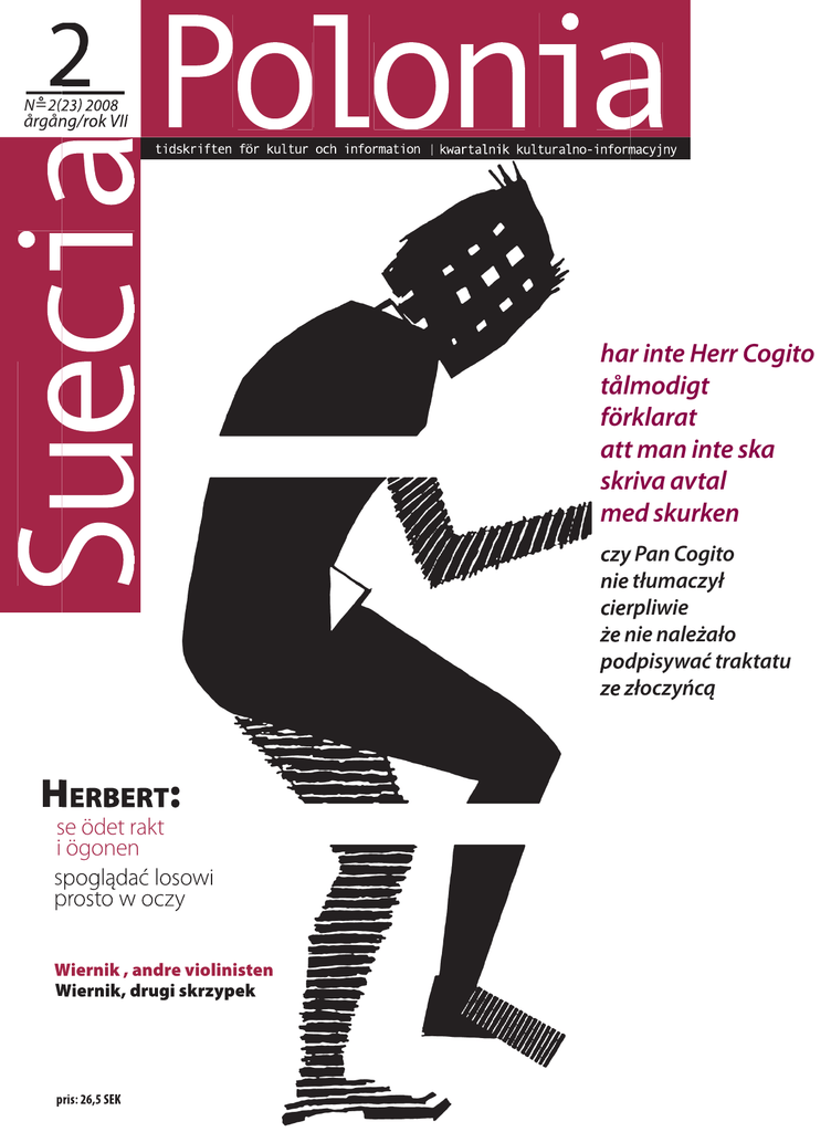 � ������� ��������� Polonia Suecia �������������� tidskriften för kultur och information �������� ������������� �������� ����������������� ������������� ��������������������������� ����������������������� �������������� | kwartalnik kulturalno-informacyjny �������������������� ��������� ��������� ���������������� ������������ ����������� �������������� ������������� ���������� ��������������� �������������������� ������������ ��� ��������� �������� Rok Herberta Zbigniew Herberts år Zbigniew Herbert wydaje się poetą lekkim łatwym i przyjem nym est to lekkość monumentalna patetyczna łatwość – zwod nicza przyjemność – zdradliwa kończąca się jak po wypiciu zbyt wielu butelek przedniego wina rostota języka i wersyfi kacji sprawiają że wiersze są na pozór łatwo zrozumiałe i przejrzyste le okazjonalni admiratorzy twórczości erberta mylą pełne wewnętrznych napięć wiersze z umoralniającą pogadanką albo lekcją katechezy olsce poetę przywłaszczają sobie wszystkie obozy polityczne a komuny był ikoną opozycji demokratycznej liberalnochrześcijańskolewicowej taka była specjalność pols kiego życia umysłowego hybrydyzacja myśli eraz usiłuje wessać erberta skrajna prawica spomina o tym krytyk rzysztof asłoń w swoim artykule którym otwieramy dzisiejszy numer oncentruje się jednak na erberciepoecie czytanym przez wszystkich ale czy też rozumianym omik an ogito jest zdaniem asłonia przełomem w poezji polskiej ubiegłego stulecia może nie tylko polskiej gromna większość wierszy erberta jest przełożona na szwedzki tym numerze rozpoczynamy cykl o erbercie i jego twórczości obejmującej teżznakomite eseje i dramaty które zaprezentujemy w naszych kolejnych tegorocznych wydaniach Zbigniew Herberts poesi förefaller lätt enkel och trevlig ättheten är monumental patetisk enkelheten – förledande trevnaden – bedräglig efteråt känns det som om man hade druckit alltför många flaskor utsökt vin et okomplicerade språket och den obundna versen gör att dikterna ger sken av att vara lättfattliga och genomskådliga en tillfälliga beundrare av erberts författarskap brukar för växla de lidelsefulla dikterna med moralförbättrande föredrag eller katekeslektioner olen lägger alla politiska läger beslag på poeten nder kommunismen var han en ikon för den demokratiska opposi tionen den kristna liberalvänstern det var de polska intellektuellas specialitet hybridisering av idéer u försöker extremhögern att roffa åt sig erbert m det skriver litteraturkritikern rzysztof asłoń i sin artikel som öppnar detta nummer an fokuserar dock på erbert som poet – läst av alla men är han förstådd av alla iktsamlingen err ogito var enligt asłoń vändpunkten för det förra seklets polska poesi en det gäller kanske inte bara den polska poesin e flesta av erberts dikter finns i svensk översättning detta nummer börjar en serie om erbert och hans författarskap som också omfat tar utmärkta essäer och dramer som skall presenteras i kommande nummer detta år Do trzech razy sztuka Tre gånger gillt Mika Larsson – dziennikarka – dwukrotnie, już za nowej Polski, była attache kulturalną Ambasady Królestwa Szwecji w Warszawie: w latach - i -, po czym attachat zlikwidowano. Jest osobą wybitnie zasłużoną dla rozwoju polsko-szwedzkich stosunków kulturalnych. Ostatnio wzięła udział w dyskusji na temat nowej koncepcji działania Instytutu Polskiego w Sztokholmie. Mika Larsson, journalist till yrket har vid två tillfällen i det nya olen - och - varit veriges kulturattaché vid den svenska ambassaden i arszawa varefter tjänsten avskaf fades on har gjort förtjänstfulla insatser i det polsksvenska kulturutbytet å sistone har hon deltagit i diskussionen kring det nya olska nstitutets utformning „Decyzja o zlikwidowaniu etatu attache kulturalnego w szwedzkiej Ambasadzie w Warszawie dwukrotnie była o krok od zrealizowania. Również dwukrotnie, dzięki protestom udało się tę decyzję odwlec. Za trzecim razem to się nie powiodło i w dniu dzisiejszym szwedzko-polska wymiana kulturalna w dużej mierze zależy od Instytutu Polskiego w Sztokholmie. To Instytut Polski nadaje jej tempo. vå gånger var beslutet mycket nära att kapa kulturrådstjäns ten vid veriges ambassad i arszawa vå gånger lyckades pro tester stoppa beslutet en tredje gången gick det inte och idag är det svenskpolska kultursamarbetet i hög grad beroende av olska nstitutet i tockholm et är som driver på et är här idéerna skapas och här som framtiden kan få draghjälp Dlaczego jednak Królestwo Szwecji cały ciężar współpracy kulturalnej między oboma krajami składa na barki Polskiego Instytutu? A może z rachunku zysków i strat Szwecji wychodzi, że straty z kulturalnej wymiany przewyższają zyski? Na te i inne pytania Mika Larsson odpowie nam w następnym numerze. arför lägger verige hela bördan av kultursamarbetet mellan länderna på olska nstitutets axlar anske har resultaträkningen visat att kulturutbytets förluster överstiger vinsterna nästa nummer kommer ika arsson att ta sig an dennna och andra frågor Miałem szczęście, kupiłem ostatni egzemplarz „Pana Cogito” Zbigniewa Herberta. Najwybitniejszy tom poezji polskiej, jaki wyszedł za mojego życia. Po dziś dzień