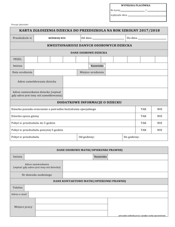 WYPEŁNIA PLACÓWKA Nr karty________________________ / ___________________ wpłynęło dnia ______________________________________ Pieczęć placówki KARTA ZGŁOSZENIA DZIECKA DO PRZEDSZKOLA NA ROK SZKOLNY 2017/2018 Przedszkole w REŃSKIEJ WSI Od dnia ___________________________ Do dnia ________________________ KWESTIONARIUSZ DANYCH OSOBOWYCH DZIECKA DANE OSOBOWE DZIECKA PESEL Imiona Nazwisko Data urodzenia Miejsce urodzenia Adres zameldowania dziecka Adres zamieszkania dziecka (wpisać gdy adres jest inny niż zameldowania) DODATKOWE INFORMACJE O DZIECKU Dziecko posiada orzeczenie o potrzebie kształcenia specjalnego TAK NIE Dziecko spoza gminy TAK NIE Pobyt w przedszkolu do 5 godzin TAK NIE Pobyt w przedszkolu powyżej 5 godzin TAK NIE Pobyt w przedszkolu Od godziny: Do godziny: DANE OSOBOWE MATKI/OPIEKUNKI PRAWNEJ Imiona Nazwisko Adres zamieszkania (wpisać gdy adres jest inny niż dziecka) Nr dowodu osobistego DANE KONTAKTOWE MATKI/OPIEKUNKI PRAWNEJ Telefon Adres e-mail Miejsce pracy pieczątka zakładu pracy i podpis osoby uprawnionej DANE OSOBOWE OJCA/OPIEKUNA PRAWNEGO Imiona Nazwisko Adres zamieszkania (wpisać gdy adres jest inny niż dziecka) Nr dowodu osobistego DANE KONTAKTOWE OJCA/OPIEKUNA PRAWNEGO Telefon Adres e-mail Miejsce pracy pieczątka zakładu pracy i podpis osoby uprawnionej INFORMACJE DODATKOWE (proszę zakreślić odpowiednio TAK lub NIE) Dziecko w wieku 5 lat odbywające roczne obowiązkowe przygotowanie przedszkole TAK NIE Dziecko obojga rodziców pracujących, zgłoszone do placówki na pobyt dłuższy niż 5 godzin TAK NIE Dziecko matek lub ojców, wobec których orzeczono znaczny lub umiarkowany stopień niepełnosprawności bądź całkowitą niezdolność do pracy oraz niezdolność do samodzielnej egzystencji na podstawie odrębnych przepisów TAK NIE Dziecko matek lub ojców samotnie je wychowujących TAK NIE Dziecko zmieniające placówkę z powodu zmiany miejsca zamieszkania TAK NIE Dziecko uczęszczające wcześniej do żłobka TAK NIE 1 2 1 Pobyt do 5 godz. - bezpłatna podstawa programowa w godzinach wskazanych przez placówkę 2 Przez osobę samotnie wychowującą dziecko rozumie się; wdowę, wdowca, osobę pozostającą w separacji orzeczonej wyrokiem sądu, osobę rozwiedzioną, pannę, kawalera, chyba że wychowuje wspólnie co najmniej jedno dziecko z jego rodzicem. KORZYSTANIE Z WYŻYWIENIA (proszę zakreślić odpowiednio TAK lub NIE) Obiad TAK NIE Podwieczorek TAK NIE DODATKOWE INFORMACJE O DZIECKU MOGĄCE MIEC ZNACZENIE PODCZAS JEGO POBYTU W PLACÓWCE_______ Stan zdrowia dziecka, szczególne zdolności i umiejętności dziecka, szczególne potrzeby rozwojowe : OŚWIADCZENIE RODZICA SAMOTNIE WYCHOWUJĄCEGO DZIECKO Oświadczam, że nie zamieszkuję wspólnie z ojcem/matką, oraz że nie sprawuje On/Ona opieki nad dzieckiem i nie wychowuje go wspólnie ze mną. Podpis rodzica OŚWIADCZENIA RODZICÓW / OPIEKUNÓW PRAWNYCH - Oświadczam, że zapoznałem się z treścią Procedury Rekrutacyjnej i akceptuję jej warunki - Wyrażam zgodę na przetwarzanie danych osobowych zawartych w Karcie Zapisu i w syst emach informatycznych w zakresie niezbędnym do przeprowadzenia naboru do przedszkoli, zgodnie z ustawą z dnia 29 sierpnia 1997r. o ochronie danych osobowych (Dz. U. z 2002r. Nr 101, poz. 926 z późn. zm.) - Świadomy odpowiedzialności karnej w przypadku podania nieprawidłowych danych, oświadczam, że przedłożone w niniejszej karcie informacje są zgodne ze stanem faktycznym - Przyjmuję do wiadomości, że w przypadku stwierdzenia , iż przyjęcie dziecka do placówki nastąpiło w wyniku nieprawdziwych danych, dziecko zostanie w trybie natychmiastowym skreślone z listy uczęszczających do tejże placówki. PROSIMY O ZDEKLAROWANIE UDZIAŁU DZIECKA W LEKCJACH RELIGI, JĘZYKA NIEMIECKIEGO ORAZ JĘZYKA ANGIELSKIEGO (proszę zakreślić odpowiednio TAK lub NIE) Religia TAK NIE Język niemiecki TAK NIE Język angielski TAK NIE Rytmika TAK NIE (dotyczy roczników 2011, 2012, 2013) Miejscowość, data Podpis matki/opiekunki prawnej Podpis ojca/opiekuna prawnego DECYZJA KOMISJI KLASYFIKACYJNEJ – ORGANU PROWADZĄCEGO: Na podstawie decyzji dyrektora, komisji kwalifikacyjnej z dnia ....................................................................................................................... ............................................................................................................................. ............................................................................................................................. /imię i nazwisko dziecka/ - został/a/ przyjęty do przedszkola od dnia................................................................................................................................................................ oraz zakwalifikowany/a/ do korzystania z .............................. godzin pobytu dziecka w przedszkolu i z ....................... posiłków. - nie został/a/ przyjęty/a/ z powodu .............................................................................................................................................................................. Miejscowość, data