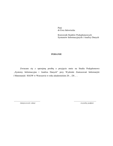 Pani dr Ewa Jałowiecka Kierownik Studiów Podyplomowych Systemów Informacyjnych i Analizy Danych PODANIE Zwracam się z uprzejmą prośbą o przyjęcie mnie na Studia Podyplomowe „Systemy Informacyjne i Analiza Danych” przy Wydziale Zastosowań Informatyki i Matematyki SGGW w Warszawie w roku akademickim 20…/20… . .............................................. (miejscowość, data) ....................................... (czytelny podpis)