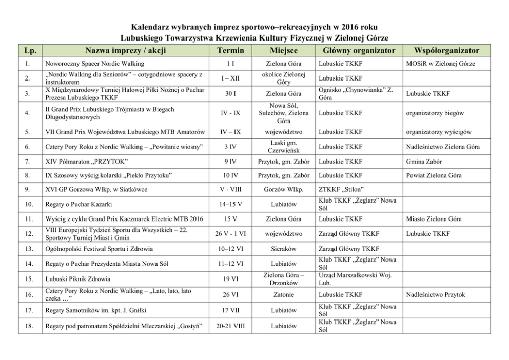 Lp. 1. 2. 3. Kalendarz wybranych imprez sportowo–rekreacyjnych w 2016 roku Lubuskiego Towarzystwa Krzewienia Kultury Fizycznej w Zielonej Górze Nazwa imprezy / akcji Termin Miejsce Główny organizator Noworoczny Spacer Nordic Walking „Nordic Walking dla Seniorów” – cotygodniowe spacery z instruktorem X Międzynarodowy Turniej Halowej Piłki Nożnej o Puchar Prezesa Lubuskiego TKKF 1I Zielona Góra Lubuskie TKKF I – XII okolice Zielonej Góry Lubuskie TKKF 30 I Zielona Góra Współorganizator MOSiR w Zielonej Górze Ognisko „Chynowianka” Z. Góra Lubuskie TKKF 4. II Grand Prix Lubuskiego Trójmiasta w Biegach Długodystansowych IV - IX Nowa Sól, Sulechów, Zielona Góra Lubuskie TKKF organizatorzy biegów 5. VII Grand Prix Województwa Lubuskiego MTB Amatorów IV – IX województwo Lubuskie TKKF organizatorzy wyścigów 6. Cztery Pory Roku z Nordic Walking – „Powitanie wiosny” 3 IV Laski gm. Czerwieńsk Lubuskie TKKF Nadleśnictwo Zielona Góra 7. XIV Półmaraton „PRZYTOK” 9 IV Przytok, gm. Zabór Lubuskie TKKF Gmina Zabór 8. IX Szosowy wyścig kolarski „Piekło Przytoku” 10 IV Przytok, gm. Zabór Lubuskie TKKF Powiat Zielona Góra 9. XVI GP Gorzowa Wlkp. w Siatkówce V - VIII Gorzów Wlkp. ZTKKF „Stilon” 10. Regaty o Puchar Kazarki 14–15 V Lubiatów 11. Wyścig z cyklu Grand Prix Kaczmarek Electric MTB 2016 15 V Zielona Góra Lubuskie TKKF Miasto Zielona Góra 12. VIII Europejski Tydzień Sportu dla Wszystkich – 22. Sportowy Turniej Miast i Gmin 26 V - 1 VI województwo Zarząd Główny TKKF Lubuskie TKKF 13. Ogólnopolski Festiwal Sportu i Zdrowia 10–12 VI Sieraków Zarząd Główny TKKF 14. Regaty o Puchar Prezydenta Miasta Nowa Sól 11–12 VI Lubiatów 15. Lubuski Piknik Zdrowia 19 VI Zielona Góra – Drzonków 16. Cztery Pory Roku z Nordic Walking – „Lato, lato, lato czeka …” 26 VI Zatonie 17. Regaty Samotników im. kpt. J. Gniłki 17 VII Lubiatów 18. Regaty pod patronatem Spółdzielni Mleczarskiej „Gostyń” 20-21 VIII Lubiatów Klub TKKF „Żeglarz” Nowa Sól Klub TKKF „Żeglarz” Nowa Sól Urząd Marszałkowski Woj. Lub. Lubuskie TKKF Klub TKKF „Żeglarz” Nowa Sól Klub TKKF „Żeglarz” Nowa Sól Nadleśnictwo Przytok 19. XI Dziesiątka Lasów Bogdanieckich Ognisko „Zbyszko” Nadleśnictwo Bogdaniec 20. Zielona Góra Lubuskie TKKF Miasto Zielona Góra 3 IX Zielona Góra Lubuskie TKKF Miasto Zielona Góra 3 IX Zielona Góra 10–11 IX Lubiatów II Otwarte Mistrzostwa Zielonej Góry MTB Amatorów 25 IX Przytok gm. Zabór Lubuskie TKKF Miasto Zielona Góra 25. Cztery Pory Roku z Nordic Walking – „Barwy jesieni” 2X Bobrowniki Lubuskie TKKF Nadleśnictwo Przytok 26. Cztery Pory Roku z Nordic Walking – „My się zimy nie boimy” 18 XII do ustalenia Lubuskie TKKF Nadleśnictwo Zielona Góra 27 VIII Bogdaniec 31.Winobraniowy Bieg Bachusa 3 IX 21. II Winobraniowy Marsz Nordic Walking 22. VII Drużynowy Bieg Winobraniowy o Puchar LOTTO 23. Regaty o Puchar Prezesa Klubu TKKF „Żeglarz” 24. Totalizator Sportowy Oddział Zielona Góra Klub TKKF „Żeglarz” Nowa Sól Lubuskie TKKF