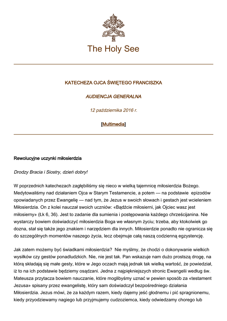 The Holy See KATECHEZA OJCA ŚWIĘTEGO FRANCISZKA AUDIENCJA GENERALNA 12 października 2016 r. [Multimedia] Rewolucyjne uczynki miłosierdzia Drodzy Bracia i Siostry, dzień dobry! W poprzednich katechezach zagłębiliśmy się nieco w wielką tajemnicę miłosierdzia Bożego. Medytowaliśmy nad działaniem Ojca w Starym Testamencie, a potem — na podstawie epizodów opowiadanych przez Ewangelię — nad tym, że Jezus w swoich słowach i gestach jest wcieleniem Miłosierdzia. On z kolei nauczał swoich uczniów: «Bądźcie miłosierni, jak Ojciec wasz jest miłosierny» (Łk 6, 36). Jest to zadanie dla sumienia i postępowania każdego chrześcijanina. Nie wystarczy bowiem doświadczyć miłosierdzia Boga we własnym życiu; trzeba, aby ktokolwiek go dozna, stał się także jego znakiem i narzędziem dla innych. Miłosierdzie ponadto nie ogranicza się do szczególnych momentów naszego życia, lecz obejmuje całą naszą codzienną egzystencję. Jak zatem możemy być świadkami miłosierdzia? Nie myślmy, że chodzi o dokonywanie wielkich wysiłków czy gestów ponadludzkich. Nie, nie jest tak. Pan wskazuje nam dużo prostszą drogę, na którą składają się małe gesty, które w Jego oczach mają jednak tak wielką wartość, że powiedział, iż to na ich podstawie będziemy osądzani. Jedna z najpiękniejszych stronic Ewangelii według św. Mateusza przytacza bowiem nauczanie, które moglibyśmy uznać w pewien sposób za «testament Jezusa» spisany przez ewangelistę, który sam doświadczył bezpośredniego działania Miłosierdzia. Jezus mówi, że za każdym razem, kiedy dajemy jeść głodnemu i pić spragnionemu, kiedy przyodziewamy nagiego lub przyjmujemy cudzoziemca, kiedy odwiedzamy chorego lub 2 więźnia, czynimy to Jemu (por. Mt 25, 31-46). Kościół nazwał te gesty «uczynkami miłosierdzia względem ciała», ponieważ są one pomaganiem osobom w zaspokajaniu ich potrzeb materialnych. Jest też jednak siedem innych uczynków miłosierdzia tzw. względem duszy, które odnoszą się do innych potrzeb, równie ważnych, zwłaszcza dzisiaj, ponieważ dotyczą życia wewnętrznego osób i często powodują większe cierpienie. Wszyscy z pewnością pamiętamy jedno z nich: «Krzywdy cierpliwie znosić», w wersji włoskiej jest to wyrażenie, które weszło do języka potocznego: «Cierpliwie znosić osoby naprzykrzające się». A są takie, jest bardzo wiele osób naprzykrzających się! Mogłoby się wydawać, że jest to rzecz mało ważna, wywołująca uśmiech, a tymczasem wyraża uczucie głębokiej miłości bliźniego; podobnie jak pozostałych sześć, które warto przypomnieć: wątpiącym dobrze radzić, nieumiejących pouczać, grzeszących upominać, strapionych pocieszać, urazy chętnie darować, modlić się za żywych i umarłych. Są to rzeczy codzienne! «Jestem strapiony...» — «Ależ Bóg ci pomoże, nie mam czasu...» Nie! Przystaję, słucham, tracę czas i go pocieszam, jest to gest miłosierdzia i czynimy to nie tylko dla tej osoby, czynimy to dla Jezusa! W najbliższych katechezach omówimy te uczynki, które Kościół przedstawia jako konkretne sposoby życia miłosierdziem. Na przestrzeni wieków wiele prostych osób stosowało je w praktyce, dając w ten sposób autentyczne świadectwo wiary. Kościół zresztą, wierny swemu Panu, żywi do najsłabszych miłość preferencyjną. Są to często osoby nam najbliższe, które potrzebują naszej pomocy. Nie musimy szukać nie wiadomo jakich akcji do przeprowadzenia. Lepiej zacząć od rzeczy najprostszych, które Pan wskazuje nam jako najpilniejsze. W świecie zaatakowanym niestety przez wirusa obojętności uczynki miłosierdzia są najlepszym antidotum. Wychowują nas bowiem do wrażliwości na podstawowe potrzeby naszych «braci najmniejszych» (Mt 25, 40), w których jest obecny Jezus. Jezus jest tam zawsze obecny. Tam, gdzie jest potrzeba, osoba potrzebująca, zarówno w sensie materialnym, jak duchowym. Tam jest Jezus. Rozpoznanie Jego oblicza w tym, kto jest w potrzebie, jest prawdziwym wyzwaniem rzuconym obojętności. Pozwala nam zachować zawsze czujność, by uniknąć, że Jezus przejdzie obok nas, a my Go nie rozpoznamy. Nasuwają się słowa św.Augustyna: «Timeo Iesum transeuntem» (Serm., 88, 14, 13), «boję się, że Jezus przejdzie» i że Go nie rozpoznam, że Pan przejdzie obok mnie w jednej z tych osób najmniejszych, potrzebujących, a ja nie zauważę, że to Jezus. Boję się, że Pan przejdzie, a ja go nie rozpoznam! Zadałem sobie pytanie, dlaczego św. Augustyn powiedział, że boi się przejścia Jezusa. Odpowiedź jest, niestety, w naszym postępowaniu: bo często jesteśmy roztargnieni, obojętni, i kiedy Pan przechodzi obok nas, tracimy okazję do spotkania z Nim. Uczynki miłosierdzia budzą w nas potrzebę i zdolność, by za sprawą miłości wiara stawała się żywa i owocna. Jestem przekonany, że poprzez te proste, codzienne gesty, możemy dokonać prawdziwej rewolucji kulturalnej, jak w przeszłości. Jeśli każdy z nas codziennie dokona jednego z nich, będzie to prawdziwa rewolucja w świecie! Ale wszyscy, każdy z nas. Iluż świętych dzisiaj jeszcze się wspomina nie ze względu na wielkie dzieła, które zrealizowali, ale na miłość, którą 3 potrafili przekazywać! Pomyślmy o Matce Teresie, niedawno kanonizowanej: nie pamiętamy o niej ze względu na liczne domy, które otworzyła na całym świecie, ale dlatego, że pochylała się nad każdą osobą, która znalazła się na ulicy, by jej przywrócić godność. Ileż opuszczonych dzieci wzięła na ręce; iluż konających odprowadziła na próg wieczności, trzymając ich za rękę! Te uczynki miłosierdzia są rysami Oblicza Jezusa Chrystusa, który bierze pod swoją opiekę najmniejszych braci, by każdemu z nich wyrazić czułość i bliskość Boga. Niech Duch Święty nam pomaga, niech Duch Święty zapali w nas pragnienie życia w takim stylu: czyniąc codziennie co najmn