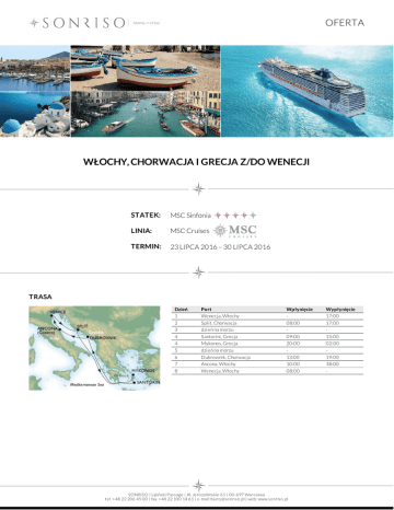 OFERTA WŁOCHY, CHORWACJA I GRECJA Z/DO WENECJI STATEK: MSC Sinfonia LINIA: MSC Cruises TERMIN: 23 LIPCA 2016 – 30 LIPCA 2016 TRASA Dzień 1 2 3 4 4 5 6 7 8 Port Wenecja, Włochy Split, Chorwacja dzień na morzu Santorini, Grecja Mykonos, Grecja dzień na morzu Dubrownik, Chorwacja Ancona, Włochy Wenecja, Włochy Wpłynięcie 08:00 09:00 20:00 13:00 10:00 08:00 SONRISO | Lipiński Passage | Al. Jero zo limskie 61 | 00-697 Warszawa tel. +48 22 206 45 00 | fax. +48 22 100 14 61 | e-mail: biuro @so nriso .pl | web: www.so nriso .pl Wypłynięcie 17:00 17:00 15:00 02:00 19:00 18:00 - OFERTA CENA Typ kabiny Kabina wewnętrzna Kabina z oknem Cena z osobę od 779 EUR od 879 EUR Kabina z balkonem od 1 109 EUR Apartament z balkonem od 1 259 EUR CENA ZAWIERA DOTATKOWE OPŁATY zakwaterowanie w 2 - os. kabinie wybranej kategorii pełne wyżywienie: 3 posiłki, przekąski między posiłakmi, bufet o północy napoje: woda stołowa, kawa, herbata oraz sok do śniadania dostępne 24 h w restauracji bufetowej oraz w restauracji głównej wyłącznie podczas śniadań serwis bagażowy podczas wejścia i zejścia ze statku 24 godzinny serwis kabinowy korzystanie z urządzeń sportowo - rekreacyjnych dostępnych na pokładzie (baseny, jacuzzi, boiska sportowe, kluby dla dzieci i młodzieży itp.) udział we wszystkich imprezach organizowanych na pokładzie (przedstawienia, pokazy, aukcje, animacje i inne) dojazd/przelot do portu rozpoczęcia i zakończenia rejsu transfery (lotnisko - port - lotnisko) ewentualne noclegi przed lub po rejsie wycieczki fakultatywne napoje: bezalkoholowe, alkoholowe, woda mineralna dostępne w restauracjach i barach (istnieje możliwość wykupienia pakietów napojów, o szczegóły zapytaj w biurze) korzystanie z mini baru w kabinie korzystanie z usług typu: SPA, salon piękności, pralnia itp. wydatki osobiste tj. zakupy w butikach, internet, kasyno itp. obowiązkowe opłaty portowe obowiązkowa opłata serwisowa (napiwki dla obsługi statku ok.8,5 EUR/os. dorosła/dzień, dzieci poniżej 3 lat nie płacą) obowiązkowe ubezpieczenie turystyczne koszt wymaganych wiz ewentualna opłata paliwowa (linia w momencie wzrotu cen ropy zastrzega sobie prawo do dodania oplaty paliwowej do każdej rezerwacji) Na życzenie świadczymy dodatkowo usługi: rezerwacje hotelowe na całym świecie rezerwacje biletów lotniczych, trasferów oraz parkingu w porcie rezerwacje wycieczek fakultatywnych i innych atrakcji SONRISO | Lipiński Passage | Al. Jero zo limskie 61 | 00-697 Warszawa tel. +48 22 206 45 00 | fax. +48 22 100 14 61 | e-mail: biuro @so nriso .pl | web: www.so nriso .pl