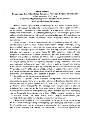 STANOWISKO Okrqgowego Zjazdu t6dzkiego Delegat6w Polskiego Zwiqzku Dzialkowc6w z dnia 5 czerwca 201-5 roku w sprawie integracji Srodowiska dziafkowc6w i jedno5ci ruchu ogrodnictwa dziaf kowego Historia ruchu ogrodnictwa dzialkowego to nie tylko budowa nowych i rozw6j istniejqcych ogrod6w ale r6wnie2 nieustanna walka o jego przysztoSi, samorzqdno6i, wielopokoleniowy dorobek i osiqgniecia. Tylko integracja 5rodowiska dzialkowc6w, ich jedno6i ijednomy6lno6i dziatania jest gwarantem dalszego istnienia i rozwoju rodzinnych ogrod6w dziafowych. Gdy dziatkowcy sq razem zjednoczeni wobec wsp6lnych cel6w osiqgniqte efekty sq trwale iwymierne. Nowa ustawa o ROD to niewqtpliwie olbrzymi sukces wszystkich polskich dzialkowc6w, w tym w du2ej mierze dziafkowc6w z okrqgu t6dzkiego, kt6rzy razem podjqli skuteczne dziaiania aby bronit swoje ogrody. Mimo trudnoici i atak6w z zewnatrz pozostali razem inie dali siq podzielii. Wyrazem tej jednoSci byto zebranie w catym kraju 924 801 podpis6w zlo2onych pod projektem obywatelskim ustawy o rodzinnych ogrodach dzialkowych. W okrqgu l6dzkim tych podpis6w zebrano a2 74035. Projekt uzyskal szerokie poparcie zar6wno samych dziatkowc6w jak i innych 6rodowisk, w tym skupisk miejskich, w kt6rych ogrody dziatkowe odgrywajq szczeg6lnq rolg i znaczenie. Wyrazem o96lnopolskiej solidarnoSci bylo: 100 tysiqcy e-maili wystanych do post6w isenator6w z internetowej aplikacji dostqpnej na stronie Komitetu Inicjatywy Ustawodawczej Projektu Ustawy o ROD, 15 tysiqcy uczestnik6w og6lnopolskiej manifestacji dzialkowc6w, kilkadziesiqt pikiet dziafkowc6w pod biurami posi6w Platformy Obywatelskiej, setki spotkari z poslami i senatorami oraz ponad 5 tysiqcy zbiorowych list6w, stanowisk i apeli. W dniu 13 grudnia 2013r. wsp6lna, zintegrowana walka dzialkowc6w zaowocowala przyjqciem przez post6w, niemal jednogloSnie (dw6ch posl6w wstrzymalo siq od glosu) ustawy o ROD, kt6ra ju2 po piqciu dniach zostata podpisana przez Prezydenta RP, koriczqc tym samym walkq i starania dziaikowc6w o nowe prawa dla ROD. Wsp6lnym wysilkiem i zaanga2owaniem wypracowano dokument zabezpieczajqcy prawa dziatkowc6w oraz realizujqcy wyrok Trybunatu Konstytucyjnego z lipca 2Ot2r. Ustawa weszia w 2ycie 1-9 stycznia 2Ot4r., na mocy kt6rej Polski Zwiqzek Dziatkowc6w jako o96lnopolska orga nizacja stat siq stowarzyszeniem ogrodowym. Skuteczno6i dziafa6 w obronie ogrod6w dziatkowych i praw dziatkowc6w to efekt silnej izintegrowanej samorzqdnej organizacji jakq jest Polski Zwiqzek Dziatkowc6w, kt6ry zawsze jest otwarty na potrzeby i oczekiwania dziatkowc6w jak r6wnie2 gotowy do obrony ich interes6w i dziedzictwa ogrodnictwa dzialkowego. Swiadczy o tym kolejna walka jaka zostata podjqta w obronie altan dziaikowych. Stojqc przed problemem likwidacji blisko 900 tysiecy altan Zwiqzek i dzialkowcy po raz kolejny siq zjednoczyli i pokazali jaka tkwi w nich sita. Krajowa Rada PZD zainicjowala opracowanie obywatelskiego projektu ustawy o zmianie ustawy Prawo budowlane. W dniu 26 czerwca 20L4r. powofano Komitet Inicjatywy Ustawodawczej,,STOP ROZBIORKOM ALTAN". Wsp6lnymi staraniami i wysitkiem zebrano 700 tysiqcy podpis6w poparcia pod obywatelskim projektem, z czego okrqg t6dzki przekazat 53 849 podpisow. Dzialkowcy nie ustawali w walce o zachowanie swoich altan Slqc setki list6w w tej sprawie do post6w, Prezesa Rady Ministr6w oraz Marszalka Sejmu. Po wielomiesiqcznych pracach i staraniach dziatkowcy i Zwiqzek Swiqtowali nastqpny wielki sukces. Sejm uchwalil ustawq, kt6ra zabezpiecza altany dzialkowe przed rozbi6rkq. Dzieri 2 kwietnia 2015 roku, tj. podpisania przez Prezydenta RP obywatelskiego projektu ustawy o zmianie ustawy Prawo budowlane na dlugo zapisze sig w historii ogrodnictwa dzialkowego. Dziatkowcy nie muszq siq jui martwii o dalsze istnienie swoich altan. Pokazali jaka tkwi w nich niespotykana w dzisiejszych czasach solidarno5i i jedno5i, dajqc tym samym dow6d na to, 2e idea ogrodnictwa dzialkowego jest wciq2 iywa, a ogrody sE wciqZ potrzebne spoleczeristwu. Osiqgniqte cele Swiadczq o tym, 2e gdy dzialamy razem, wsp6lnie, przekonani o slusznoSci idei za kt6re walczymy stanowimy powa2ny i liczqcy siq ruch. Tylko przynale2no5i do silnego stowarzyszenia jakim jest Polski ZwiEzek Dziatkowc6w daje szansq i pozwala na dalszy rozw6j i kultywowanie ruchu ogrodnictwa dzialkowego. Uczestnicy Okrqgowego 71azdu Lodzkiego Delegat6w PZD apelujq o dalszq integracjq 6rodowiska dziatkowc6w, jedno3i ruchu ogrodnictwa dzialkowego i wsp6lpracq wszystkich struktur Zwiqzku. To najcenniejsze wartoici, o kt6re trzeba dbai i zabiegai, gdy2 tylko to daje nam sitq do skutecznej obrony przed atakami. Dziaiajmy razem na rzecz umacniania pozytywnego wizerunku Twiqzku, promowania ogrod6w jako miejsc przyjaznych nie tylko dzialkowcom iich rodzinom, ale tak2e szerszemu krqgowi spoteczeristwa. Ponad stuletnia tradycja ogrodnictwa dzialkowego to powody do dumy iargumenty 5wiadczqce o naszym dorobku iwktadzie w budowq spoleczefstwa obywatelskiego w Polsce. OKREGOWY ZJAZD LODZKI DELEGATOW PZD LodZ, dnia 5 czerwca 2015 roku
