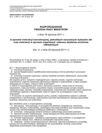 ROZPORZĄDZENIE PREZESA RADY MINISTRÓW z dnia 18 stycznia 2011 r. w sprawie instrukcji kancelaryjnej, jednolitych rzeczowych wykazów akt oraz instrukcji w sprawie organizacji i zakresu działania archiwów zakładowych D.U. z 2011 r. Nr 14 poz. 67 -1- Opracowano na podstawie: D.U. z 2011 r. Nr 14 poz. 67 ROZPORZĄDZENIE PREZESA RADY MINISTRÓW z dnia 18 stycznia 2011 r. w sprawie instrukcji kancelaryjnej, jednolitych rzeczowych wykazów akt oraz instrukcji w sprawie organizacji i zakresu działania archiwów zakładowych (Dz. U. z dnia 20 stycznia 2011 r.) Na podstawie art. 6 ust. 2b ustawy z dnia 14 lipca 1983 r. o narodowym zasobie archiwalnym i archiwach (Dz. U. z 2006 r. Nr 97, poz. 673, z późn. zm.1)) zarządza się, co następuje: § 1. 1. Rozporządzenie określa: 1) instrukcję kancelaryjną, 2) sposób klasyfikowania i kwalifikowania dokumentacji w formie jednolitych rzeczowych wykazów akt, 3) instrukcję w sprawie organizacji i zakresu działania archiwów zakładowych, zwaną dalej "instrukcją archiwalną", dla organów gminy i związków międzygminnych, organów powiatu, organów samorządu województwa i organów zespolonej administracji rządowej w województwie, a także urzędów obsługujących te organy, zwanych dalej "podmiotami". 2. Ilekroć w rozporządzeniu jest mowa o kierowniku podmiotu, należy przez to rozumieć, odpowiednio, wójta (burmistrza, prezydenta miasta), przewodniczącego zarządu związku międzygminnego, starostę, marszałka województwa, wojewodę oraz pozostałe organy zespolonej administracji rządowej w województwie, jeżeli te organy nie są obsługiwane przez urząd wojewódzki. 3. W stosunku do organów stanowiących gminy, powiatu i województwa zadania w zakresie postępowania z dokumentacją i wykonywania czynności kancelaryjnych realizują odpowiednie podmioty i kierownicy tych podmiotów. § 2. Określenia użyte w rozporządzeniu oznaczają: 1) akta sprawy - dokumentację, w szczególności tekstową, fotograficzną, rysunkową, dźwiękową, filmową, multimedialną, zawierającą informacje potrzebne przy rozpatrywaniu danej sprawy oraz odzwierciedlającą przebieg jej załatwiania i rozstrzygania; 2) archiwista - realizującego zadania archiwum zakładowego pracownika podmiotu; 3) kierownik komórki organizacyjnej - osobę kierującą komórką organizacyjną lub osobę upoważnioną do wykonywania jej zadań; 4) komórka organizacyjna - wydzieloną organizacyjnie część podmiotu, w szczególności wydział, dział, oddział, biuro, referat lub samodzielne stanowisko pracy; 5) metadane - zestaw usystematyzowanych informacji, logicznie powiązanych z przesyłką, sprawą lub inną dokumentacją, ułatwiających ich wyszukiwanie, kontrolę, zrozumienie i długotrwałe przechowanie oraz zarządzanie; ROZPORZĄDZENIE PREZESA RADY MINISTRÓW z dnia 18 stycznia 2011 r. w sprawie instrukcji kancelaryjnej, jednolitych rzeczowych wykazów akt oraz instrukcji w sprawie organizacji i zakresu działania archiwów zakładowych D.U. z 2011 r. Nr 14 poz. 67 -2- 6) odwzorowanie cyfrowe - dokument elektroniczny będący kopią elektroniczną dowolnej treści zapisanej w postaci innej niż elektroniczna, umożliwiający zapoznanie się z tą treścią i jej zrozumienie, bez konieczności bezpośredniego dostępu do pierwowzoru; 7) pismo - wyrażoną tekstem informację, stanowiącą odrębną całość znaczeniową, niezależnie od sposobu jej utrwalenia; 8) prowadzący sprawę - osobę załatwiającą merytorycznie daną sprawę, realizującą w tym zakresie przewidziane czynności kancelaryjne, w szczególności rejestrowanie sprawy, przygotowywanie projektów pism w sprawie, dbanie o terminowość załatwienia sprawy i kompletowanie akt sprawy; 9) przesyłka - dokumentację otrzymaną lub wysyłaną przez podmiot, w każdy możliwy sposób, w tym dokumenty elektroniczne przesyłane za pośrednictwem elektronicznej skrzynki podawczej, określonej w art. 3 pkt 17 ustawy z dnia 17 lutego 2005 r. o informatyzacji działalności podmiotów realizujących zadania publiczne (Dz. U. Nr 64, poz. 565, z późn. zm.2)); 10) skład chronologiczny - uporządkowany zbiór dokumentacji w postaci nieelektronicznej, w układzie wynikającym z kolejności wprowadzenia do systemu EZD, utworzony w podmiocie, w którym wprowadzono system EZD; 11) skład informatycznych nośników danych - uporządkowany zbiór informatycznych nośników danych zawierających dokumentację w postaci elektronicznej; 12) sprawa - zdarzenie lub stan rzeczy, w tym z zakresu postępowania administracyjnego, wymagające rozpatrzenia i podjęcia czynności służbowych lub przyjęcia do wiadomości; 13) system EZD - system teleinformatyczny do elektronicznego zarządzania dokumentacją umożliwiający wykonywanie w nim czynności kancelaryjnych, dokumentowanie przebiegu załatwiania spraw oraz gromadzenie i tworzenie dokumentów elektronicznych; 14) system tradycyjny - system wykonywania czynności kancelaryjnych, dokumentowania przebiegu załatwiania spraw, gromadzenia i tworzenia dokumentacji w postaci nieelektronicznej, z możliwością korzystania z narzędzi informatycznych do wspomagania procesu obiegu dokumentacji w tej postaci; 15) teczka aktowa - materiał biurowy używany w systemie tradycyjnym do przechowywania dokumentacji w postaci nieelektronicznej. § 3. Instrukcja kancelaryjna, określająca szczegółowe zasady i tryb wykonywania czynności kancelaryjnych w podmiotach, stanowi załącznik nr 1 do rozporządzenia. § 4. 1. Dokumentacja powstająca w podmiocie i do niego napływająca jest klasyfikowana i kwalifikowana na podstawie jednolitego rzeczowego wykazu akt, zwanego dalej "wykazem akt", przez oznaczanie, rejestrację i łączenie dokumentacji w akta spraw albo jej grupowanie jako dokumentacji nietworzącej akt spraw. 2. Wykaz akt dla: 1) organów gminy i związków międzygminnych oraz urzędów obsługujących te organy i związki stanowi załącznik nr 2 do