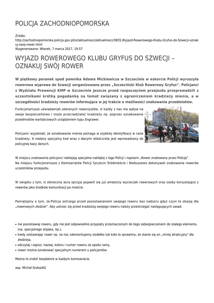 POLICJA ZACHODNIOPOMORSKA Źródło: http://zachodniopomorska.policja.gov.pl/sz/aktualnosci/aktualnosci/3655,Wyjazd-Rowerowego-Klubu-Gryfus-do-Szwecji-oznak uj-swoj-rower.html Wygenerowano: Wtorek, 7 marca 2017, 19:57 WYJAZD ROWEROWEGO KLUBU GRYFUS DO SZWECJI – OZNAKUJ SWÓJ ROWER W piątkowy poranek spod pomnika Adama Mickiewicza w Szczecinie w eskorcie Policji wyruszyła rowerowa wyprawa do Szwecji zorganizowana przez „Szczeciński Klub Rowerowy Gryfus”. Policjanci z Wydziału Prewencji KMP w Szczecinie jeszcze przed rozpoczęciem przejazdu przeprowadzili z uczestnikami krótką pogadankę na temat związany z ograniczeniem kradzieży mienia, a w szczególności kradzieży rowerów informujące w jej trakcie o możliwości znakowania przedmiotów. Funkcjonariusze uświadamiali zebranych rowerzystów, iż każdy z nas ma wpływ na swoje bezpieczeństwo i może przeciwdziałać kradzieży np. poprzez oznakowanie przedmiotów wartościowych urządzeniem typu Engrawer. Policjanci wyjaśniali, że oznakowanie mienia pomaga w szybkiej identyfikacji w razie kradzieży. A nadany specjalny kod wraz z danymi właściciela jest wprowadzany do policyjnej bazy danych. W miejscu znakowania policjanci naklejają specjalna naklejkę z logo Policji i napisem „Rower znakowany przez Policję”. Na miejscu funkcjonariusze z Komisariatów Policji Szczecin Śródmieście i Niebuszewo dokonywali znakowania rowerów uczestników przejazdu. W związku z tym, iż słoneczna aura sprzyja pojawili się już amatorzy wycieczek rowerowych oraz osoby korzystające z rowerów jako środków komunikacji po mieście. Pamiętajmy o tym, że:Policja ostrzega przed pozostawianiem swojego roweru bez nadzoru gdyż czyni to okazję dla „rowerowych złodziei”. Aby ustrzec się przed kradzieżą swojego roweru należy przestrzegać następujących zasad: ● nie pozostawiaj roweru, gdy nie jest odpowiednio przypięty przeznaczonym do tego zabezpieczeniem do stałego elementu (np. specjalnego stojaka, itp.), ● kiedy zostawiając rower np. na noc zdemontujemy siodełko lub koło to sprawimy, że stanie się on „mniej atrakcyjny" dla złodzieja, ● odczytaj i zapisz: nazwę, koloru i numer roweru ze spodu ramy, ● rower można oznakować specjalnym numerem u policjantów. Można to zrobić bezpłatnie w każdym komisariacie. asp. Michał Sroka/AG Ocena: 0/5 (0) Tweetnij