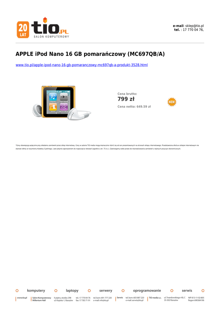 e-mail: [email protected] tel. : 17 770 04 76, APPLE iPod Nano 16 GB pomarańczowy (MC697QB/A) www.tio.pl/apple-ipod-nano-16-gb-pomaranczowy-mc697qb-a-produkt-3528.html Cena brutto: 799 zł Cena netto: 649.59 zł *Ceny obowiązują wyłącznie przy składaniu zamówień przez sklep internetowy. Ceny w salonie TiO media mogą nieznacznie różnić się od cen prezentowanych na stronach sklepu internetowego. Przedstawiona oferta w sklepie internetowym nie stanowi oferty w rozumieniu Kodeksu Cywilnego, i jest jedynie zaproszeniem do rozpoczęcia rokowań (zgodnie z art. 71 k.c.). Zastrzegamy sobie prawo do niezrealizowania zamówień z ważnych przyczyn ekonomicznych.