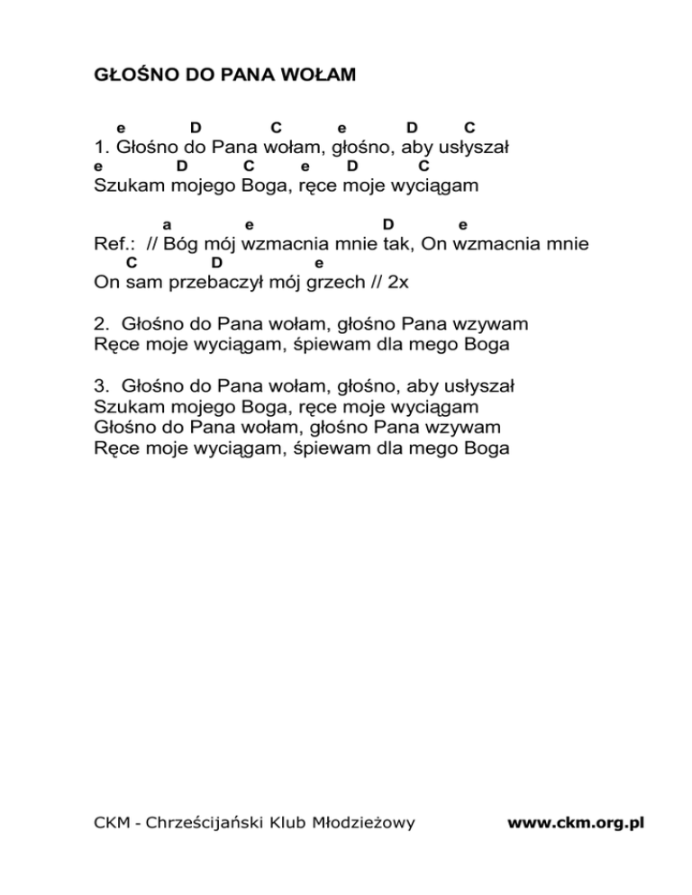 GŁOŚNO DO PANA WOŁAM e D C e D C 1. Głośno do Pana wołam, głośno, aby usłyszał e D C e D C Szukam mojego Boga, ręce moje wyciągam a e D e Ref.: // Bóg mój wzmacnia mnie tak, On wzmacnia mnie C D e On sam przebaczył mój grzech // 2x 2. Głośno do Pana wołam, głośno Pana wzywam Ręce moje wyciągam, śpiewam dla mego Boga 3. Głośno do Pana wołam, głośno, aby usłyszał Szukam mojego Boga, ręce moje wyciągam Głośno do Pana wołam, głośno Pana wzywam Ręce moje wyciągam, śpiewam dla mego Boga CKM - Chrześcijański Klub Młodzieżowy www.ckm.org.pl