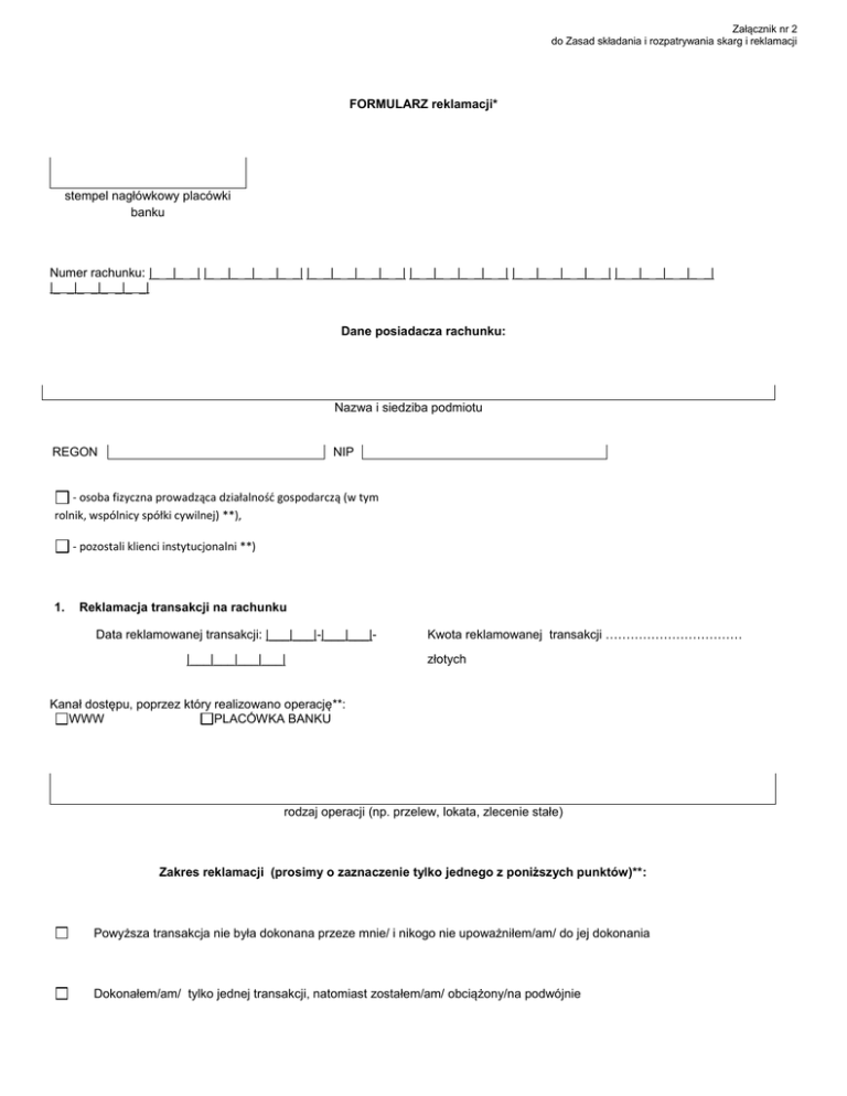 FORMULARZ reklamacji* stempel nagłówkowy placówki banku