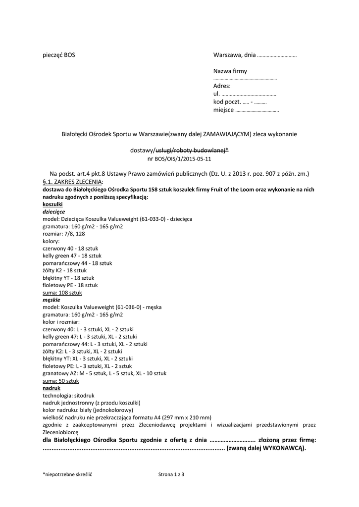pieczęć BOS Warszawa, dnia ............................. Nazwa firmy …………………………………………… Adres: ul. ........................................ kod poczt. ….. - ………. miejsce …………………………….. Białołęcki Ośrodek Sportu w Warszawie(zwany dalej ZAMAWIAJĄCYM) zleca wykonanie dostawy/usługi/roboty budowlanej* nr BOS/OIS/1/2015-05-11 Na podst. art.4 pkt.8 Ustawy Prawo zamówień publicznych (Dz. U. z 2013 r. poz. 907 z późn. zm.) §.1. ZAKRES ZLECENIA: dostawa do Białołęckiego Ośrodka Sportu 158 sztuk koszulek firmy Fruit of the Loom oraz wykonanie na nich nadruku zgodnych z poniższą specyfikacją: koszulki dziecięce model: Dziecięca Koszulka Valueweight (61-033-0) - dziecięca gramatura: 160 g/m2 - 165 g/m2 rozmiar: 7/8, 128 kolory: czerwony 40 - 18 sztuk kelly green 47 - 18 sztuk pomarańczowy 44 - 18 sztuk żółty K2 - 18 sztuk błękitny YT - 18 sztuk fioletowy PE - 18 sztuk suma: 108 sztuk męskie model: Koszulka Valueweight (61-036-0) - męska gramatura: 160 g/m2 - 165 g/m2 kolor i rozmiar: czerwony 40: L - 3 sztuki, XL - 2 sztuki kelly green 47: L - 3 sztuki, XL - 2 sztuki pomarańczowy 44: L - 3 sztuki, XL - 2 sztuki żółty K2: L - 3 sztuki, XL - 2 sztuki błękitny YT: XL - 3 sztuki, XL - 2 sztuki fioletowy PE: L - 3 sztuki, XL - 2 sztuk granatowy AZ: M - 5 sztuk, L - 5 sztuk, XL - 10 sztuk suma: 50 sztuk nadruk technologia: sitodruk nadruk jednostronny (z przodu koszulki) kolor nadruku: biały (jednokolorowy) wielkość nadruku nie przekraczająca formatu A4 (297 mm x 210 mm) zgodnie z zaakceptowanymi przez Zleceniodawcę projektami i wizualizacjami przedstawionymi przez Zleceniobiorcę dla Białołęckiego Ośrodka Sportu zgodnie z ofertą z dnia ……………………….. złożoną przez firmę: ....................................................................................................... (zwaną dalej WYKONAWCĄ). *niepotrzebne skreślić Strona 1 z 3 1. 1. 2. 3. 4. 5. 1. 1a. 1b. 1c. 2. 3. 4. Miejsce dostawy/usługi/roboty budowlanej*: Białołęcki Ośrodek Sportu, ul. Strumykowa 21, 03-138 Warszawa. §.2. GWARANCJA. 12 miesięcy od daty podpisania pokwitowania/protokołu odbioru*. §.3. TERMINY. termin wykonania dostawy/usługi/roboty budowlanej*: dzień powszedni*, do dnia 26 maja 2015 r. w godzinach: 8.00 - 16.00; termin płatności wynosi do 21 dni po wykonaniu dostawy/usługi/roboty budowlanej*, na podstawie pokwitowania/protokołu odbioru* oraz dostarczonej do Zamawiającego prawidłowo wystawionej faktury VAT; bieg terminu płatności liczony będzie od daty wpływu do siedziby Zamawiającego prawidłowo wystawionej faktury VAT; bieg terminu gwarancji liczony będzie od dnia podpisania przez Zamawiającego pokwitowania/protokołu odbioru* odbioru dostawy/usługi/roboty budowlanej*; prawidłowo wystawiona faktura powinna być dostarczona w terminie 7 dni od daty pokwitowania/protokołu odbioru. §.4. PŁATNOŚĆ. Uzgodnione łączne wynagrodzenie Wykonawcy nie przekroczy kwoty: brutto ................. zł (słownie: ........................zł); w tym netto ......... zł (słownie: ........................ zł); w tym podatek …… % VAT w wysokości ........... zł (słownie: .........................zł). Płatności będą dokonywane przelewem na konto Wykonawcy o numerze: ................................................................................................... Za termin zapłaty Strony uznają dzień, w którym Zamawiający polecił swojemu bankowi dokonanie przelewu wynagrodzenia Wykonawcy na jego konto bankowe wskazane na fakturze. Uzgodniona kwota wynagrodzenia obejmuje wszystkie czynności wykonane przez Wykonawcę osobiście lub przy pomocy osób trzecich oraz obejmuje koszt wszelkich użytych lub dostarczonych i zamontowanych oraz koniecznych do wykonania zlecenia materiałów i urządzeń. §.5. KARY UMOWNE. 1. Wykonawca zobowiązany jest do zachowania przy wykonywaniu zlecenia należytej staranności z uwzględnieniem zawodowego charakteru prowadzonej działalności. W wypadku niewykonania lub nienależytego wykonania zlecenia, Wykonawca zobowiązany jest do zapłaty na rzecz Zamawiającego kary umownej: 1 a. za odstąpienie od zlecenia przez Zamawiającego, z przyczyn, za które ponosi odpowiedzialność Wykonawca w wysokości 10 % ustalonego łącznego wynagrodzenia brutto; 1 b. za zwłokę w wykonaniu przedmiotu zlecenia przez Wykonawcę lub usunięciu wad ujawnionych w okresie gwarancji i rękojmi, w wysokości 0,2 % ustalonego łącznego wynagrodzenia brutto za każdy rozpoczęty dzień zwłoki; 2. Zamawiający może wyznaczyć Wykonawcy termin na usunięcie wad, po upływie którego zostaną naliczone kary za zwłokę. 3. Niezależnie od innych postanowień niniejszego paragrafu, Zamawiający ma prawo dochodzić od Wykonawcy odszkodowania przekraczającego wysokość zastrzeżonej kary umownej na zasadach ogólnych. §.6. DANE DO FAKTURY. Faktura będzie wystawiona na: Białołęcki Ośrodek Sportu, ul. Światowida 56, 03 -185 Warszawa, NIP: 524 – 25 – 28 – 517 *niepotrzebne skreślić Strona 2 z 3 §.7. POSTANOWIENIA KOŃCOWE. 1. „wersja dla osoby fizycznej nieprowadzącej działalności gospodarczej oraz dla osoby fizycznej prowadzącej działalność gospodarczą” 1) Zleceniobiorca/Wykonawca oświadcza, że znany jest mu fakt, iż treść niniejszej umowy, a w szczególności przedmiot umowy i wysokość wynagrodzenia, stanowią informację publiczną w rozumieniu art. 1 ust. 1 ustawy z dnia 6 września 2001 r. o dostępie do informacji publicznej (Dz. U. z 2014 r. poz.782), która podlega udostępnieniu w trybie przedmiotowej ustawy, z zastrzeżeniem ust. 2 (ewentualnie i ust. 3). Zleceniobiorca/Wykonawca wyraża zgodę na udostępnienie w trybie ustawy, o której mowa w ust. 1, zawartych w niniejszej umowie dotyczących go danych osobowych w zakresie obejmującym imię i nazwisko, a w przypadku prowadzenia działalności gospodarczej – rów