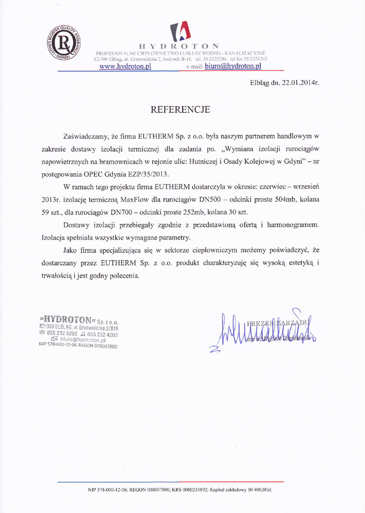 (ll HYDROTON PRoFEs.loNALNE CIEPŁOWNlcTwo l UsLUcI WoDNo 8]_}00 E]bląg' ul' Crunwt]ldzka:. budyn.k B-l8" lel- 55 23 _ KANĄLlZACYJ\E 2523ó . tcl l'ax 55'232,1202 Elbląg dn. 22.0I.20|4t. REFERENCJE Zaświadczany, że firma EUTHERM Sp. z o.o. była naszym partnerem handlowym w zakresie dostawy izolacji terrnicznej dla zadanta pn. ,,W}.łniana izolacji rurociągów napowietrznych na bramownicach w rejonie ulic: Hubriczej i Osady Kolejowej w Gdyni" - nr postęowania OPEC Gdynia EZP/35/20|3. W ramach tego projektu firma EUTHERM dostarczyła w okresie: czerwiec _ wrzesień Ż0|3t. izolaĄę termiczną MaxFlow dla rurociągów DN500 - odciŃi proste 504mb, kolana 59 szt., dla rurociągów DN700 _ odcinki proste 252mb, kolana 30 szt. Dostawy izolacji przebiegały zgodnie z przedstawioną ofertą i harmonograman. Izolacja spełniaławszystkie w1łnagane parametry. Jako firma specjalizująca się w sektorze ciąłowniczym możemy poświadczyć,że dostarczany przez EUTHERM Sp. z o.o. produkt charakteryzuję się wysoką estetyką i trwałościąi jest godny polecenia. "trlYBRSTON<< so. z o, o. EŻ-J00 ELBL4G' Ul' Gr!nWaldZka 2/B18 055 055 232 Ą202 332 52s6 g ot a bruro@hyd roton.Dl Nlp 57R_00n-17_06 ntcclł oodoozgnn Ntr 578_000_l2-0ó; REGoN 008007800; KRs 0000235892; Kapitał zakładowy 50 400'002ł.