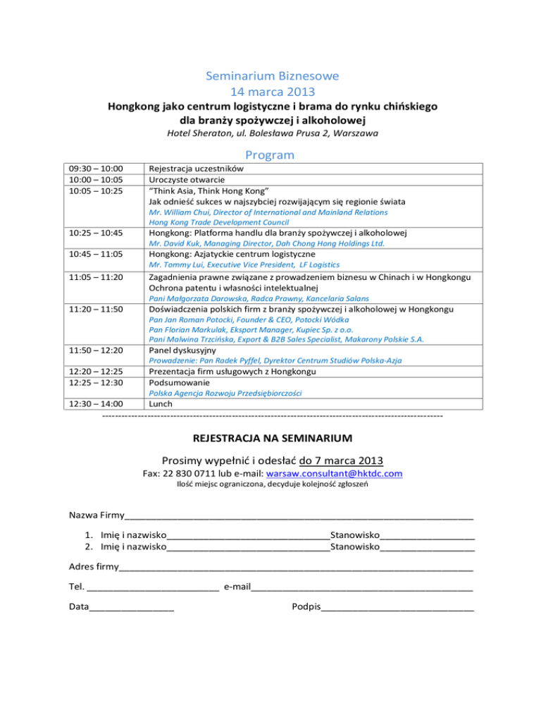 Seminarium Biznesowe 14 marca 2013 Hongkong jako centrum logistyczne i brama do rynku chińskiego dla branży spożywczej i alkoholowej Hotel Sheraton, ul. Bolesława Prusa 2, Warszawa Program 09:30 – 10:00 10:00 – 10:05 10:05 – 10:25 Rejestracja uczestników Uroczyste otwarcie “Think Asia, Think Hong Kong” Jak odnieść sukces w najszybciej rozwijającym się regionie świata Mr. William Chui, Director of International and Mainland Relations Hong Kong Trade Development Council 10:25 – 10:45 Hongkong: Platforma handlu dla branży spożywczej i alkoholowej Mr. David Kuk, Managing Director, Dah Chong Hong Holdings Ltd. 10:45 – 11:05 Hongkong: Azjatyckie centrum logistyczne Mr. Tommy Lui, Executive Vice President, LF Logistics 11:05 – 11:20 Zagadnienia prawne związane z prowadzeniem biznesu w Chinach i w Hongkongu Ochrona patentu i własności intelektualnej Pani Małgorzata Darowska, Radca Prawny, Kancelaria Salans 11:20 – 11:50 Doświadczenia polskich firm z branży spożywczej i alkoholowej w Hongkongu Pan Jan Roman Potocki, Founder & CEO, Potocki Wódka Pan Florian Markulak, Eksport Manager, Kupiec Sp. z o.o. Pani Malwina Trzcińska, Export & B2B Sales Specialist, Makarony Polskie S.A. 11:50 – 12:20 Panel dyskusyjny Prowadzenie: Pan Radek Pyffel, Dyrektor Centrum Studiów Polska-Azja 12:20 – 12:25 12:25 – 12:30 Prezentacja firm usługowych z Hongkongu Podsumowanie Polska Agencja Rozwoju Przedsiębiorczości 12:30 – 14:00 Lunch --------------------------------------------------------------------------------------------------------- REJESTRACJA NA SEMINARIUM Prosimy wypełnić i odesłać do 7 marca 2013 Fax: 22 830 0711 lub e-mail: [email protected] Ilość miejsc ograniczona, decyduje kolejność zgłoszeń Nazwa Firmy__________________________________________________________________ 1. Imię i nazwisko_______________________________Stanowisko__________________ 2. Imię i nazwisko_______________________________Stanowisko__________________ Adres firmy___________________________________________________________________ Tel. _________________________ e-mail__________________________________________ Data________________ Podpis_____________________________