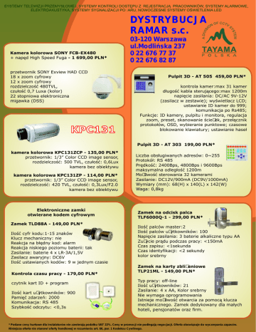 SYSTEMY TELEWIZJI PRZEMYSŁOWEJ, SYSTEMY KONTROLI DOSTĘPU Z REJESTRACJĄ PRACOWNIKÓW, SYSTEMY ALARMOWE, ELEKTROAKUSTYKA, SYSTEMY SYGNALIZACJI POŻARU, NOWOCZESNE SYSTEMY OŚWIETLENIA LED DYSTRYBUCJA RAMAR s.c. Kamera kolorowa SONY FCB-EX480 + napęd High Speed Fuga - 1 699,00 PLN* przetwornik SONY Exview HAD CCD 18 x zoom cyfrowy 12 x zoom cyfrowy rozdzielczość 480TVL, czułość 0,7 Luxa (kolor) 22 stopniowa elektroniczna migawka (DSS) KPC131 03-120 Warszawa ul.Modlińska 237 0 22 676 77 37 0 22 676 82 87 Pulpit 3D - AT 505 459,00 PLN* kontrola kamer:max 31 kamer długość kabla sterującego:max 1200m napięcie zasilania: DC/AC 9V-12V (zasilacz w zestawie); wyświetlacz LCD; ustawianie ID kamer do 999; komunikacja po Rs485; Funkcje: ID kamery, pulpitu i monitora, regulacja zoom, preset, skanowanie ścieżek, przełącznik protokołów, OSD, wybieranie punktowe; czasowe blokowanie klawiatury; ustawianie haseł Pulpit 3D - AT 303 199,00 PLN* kamera kolorowa KPC131ZCP - 135,00 PLN* przetwornik: 1/3” Color CCD image sensor, rozdzielczość: 500 TVL, czułość: 0,6Lux kamera bez obiektywu kamera kolorowa KPC131ZP - 114,00 PLN* przetwornik: 1/3” Color CCD image sensor, rozdzielczość: 420 TVL, czułość: 0,3Lux/F2.0 kamera bez obiektywu Elektroniczne zamki otwierane kodem cyfrowym Zamek TLD88A - 149,00 PLN* Ilość cyfr kodu:1-15 znaków Klucz mechaniczny: nie Reakcja na błędny kod: alarm Reakcja niskiego poziomu baterii: tak Zasilanie: baterie 4 x LR-3A/1,5V Zasilacz awaryjny: DC6V Ilość ustawianych kodów: 9 w jednym czasie Kontrola czasu pracy - 179,00 PLN* czytnik kart ID + program Ilość kart użytkowników: 900 Pamięć zdarzeń: 2000 Komunikacja: RS 485 Szybkość odczytu: <0,3s Liczba obsługiwanych adresów: 0~255 Protokół: RS 485 Prędkość: 2400Bps, 4800Bps i 9600Bps maksymalna odległość 1200m Możliwość sterowania 32 kamerami Zasilanie: DC12V/900mA (DC9V/1000mA) Wymiary (mm): 68(H) x 140(L) x 142(W) Waga: 0,8kg Zamek na odcisk palca TLF6000Q-1 - 299,00 PLN* Ilość palców master:2 Ilość palców użytkowników: 100 Napięcie zasilania: 3 baterie alkaliczne typu AA Zużycie prądu podczas pracy: <150mA Czas zapisu: <1sekunda Czas identyfikacji: <2 sekundy kolor srebrny Zamek na karty zbliżeniowe TLP21ML - 149,00 PLN* Typ pracy: off-line Ilość użytkowników: 21 Zasilanie: 4 x AA, Kolor srebrny Nie wymaga oprogramowania Istnieje możliwość otwarcia za pomocą klucza mechanicznego. Zamek dedykowany dla małych hoteli, pensjonatów oraz firm. * Podane ceny hurtowe dla instalatorów nie zawierają podatku VAT 22%. Ceny w promocji nie podlegają negocjacji. Oferta obowiązuje do wyczerpania zapasów. Niniejsza oferta nie stanowi oferty handlowej w rozumieniu art. 66, par. 1 Kodeksu Cywilnego.