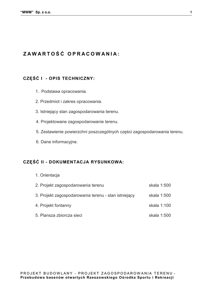 “MWM” Sp. z o.o. 1 ZAWARTOŚĆ OPRACOWANIA: CZĘŚĆ I - OPIS TECHNICZNY: 1. Podstawa opracowania. 2. Przedmiot i zakres opracowania. 3. Istniejący stan zagospodarowania terenu. 4. Projektowane zagospodarowanie terenu. 5. Zestawienie powierzchni poszczególnych części zagospodarowania terenu. 6. Dane informacyjne. CZĘŚĆ II - DOKUMENTACJA RYSUNKOWA: 1. Orientacja 2. Projekt zagospodarowania terenu skala 1:500 3. Projekt zagospodarowania terenu - stan istniejący skala 1:500 4. Projekt fontanny skala 1:100 5. Plansza zbiorcza sieci skala 1:500 PROJEKT BUDOW LANY - PROJEKT ZAGOSPODAROW ANIA TERENU Prz eb u d o w a b ase n ó w o t w ar t yc h R z es z o w ski eg o O ś ro d ka Sp o rt u i Rek rea cj i “MWM” Sp. z o.o. 2 CZĘŚĆ I - OPIS TECHNICZNY 1. P O DS T AW A O P RAC OW ANI A. - UMOWA NR P-8/2009/3800/10/09 ZAWARTA W DNIU 28 PAŹDZIERNIKA 2009 R. W RZESZOWIE POMIĘDZY GMINĄ MIASTO RZESZÓW - RZESZOWSKI OŚRODEK SPORTU I REKREACJI, A BIUREM PROJEKTÓW "MWM" SP. Z O.O. W GLIWICACH . - INWENTARYZACJA OBIEKTÓW BUDOWLANYCH KOMPLEKSU BASENÓW OTWARTYCH RZESZOWSKIEGO OŚRODKA SPORTU I REKREACJI OPRACOWANA PRZEZ BIURO PROJEKTÓW "MWM" SP. Z O.O. W GLIWICACH W LISTOPADZIE 2009 R. - EKSPERTYZA BUDOWLANA OBIEKTÓW BASENÓW OTWARTYCH RZESZOWSKIEGO OŚRODKA SPORTU I REKREACJI OPRACOWANA PRZEZ BIURO PROJEKTÓW "MWM" SP. Z O.O. W GLIWICACH W STYCZNIU 2010 R. KONCEPCJA ARCHITEKTONICZNA PRZEBUDOWY BASENÓW OTWARTYCH RZESZOWSKIEGO OŚRODKA SPORTU I REKREACJI OPRACOWANA PRZEZ BIURO PROJEKTÓW "MWM" SP. Z O.O. W GLIWICACH OPRACOWANA W STYCZNIU 2010 R ZATWIERDZONA PRZEZ INWESTORA. - AKTUALNA MAPA SYTUACYJNO - WYSOKOŚCIOWA DO CELÓW PROJEKTOWYCH W SKALI 1:500, OPRACOWANA PRZEZ UPRAWNIONEGO GEODETĘ Z AŁ Ą CZ N IK NR 1 - DOKUMENTACJA GEOLOGICZNO - INśYNIERSKA POD BUDOWĘ ZJEśDśALNI DO WODY PRZY BASENIE REKREACYJNYM ROSIR W RZESZOWIE OPRACOWANA PRZEZ UPRAWNIONEGO GEOLOGA TADEUSZA ŚLOŃSKIEGO, - USTAWA Z DNIA 07 LIPCA 1994 R. PRAWO BUDOWLANE – TEKST JEDNOLITY ( DZ. U. Z 2006 R. NR 156, POZ. 1118 Z PÓŹNIEJSZYMI ZMIANAMI), - ROZPORZĄDZENIE MINISTRA INFRASTRUKTURY Z DNIA 3 LIPCA 2003 R. SZCZEGÓŁOWEGO ZAKRESU I FORMY PROJEKTU BUDOWLANEGO ( DZ.U Z 2003 R, NR 120, POZ. 1133 Z PÓŹNIEJSZYMI ZMIANAMI ). W SPRAWIE - ROZPORZĄDZENIE MINISTRA INFRASTRUKTURY Z DNIA 12 KWIETNIA 2002 R. W SPRAWIE WARUNKÓW TECHNICZNYCH, JAKIM POWINNY ODPOWIADAĆ BUDYNKI I ICH USYTUOWANIE ( DZ.U NR 75, POZ. 690 Z PÓŹN. ZMIANAMI ). - OBOWIĄZUJĄCE PRZEPISY TECHNICZNO-BUDOWLANE, POLSKIE NORMY PRZYWOŁANE W ROZPORZĄDZENIACH. - DECYZJA PREZYDENTA MIASTA RZESZOWA L.DZ.SR.II-7624/40/09 Z DNIA 12 MARCA 2009 R UMARZAJĄCE JAKO BEZPRZEDMIOTOWE POSTĘPOWANIE W SPRAWIE WYDANIA DECYZJI O ŚRODOWISKOWYCH UWARUNKOWANIACH ZGODY NA REALIZACJĘ PRZEDSIĘWZIĘCIA PN. " PRZEBUDOWA BASENÓW BASENÓW OTWARTYCH ROSiR NA DZIAŁCE NR EWID. 869/17 W OBRĘBIE 207 PRZY KS.J. JAŁOWEGO 23a W RZESZOWIE. Z AŁ Ą CZ N IK NR 2 PROJEKT BUDOW LANY - PROJEKT ZAGOSPODAROW ANIA TERENU Prz eb u d o w a b ase n ó w o t w ar t yc h R z es z o w ski eg o O ś ro d ka Sp o rt u i Rek rea cj i “MWM” Sp. z o.o. 3 - WARUNKI TECHNICZNE PRZYŁĄCZENIA DO SIECI WODOCIĄGOWEJ I SIECI KANALIZACJI9 SANITARNEJ ORAZ SIECI KANALIZACJI DESZCZOWEJ ( PISMO L.DZ. TT - 401/112/2010 Z DNIA 4 LUTEGO 2010 R). Z AŁ Ą CZ N IK NR 3 2.PRZEDMIOT I ZAKRES OPRACOWANIA. Przedmiotem inwestycji jest przebudowa basenów otwartych Rzeszowskiego Ośrodka Sportu i Rekreacji w Rzeszowie przy ul. ks J. Jałowego 23a. Przebudowa dotyczy obiektów: Kompleksu basenów otwartych: - basen wyczynowy, - basen rekreacyjny, - brodzik dla dzieci, - brodzik dla przedszkolaków, - fontanna. Budynku szatniowego, Trybun, Tenisowej ściany treningowej. 3. I ST N IE J ĄC Y S T AN ZAG OS P OD ARO W AN I A D ZI AŁK I . Lokalizacja inwestycji: Rzeszów, ul. ks. J. Jałowego 23, działka nr 869/17 o powierzchni całkowitej 30.609 m2, obręb 207 - działka zabudowana, uzbrojona, zagospodarowana z elementami małej architektury i szatą roślinną. Istniejąca zabudowa działki: Budynek hotelow y: - obiekt wolnostojący, dwukondygnacyjny, przekryty stropodachem płaskim, - wymiary: długość: 56,0 m szerokość: 15,5 m wysokość: 7,5 m powierzchnia: 804,5 m2 PROJEKT BUDOW LANY - PROJEKT ZAGOSPODAROW ANIA TERENU Prz eb u d o w a b ase n ó w o t w ar t yc h R z es z o w ski eg o O ś ro d ka Sp o rt u i Rek rea cj i “MWM” Sp. z o.o. 4 Budynek hali sportow ej z łącznikiem: - obiekt powiązany łącznikiem z krytym basenem, częściowo podpiwniczony, dwukondygnacyjny, przekryty stropodachem płaskim, - wymiary: długość: szerokość: 41,4 m wysokość: 4,07 m powierzchnia: 102,5 m 1833,4 m2 Budynek krytego basenu: - obiekt powiązany łącznikiem z halą sportową, podpiwniczony, dwukondygnacyjny, przekryty stropodachem płaskim, - wymiary: długość: 51,86 m szerokość: 25,35m wysokość: 4,07 m powierzchnia: 1471,76 m2 Kompleksowa przebudowa stacji uzdatniania wody i wymiennikowni ciepła zlokalizowanych na podbaseniu w zapleczu technicznym krytego basenu zespołu basenów otwartych jest przedmiotem odrębnego opracowania. Budynek szatniow y: - obiekt wolnostojący, niepodpiwniczony, dwukondygnacyjny, przekryty stropodachem płaskim, - wymiary: długość: szerokość: 6,0 m wysokość: 7,5 m powierzchnia: 39,0 m 498,0 m2 Kompleks basenów otw artych: Basen w yczynow y: - wymiary Ŝelbetowej niecki basenowej: długość: 50,00 m szerokość: 22,46 m PROJEKT BUDOW LANY - PROJEKT ZAGOSPODAROW ANIA TERENU Prz eb u d o w a b ase n ó w o t w ar t yc h R z es z o w ski eg o O ś ro d ka Sp o rt u i Rek rea cj i “MWM” Sp. z o.o. 5 głębokość: od - 1,30 m do - 3,4 m 1122,70 m2 powierzchnia: Basen rekreacyjny: - wymiary Ŝelbetowej niecki basenowej: długość: 50,18 m szerokość: 20,85 m głębokość: od - 1,45 m do - 1,95 m 1001,0 m2 powierzchnia: - atrakcje wodne basenu: wieŜa, zjeŜdŜalnia rurowa, Basen dla dzieci: - wymiary Ŝelbetowej niecki basenowej: długość: ~ 25,00 m 