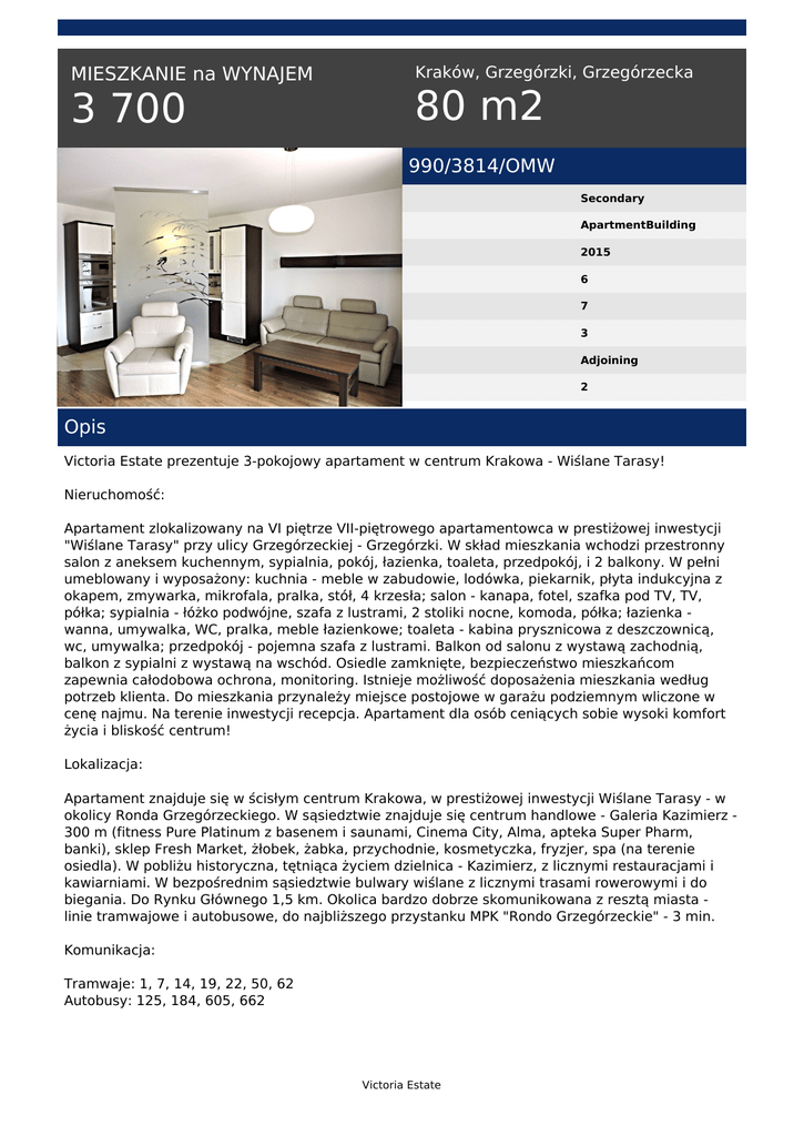 MIESZKANIE na WYNAJEM 3 700 Kraków, Grzegórzki, Grzegórzecka 80 m2 990/3814/OMW Secondary ApartmentBuilding 2015 6 7 3 Adjoining 2 Opis Victoria Estate prezentuje 3-pokojowy apartament w centrum Krakowa - Wiślane Tarasy! Nieruchomość: Apartament zlokalizowany na VI piętrze VII-piętrowego apartamentowca w prestiżowej inwestycji "Wiślane Tarasy" przy ulicy Grzegórzeckiej - Grzegórzki. W skład mieszkania wchodzi przestronny salon z aneksem kuchennym, sypialnia, pokój, łazienka, toaleta, przedpokój, i 2 balkony. W pełni umeblowany i wyposażony: kuchnia - meble w zabudowie, lodówka, piekarnik, płyta indukcyjna z okapem, zmywarka, mikrofala, pralka, stół, 4 krzesła; salon - kanapa, fotel, szafka pod TV, TV, półka; sypialnia - łóżko podwójne, szafa z lustrami, 2 stoliki nocne, komoda, półka; łazienka wanna, umywalka, WC, pralka, meble łazienkowe; toaleta - kabina prysznicowa z deszczownicą, wc, umywalka; przedpokój - pojemna szafa z lustrami. Balkon od salonu z wystawą zachodnią, balkon z sypialni z wystawą na wschód. Osiedle zamknięte, bezpieczeństwo mieszkańcom zapewnia całodobowa ochrona, monitoring. Istnieje możliwość doposażenia mieszkania według potrzeb klienta. Do mieszkania przynależy miejsce postojowe w garażu podziemnym wliczone w cenę najmu. Na terenie inwestycji recepcja. Apartament dla osób ceniących sobie wysoki komfort życia i bliskość centrum! Lokalizacja: Apartament znajduje się w ścisłym centrum Krakowa, w prestiżowej inwestycji Wiślane Tarasy - w okolicy Ronda Grzegórzeckiego. W sąsiedztwie znajduje się centrum handlowe - Galeria Kazimierz 300 m (fitness Pure Platinum z basenem i saunami, Cinema City, Alma, apteka Super Pharm, banki), sklep Fresh Market, żłobek, żabka, przychodnie, kosmetyczka, fryzjer, spa (na terenie osiedla). W pobliżu historyczna, tętniąca życiem dzielnica - Kazimierz, z licznymi restauracjami i kawiarniami. W bezpośrednim sąsiedztwie bulwary wiślane z licznymi trasami rowerowymi i do biegania. Do Rynku Głównego 1,5 km. Okolica bardzo dobrze skomunikowana z resztą miasta linie tramwajowe i autobusowe, do najbliższego przystanku MPK "Rondo Grzegórzeckie" - 3 min. Komunikacja: Tramwaje: 1, 7, 14, 19, 22, 50, 62 Autobusy: 125, 184, 605, 662 Victoria Estate Opłaty: 3700 zł najem + 600 zł czynsz + 150 prąd Serdecznie polecam i zapraszam do oglądania! Małgorzata Wicha tel. +48 511 560 721 email: [email protected] Victoria Estate Powered by TCPDF (www.tcpdf.org)