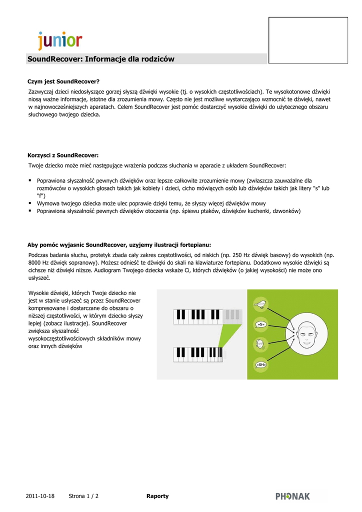 SoundRecover: Informacje dla rodziców Czym jest SoundRecover? Zazwyczaj dzieci niedosłyszące gorzej słyszą dźwięki wysokie (tj. o wysokich częstotliwościach). Te wysokotonowe dźwięki niosą ważne informacje, istotne dla zrozumienia mowy. Często nie jest możliwe wystarczająco wzmocnić te dźwięki, nawet w najnowocześniejszych aparatach. Celem SoundRecover jest pomóc dostarczyć wysokie dźwięki do użytecznego obszaru słuchowego twojego dziecka. Korzysci z SoundRecover: Twoje dziecko może mieć następujące wrażenia podczas słuchania w aparacie z układem SoundRecover: Poprawiona słyszalność pewnych dźwięków oraz lepsze całkowite zrozumienie mowy (zwłaszcza zauważalne dla rozmówców o wysokich głosach takich jak kobiety i dzieci, cicho mówiących osób lub dźwięków takich jak litery "s" lub "f") Wymowa twojego dziecka może ulec poprawie dzięki temu, że słyszy więcej dźwięków mowy Poprawiona słyszalność pewnych dźwięków otoczenia (np. śpiewu ptaków, dźwięków kuchenki, dzwonków) Aby pomóc wyjasnic SoundRecover, uzyjemy ilustracji fortepianu: Podczas badania słuchu, protetyk zbada cały zakres częstotliwości, od niskich (np. 250 Hz dźwięk basowy) do wysokich (np. 8000 Hz dźwięk sopranowy). Możesz odnieść te dźwięki do skali na klawiaturze fortepianu. Dodatkowo wysokie dźwięki są cichsze niż dźwięki niższe. Audiogram Twojego dziecka wskaże Ci, których dźwięków (o jakiej wysokości) nie może ono usłyszeć. Wysokie dźwięki, których Twoje dziecko nie jest w stanie usłyszeć są przez SoundRecover kompresowane i dostarczane do obszaru o niższej częstotliwości, w którym dziecko słyszy lepiej (zobacz ilustracje). SoundRecover zwiększa słyszalność wysokoczęstotliwościowych składników mowy oraz innych dźwięków 2011-10-18 Strona 1 / 2 Raporty SoundRecover: Informacje dla rodziców Posluchaj aparatu sluchowego z SoundRecover: Podczas odsłuchiwania aparatu z SoundRecover możesz zauważyć, że dźwięk brzmi inaczej w porównaniu do konwencjonalnych aparatów (np. głosy mogą brzmieć niżej). To jest normalny wynik działania przetwarzania SoundRecover i nie należy się tym martwic. Pamiętaj, że dla Twojego dziecka to przetwarzanie oznacza większe możliwości słyszenia dźwięków o częstotliwościach, których słyszenie wcześniej nie było możliwe. Czy dalsze regulacje aparatu(ów) mojego dziecka sa potrzebne? Podobnie jak z każdymi aparatami, regulacje mogą być czasami potrzebne. Jeśli twoje dziecko opisuje którykolwiek z poniżej wymienionych wrażeń, może być potrzebne precyzyjne strojenie funkcji SoundRecover: Niektóre dźwięki mowy mogą być trudne do rozróżnienia (np. "sz" i "s" wymawiane przez różne osoby mogą brzmieć jak seplenienie) W porównaniu do wcześniejszego sposobu wzmacniania, twoje dziecko zauważyło pogorszenie się jakości dla pewnych głosów, muzyki i/lub innych dźwięków Niektóre głosy lub dźwięki otoczenia mogą być przeszkadzające lub nienaturalnie brzmiące dla twojego dziecka Jeśli twoje dziecko jest bardzo małe lub jeśli z innych względów nie może powiedzieć ci jak słyszy w aparacie, nie martw się. Zamiast tego możesz zapisywać w dzienniku jak twoje dziecko reaguje na dźwięki a jeśli będziesz mieć jakiekolwiek obawy twój protetyk słuchu będzie mógł udzielić ci rady. To zupełnie normalne, że aparaty twojego dziecka wymagają okresowych regulacji aby pomóc mu przyzwyczaić się do nowego sposobu przetwarzania. SoundRecover zapewni twojemu dziecku dostęp do ważnych dźwięków mowy i otoczenia, których inaczej by nie słyszało. To będzie dla twojego dziecka nowe i ekscytujące doświadczenie! 2011-10-18 Strona 2 / 2 Raporty Ogólne informacje dla rodziców Ubytek słuchu a technologia wzmacniania: Przewodnik dla rodziców Osłabienie słuchu Jako rodzic dziecka, które ma ubytek słuchu, prawdopodobnie masz wiele pytań. Na szczęście Twoje dziecko żyje w czasach, w których technologia oferuje wiele doskonałych rozwiązań. Jest wiele powodów, abyś był zadowolony z tego, w jaki sposób można pomóc Twojemu dziecku wykorzystać pełen jego potencjał. Stopnie ubytku słuchu określa się jako lekki, średni, ciężki i głęboki. Istnieje związek pomiędzy ubytkiem słuchu określonym w decybelach a stopniem trudności w funkcjonowaniu. W tabeli poniżej znajdziesz zestawienie różnych stopni ubytków słuchu, poziomu w decybelach oraz przykłady dźwięków odpowiadających tym poziomom. Każdy poziom stawia różne wyzwania i wymaga różnego podejścia oraz technologicznych rozwiązań. Stopnie ubytków słuchu Stopień niedosłuchu Poziom w decybelach (HL) Przykład głośności dźwięku Możliwe wyzwania i potrzeby Słuch normalny Do 20 dB Szelest liści, tykanie zegara Niewiele problemów związanych ze słuchem. Minimalny/lekki ubytek słuchu 20 - 40dB Cicha/szeptana mowa, strzelanie palcami Możliwe problemy w słyszeniu cichych głosów. W zależności od tego gdzie w tym zakresie mieści się ubytek Twojego dziecka, może ono odnieść korzyści ze wzmocnienia lub może potrzebować dodatkowego wsparcia w szkole. Średni 40 - 60 dB Cicha/normalna konwersacja Powinno rozumieć konwersację jeśli jest blisko rozmowy i jest zwrócone twarzą do mówiącego. Będzie potrzebować aparatu słuchowego oraz może być potrzebne dodatkowe wsparcie w szkole (np.: FM/ miejsce w pierwszej ławce). FM może być również pomocny w domu. Średniociężki ubytek słuchu 60 - 75 dB Normalna/głośna mowa, dzwonek do drzwi Rozmowa musi być głośna. Z aparatem słuchowym odpowiednio zaprogramowanym będzie słyszalna normalnie głośna konwersacja. Dodatkowe wsparcie w szkole (np.: FM/ miejsce w pierwszej ławce) przyniesie wiele korzyści. FM może być również pomocny w domu. Ciężki ubytek słuchu 75 - 95 dB Dzwonek telefonu, grzmot, płaczące dziecko Może słyszeć głośną mowę z blis