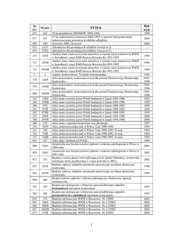 Nr ew. 672 Nr poz. TYTUŁ 262 10 lat działalności NFOŚiGW 1989-1999 25 lat implementacji konwencji EKG ONZ w sprawie transgranicznego zanieczyszczania powietrza na dalekie odległości. Activities 2003. Overview Alternatywa dla przodujących rolników (zeszyt nr 2). Alternatywa dla przodujących rolników (zeszyt nr 5). Analiza stanu zanieczyszczenia atmosfery w rejonie stacji pomiarowej WIOŚ w Suwałkach i stacji KMŚ Puszcza Borecka dla 1993-1995. Analiza stanu zanieczyszczenia atmosfery w rejonie stacji pomiarowej WIOŚ w Suwałkach i stacji KMŚ Puszcza Borecka dla 1993-1995. Analiza stanu zanieczyszczenia atmosfery w rejonie stacji pomiarowej WIOŚ w Suwałkach i stacji KMŚ Puszcza Borecka dla 1993-1995. Analizy środowiskowe. Techniki instrumentalne. Atlas posterunków wodowskazowych dla potrzeb Państwowego Monitoringu Środowiska. Atlas posterunków wodowskazowych dla potrzeb Państwowego Monitoringu Środowiska. Atlas posterunków wodowskazowych dla potrzeb Państwowego Monitoringu Środowiska. Atlas stanu czystości jezior Polski badanych w latach 1984-1988 Atlas stanu czystości jezior Polski badanych w latach 1984-1988 Atlas stanu czystości jezior Polski badanych w latach 1989-1993 Atlas stanu czystości jezior Polski badanych w latach 1989-1993 Atlas stanu czystości jezior Polski badanych w latach 1989-1993 Atlas stanu czystości jezior Polski badanych w latach 1994-1998 Atlas stanu czystości jezior Polski badanych w latach 1994-1998 Atlas stanu i zagrożeń środowiska woj. płockiego. Atlas zanieczyszczenia rzek w Polsce. Lata 1990-1992 Atlas zanieczyszczenia rzek w Polsce. Lata 1990-1992 II wyd. Atlas zanieczyszczenia rzek w Polsce. Lata 1990-1992 II wyd. Atlas zanieczyszczenia rzek w Polsce. Lata 1990-1992 II wyd. Atlas zdjęć satelitarnych Polski. Atomistyka oraz bezpieczeństwo jądrowe i ochrona radiologiczna w Polsce w 2000 roku. Atomistyka oraz bezpieczeństwo jądrowe i ochrona radiologiczna w Polsce w 2001 roku. Badania i ocena jakości wód wpływających do Zatoki Gdańskiej i środowiska morskiego strefy przybrzeżnej w czasie powodzi w 2001 r Badania wpływu zakładów przemysłu spożywczego na klimat akustyczny środowiska. Badania wpływu zakładów przemysłu spożywczego na klimat akustyczny środowiska. Bezpieczeństwo jądrowe i ochrona radiologiczna. Państwowa Agencja Atomistyczna. Bezpieczne ekologiczne i efektywne unieszkodliwianie odpadów komunalnych metodami termicznymi Bezpieczne ekologiczne i efektywne unieszkodliwianie odpadów przemysłowych i szpitalnych metodami termicznymi Biuletyn informacyjny WIOŚ w Rzeszowie Nr 1/2002 Biuletyn informacyjny WIOŚ w Rzeszowie Nr 2,3/2002 Biuletyn informacyjny WIOŚ w Rzeszowie Nr 2,3/2002 Biuletyn informacyjny WIOŚ w Rzeszowie Nr 2,3/2002 Biuletyn informacyjny WIOŚ w Rzeszowie Nr 4/2002 977 457 956 613 614 440 235/1 235/2 433 165/I 711 165/II 712 165/III 2 2 378 140/I 379 140/II 468 140/III 345 346 240 241 242 739 740 469 154 151 152 153 941 130/I 130/II 97/I 97/II 97/III 294/I 294/II 179 74/IV 74/I 74/II 74/III 427 800 326/1 828 326/2 872 373 655 245/I 656 245/II 989 468 763 303 762 302 816 855 856 857 873 335 366/I 366/II 366/III 374/I 1 Rok wyd. 1999 2004 2004 1996 1996 1996 1992 19951996 19951996 19951996 1992 1992 1995 1995 1995 2000 2000 1997 1993 1994 1994 1994 1995 2001 2002 2002 1996 1996 1997 1997 2002 2002 2002 2002 2003 874 949 950 746 747 748 827 902 903 653 654 782 785 374/II 434/I 434/II 296/II 296/III 296/IV 340 397 398 242/I 242/II 313 316 1010 482 933 419 78 49/I 79 49/II 80 49/III 799 325 761 301 63 44/I 768 44/II 957 470 471 992 441 180/I 180/II 471 788 319 898 395 988 467 43 34/I 769 34/II 699 278/I 700 278/II 616 237 786 317 1014 486 1000 475 890 366 387 135 Biuletyn informacyjny WIOŚ w Rzeszowie Nr 4/2002 Biuletyn Monitoringu Przyrody 1/2004 (5) Biuletyn Monitoringu Przyrody 1/2004 (5) Biuletyn monitoringu przyrody nr 1/2000 Biuletyn monitoringu przyrody nr 1/2000 Biuletyn monitoringu przyrody nr 1/2000 Biuletyn monitoringu przyrody nr 1/2001(2) Biuletyn monitoringu przyrody nr 1/2002(3) Biuletyn monitoringu przyrody nr 1/2003(4) Biuletyn Nr 4 - P K Ekologiczny Biuletyn Nr 4 - P K Ekologiczny Biuletyn ZOP LOP w Rzeszowie Nr1(8). Narodziny drzewa. Budowa bezpiecznych składowisk odpadów. Wisła – 1998 Budżet samorządu powiatowego gminnego jako instrument kształtowania lokalnej rzeczywistości. Powiat ropczycko-sędziszowski na tle powiatów sąsiednich. Charakterystyka wód granicznego odcinka rzeki Bug w latach 1990-1996. Charakterystyka występowania różnych form glinu w wybranych elementach środowiska w Polsce. Charakterystyka występowania różnych form glinu w wybranych elementach środowiska w Polsce. Charakterystyka występowania różnych form glinu w wybranych elementach środowiska w Polsce. Chronione obiekty przyrodnicze w woj. rzeszowskim. Degradacja środowiska przyrodniczego a zdrowie człowieka. Krajowy Kongres Ekologiczny – 1994 Dioksyny. Ocena zagrożeń środowiska naturalnego oraz metody ich wykrywania. Dioksyny. Ocena zagrożeń środowiska naturalnego oraz metody ich wykrywania. Dioxins in the Baltic Sea. Dobra praktyka laboratoryjna w analizie instrumentalnej. Dobra praktyka laboratoryjna w analizie instrumentalnej. Dostęp do informacji o środowisku a dostęp do informacji publicznej. Doświadczenia w przygotowaniu i realizacji nowoczesnych oczyszczalni ścieków na przykładzie Dębicy i Jasła. Seminarium maj 1996. Działalność Prezesa Państwowej Agencji Atomistyki oraz ocena stanu bezpieczeństwa jądrowego i ochrony radiologicznej w Polsce w 2002 roku. Działalność Prezesa Państwowej Agencji Atomistyki oraz ocena stanu bezpieczeństwa jądrowego i ochrony radiologicznej w Polsce w 2003 r. Efekt cieplarniany a zmiany klimatu. Przyczyny, skutki zapobieganie i adaptacja społeczeństwa do zmian. Efekt cieplarniany a zmiany klimatu. Przyczyny, skutki zapobieganie i adaptacja społeczeństwa do zmian. Efektywność działań proek