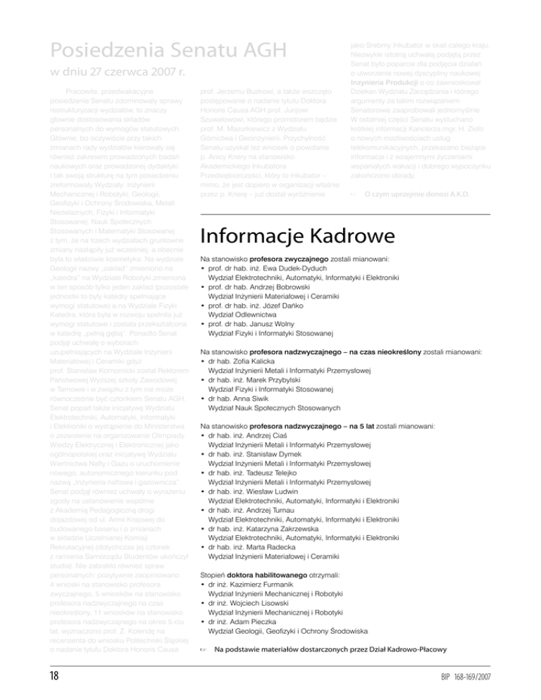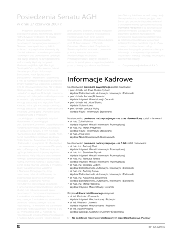 Posiedzenia Senatu AGH w dniu 27 czerwca 2007 r. Pracowite, przedwakacyjne posiedzenie Senatu zdominowały sprawy restrukturyzacji wydziałów, to znaczy głownie dostosowania składów personalnych do wymogów statutowych. Głównie, bo oczywiście przy takich zmianach rady wydziałów kierowały się również zakresem prowadzonych badań naukowych oraz prowadzonej dydaktyki. I tak swoją strukturę na tym posiedzeniu zreformowały Wydziały: Inżynierii Mechanicznej i Robotyki, Geologii, Geofizyki i Ochrony Środowiska, Metali Nieżelaznych, Fizyki i Informatyki Stosowanej, Nauk Społecznych Stosowanych i Matematyki Stosowanej z tym, że na trzech wydziałach gruntowne zmiany nastąpiły już wcześniej, a obecnie była to właściwie kosmetyka: Na wydziale Geologii nazwy „zakład” zmieniono na „katedra” na Wydziale Robotyki zmieniona w ten sposób tylko jeden zakład (pozostałe jednostki to były katedry spełniające wymogi statutowe) a na Wydziale Fizyki Katedra, która była w rozwoju spełniła już wymogi statutowe i została przekształcona w katedrę „pełną gębą”. Ponadto Senat podjął uchwałę o wyborach uzupełniających na Wydziale Inżynierii Materiałowej i Ceramiki gdyż prof. Stanisław Komornicki został Rektorem Państwowej Wyższej szkoły Zawodowej w Tarnowie i w związku z tym nie może równocześnie być członkiem Senatu AGH. Senat poparł także inicjatywę Wydziału Elektrotechniki, Automatyki, Informatyki i Elektroniki o wystąpienie do Ministerstwa o zezwolenie na organizowanie Olimpiady Wiedzy Elektrycznej i Elektronicznej jako ogólnopolskiej oraz inicjatywę Wydziału Wiertnictwa Nafty i Gazu o uruchomienie nowego, autonomicznego kierunku pod nazwą „Inżynieria naftowa i gazownicza”. Senat podjął również uchwały o wyrażeniu zgody na ustanowienie wspólnie z Akademią Pedagogiczną drogi dojazdowej od ul. Armii Krajowej do budowanego basenu i o zmianach w składzie Uczelnianej Komisji Rekrutacyjnej (dotychczas jej członek z ramienia Samorządu Studentów ukończył studia). Nie zabrakło również spraw personalnych: pozytywnie zaopiniowano 4 wnioski na stanowisko profesora zwyczajnego, 5 wniosków na stanowisko profesora nadzwyczajnego na czas nieokreślony, 11 wniosków na stanowisko profesora nadzwyczajnego na okres 5-ciu lat, wyznaczono prof. Z. Kolendę na recenzenta do wniosku Politechniki Śląskiej o nadanie tytułu Doktora Honoris Causa 18 prof. Jerzemu Buzkowi, a także wszczęto postępowanie o nadanie tytułu Doktora Honoris Causa AGH prof. Jurijowi Szuwałowowi, którego promotorem będzie prof. M. Mazurkiewicz z Wydziału Górnictwa i Geoinżynierii. Przychylność Senatu uzyskał też wniosek o powołanie p. Anicy Knery na stanowisko Akademickiego Inkubatora Przedsiębiorczości, który to Inkubator – mimo, że jest dopiero w organizacji właśnie przez p. Knerę – już dostał wyróżnienie jako Srebrny Inkubator w skali całego kraju. Niezwykle istotną uchwałą podjętą przez Senat było poparcie dla podjęcia działań o utworzenie nowej dyscypliny naukowej Inzynieria Produkcji o co zawnioskował Dziekan Wydziału Zarządzania i którego argumenty za takim rozwiązaniem Senatorowie zaaprobowali jednomyślnie. W ostatniej części Senatu wysłuchano krótkiej informacji Kanclerza mgr. H. Zioło o nowych możliwościach usług telekomunikacyjnych, przekazano bieżące informacje i z wzajemnymi życzeniami wspaniałych wakacji i dobrego wypoczynku zakończono obrady. O czym uprzejmie donosi A.K.D. Informacje Kadrowe Na stanowisko profesora zwyczajnego zostali mianowani: • prof. dr hab. inż. Ewa Dudek-Dyduch Wydział Elektrotechniki, Automatyki, Informatyki i Elektroniki • prof. dr hab. Andrzej Bobrowski Wydział Inżynierii Materiałowej i Ceramiki • prof. dr hab. inż. Józef Dańko Wydział Odlewnictwa • prof. dr hab. Janusz Wolny Wydział Fizyki i Informatyki Stosowanej Na stanowisko profesora nadzwyczajnego – na czas nieokreślony zostali mianowani: • dr hab. Zofia Kalicka Wydział Inżynierii Metali i Informatyki Przemysłowej • dr hab. inż. Marek Przybylski Wydział Fizyki i Informatyki Stosowanej • dr hab. Anna Siwik Wydział Nauk Społecznych Stosowanych Na stanowisko profesora nadzwyczajnego – na 5 lat zostali mianowani: • dr hab. inż. Andrzej Ciaś Wydział Inżynierii Metali i Informatyki Przemysłowej • dr hab. inż. Stanisław Dymek Wydział Inżynierii Metali i Informatyki Przemysłowej • dr hab. inż. Tadeusz Telejko Wydział Inżynierii Metali i Informatyki Przemysłowej • dr hab. inż. Wiesław Ludwin Wydział Elektrotechniki, Automatyki, Informatyki i Elektroniki • dr hab. inż. Andrzej Turnau Wydział Elektrotechniki, Automatyki, Informatyki i Elektroniki • dr hab. inż. Katarzyna Zakrzewska Wydział Elektrotechniki, Automatyki, Informatyki i Elektroniki • dr hab. inż. Marta Radecka Wydział Inżynierii Materiałowej i Ceramiki Stopień doktora habilitowanego otrzymali: • dr inż. Kazimierz Furmanik Wydział Inżynierii Mechanicznej i Robotyki • dr inż. Wojciech Lisowski Wydział Inżynierii Mechanicznej i Robotyki • dr inż. Adam Pieczka Wydział Geologii, Geofizyki i Ochrony Środowiska Na podstawie materiałów dostarczonych przez Dział Kadrowo-Płacowy BIP 168-169/2007
