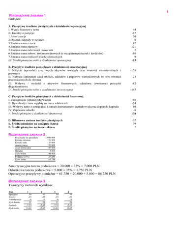 1 ROZWIĄZANIE ZADANIA 1 Cash flow A. Przepływy środków pieniężnych z działalności operacyjnej I. Wynik finansowy netto II. Korekty o pozycje: 1.Amortyzacja 2.Odsetki i udziały w zyskach 3.Zmiana stanu rezerw 4.Zmiana stanu zapasów 5.Zmiana stanu należności i roszczeń 6.Zmiana stanu zobow. krótkoterminowych (z wyjątkiem pożyczek i kredytów) 7.Zmiana stanu rozliczeń międzyokresowych III. Środki pieniężne netto z działalności operacyjnej B. Przepływ środków pieniężnych z działalności inwestycyjnej I. Nabycie (sprzedaż) rzeczowych aktywów trwałych oraz wartości niematerialnych i prawnych II. Nabycie (sprzedaż) akcji obcych, udziałów i papierów wartościowych (w tym również przeznaczonych do obrotu) III. Wpływy / wydatki z aktywów finansowych: udzielone (zwrócone) pożyczki długoterminowe IV. Środki pieniężne netto z działalności inwestycyjnej 44 -67 30 8 12 -121 5 -10 9 -23 -158 23 -12 -147 C. Przepływ środków pieniężnych z działalności finansowej I. Zaciągnięcie (spłata) zobowiązań II. Dywidendy i inne wypłaty na rzecz właścicieli III. Wpływy netto z emisji akcji i innych instrumentów kapitałowych oraz dopłat do kapitału IV. Zapłacone odsetki V. Środki pieniężne z działalności finansowej 160 -24 10 -8 138 D. Bilansowa zmiana środków pieniężnych E. Środki pieniężne na początek okresu F. Środki pieniężne na koniec okresu -32 39 7 ROZWIĄZANIE ZADANIA 2 Przychody ze sprzedaży Koszty zmienne Koszty stałe Amortyzacja Zysk operacyjny Odsetki Zysk brutto Podatek (35%) Zysk netto 1 000 000 750 000 130 000 20 000 100 000 5 000 95 000 33 250 61 750 Amortyzacyjna tarcza podatkowa = 20.000 × 35% = 7.000 PLN Odsetkowa tarcza podatkowa = 5.000 × 35% = 1.750 PLN Operacyjne przepływy pieniężne = 61.750 + 20.000 + 5.000 = 86.750 PLN ROZWIĄZANIE ZADANIA 3 Tworzymy rachunek wyników: Rok Sprzedaż Koszty Amortyzacja Zysk brutto Podatek Zysk netto 1 50 -23 -6 21 -7,35 13,65 2 50 -23 -6 21 -7,35 13,65 3 50 -23 -6 21 -7,35 13,65 4 50 -23 -6 21 -7,35 13,65 2 I w oparciu o niego rachunek przepływów pieniężnych: Rok Zysk netto Amortyzacja Przepływy pieniężne na działalności operacyjnej 1 13,65 6 19,65 2 13,65 6 19,65 3 13,65 6 19,65 4 13,65 6 19,65 ROZWIĄZANIE ZADANIA 4 A. Przepływy środków pieniężnych z działalności operacyjnej I.Wynik finansowy netto II.Korekty o pozycje: 1. Amortyzacja 2.Odsetki i udziały w zyskach 3.Zmiana stanu rezerw 4.Zmiana stanu zapasów 5.Zmiana stanu należności i roszczeń 6.Zmiana stanu zobow. krótkoterminowych (bez kredytów) 7.Zmiana stanu rozliczeń międzyokresowych III.Środki pieniężne netto z działalności operacyjnej B.Przepływ środków pieniężnych z działalności inwestycyjnej I.Nabycie (sprzedaż) rzeczowych aktywów trwałych i wart niematerialnych i prawnych II. Nabycie/zbycie aktywów finansowych III.Udzielone (zwrócone) pożyczki długoterminowe IV.Środki pieniężne netto z działalności inwestycyjnej C. Przepływ środków pieniężnych z działalności finansowej I. Zaciągnięcie (spłata) zobowiązań II. Zaciągnięcie (spłata) kredytów i pożyczek III. Dywidendy i inne wypłaty na rzecz właścicieli IV. Wpływy netto z emisji akcji i innych instrumentów kapitałowych oraz dopłat do kapitału V. Odsetki VI.Środki pieniężne z działalności finansowej D. Bilansowa zmiana stanu środków pieniężnych E. Środki pieniężne na początek okresu F. Środki pieniężne na koniec okresu 133 37 35 60 -13 -12 -10 -16 -7 170 -111 3 0 -108 -48 69 -20 0 -60 -59 3 18 21 ZZAAADDDAAANNNIIIEEE 55 –– KKKO O N S T R U O W A N E B L A N S U R A C H U N K U Z Y S K Ó W S T R A T O R A Z S P R A W O Z D A N A Z P R Z E P Ł Y W U WO OZ ZD DA AN NIIIA AZ RZ ZE EP PŁ ŁY YW WU U ON NS ST TR RU UO OW WA AN NIIIE EB LA AN NS SU U,, R AC CH HU UN NK KU UZ YS SK KÓ ÓW W III S TR RA AT TO OR RA AZ ZS PR RA AW ZP PR BIIIL RA ZY ST SP Ś R O D K Ó W P I E N I Ę Ż N Y C H . – K O R E K T A T R E Ś C I O B R A K U J Ą C E W A R T O Ś C I Ś R O D K Ó W P I E N I Ę Ż N Y C H ŚRODKÓW PIENIĘŻNYCH. – KOREKTA TREŚCI O BRAKUJĄCE WARTOŚCI ... 5. Zaciągnięto zobowiązanie krótkoterminowe w wysokości 1500 zł. Wpływy z operacji zasiliły kasę firmy (krótkoterminowy kredyt bankowy) 7. W ramach badań rozwojowych firma zakupiła rzeczowe środki trwałe (za gotówkę) za 250zł 8. Firma opłaciła z góry za przyszły rok prenumeratę czasopisma „rachunkowość” płacąc 100 zł (dla uproszczenia przyjmij że cała kwota zasili długookresowe RMC) 3 ROZWIĄZANIE ZADANIA 5 A I II III IV V B I II III IV A I II III IV V VI VII VII I IX Wyszczególnienie Aktywa trwałe Wartości niematerialne i prawne Rzeczowe aktywa trwałe Należności długoterminowe Inwestycje długoterminowe Długoterminowe rozliczenia międzyokresowe Aktywa obrotowe Zapasy Należności krótkoterminowe Krótkoterminowe aktywa finansowe Krótkoterminowe rozliczenia międzyokresowe AKTYWA RAZEM BO 1 2 3 5 100 100 -5 5 000 -500 0 0 0 1 100 1 000 -500 0 2 000 100 500 0 6 200 5 BZ 5 945,00 95,00 1000 5 500,00 0,00 250 250,00 100 100,00 3 936,50 500,00 2 000,00 1 500 -250 -100 -313,5 1 436,50 0,00 9 881,50 Kapitał (fundusz) własny 5 300 Kapitał (fundusz) podstawowy 4 500 Należne wpłaty na kapitał podstawowy (wielkość ujemna) 0 Udziały (akcje) przeznaczone do umorzenia (wielkość ujemna) 0 Kapitał (fundusz) zapasowy w tym 200 Kapitał (fundusz) z aktualizacji wyceny 0 Pozostałe kapitały (fundusze) rezerwowe 0 Zysk (strata) z lat ubiegłych 600 Zysk (strata) netto 0 -500 2 500 -505 -70 Odpisy z zysku netto w ciągu roku obrotowego (wielkość 0 ujemna) B Zobowiązania i rezerwy na zobowiązania 900 I Rezerwy na zobowiązania 200 II Zobowiązania długoterminowe 500 III Zobowiązania krótkoterminowe 200 IV Rozliczenia międzyokresowe 0 PASYWA RAZEM 6 200 Przychody ze sprzedaży Koszty sprzedanych towarów i materiałów ( dolicz do nich amortyzację) Wynik na sprz