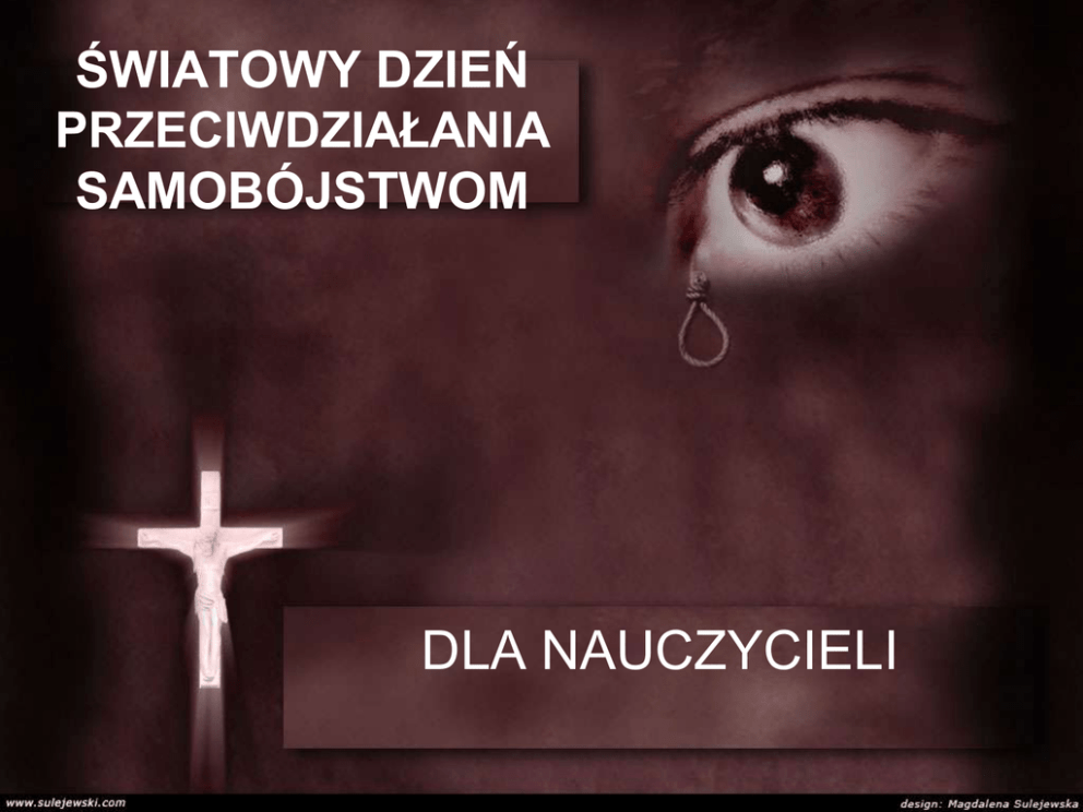 ŚWIATOWY DZIEŃ PRZECIWDZIAŁANIA SAMOBÓJSTWOM DLA NAUCZYCIELI CZYM JEST SAMOBÓJSTWO „ Samobójstwo nie jest kwestią wyboru, ale następuje wtedy, gdy cierpienie przekracza siły do walki z nim” • Ucieczka przed sytuacją lub stanem psychicznym, których nie da się wytrzymać • Odegranie się na innych poprzez wywołanie poczucia winy, żalu, wstydu • Wymierzanie sobie kary PRZYCZYNY PRÓB SAMOBÓJCZYCH WŚRÓD MŁODZIEŻY • Depresja • Utrata bliskiej osoby ( zwłaszcza śmierć samobójcza w rodzinie) • Złamane serce • Problemy w domu ( brak środków finansowych, przemoc, alkoholizm) • Brak akceptacji dla samego siebie • Odrzucenie przez rówieśników • Niepromowanie do następnej klasy • Zagrożenie oceną niedostateczną CO POWINNO ZWRÓCIĆ NASZĄ UWAGĘ - obniżony, długotrwały nastrój - izolowanie się - zmiany w wyglądzie ( zmiana kolorystyki ubioru, zmiany fryzur, utrata wagi) - trudności ze snem ( kłopoty z zaśnięciem, zbyt wczesne budzenie się, częste przebudzenia w nocy, koszmary senne) - porzucanie działań, które dotychczas sprawiały przyjemność ( zainteresowania, hobby, zajęcia dodatkowe) - zmiany nawyków i przyzwyczajeń ( przejście na wegetarianizm, nagłe zmiany zainteresowań, zwrot ku wierze lub odejście od niej) - pisanie listów, pamiętników pożegnalnych - rozdawanie rzeczy, pozbywanie się kolekcji CO POWINNO ZWRÓCIĆ NASZĄ UWAGĘ • • • • • • • • • • • okaleczenia ciała wagary nagły spadek ocen ucieczki z domu wszelkiego rodzaju komunikaty o tym, że ktoś chce się zabić rysowanie symboli religijnych, pisanie tajemniczych dat rozmyślanie, rozmowy o śmierci, o życiu po śmierci gromadzenie tabletek, nauka wiązania węzłów, nagłe zainteresowanie bronią żegnanie się, nagłe przepraszanie, proszenie o wybaczenia rozmyślanie, rozmowy o śmierci, o życiu po śmierci gromadzenie tabletek, nauka wiązania węzłów, nagłe zainteresowanie bronią CZYNNIKI ZMNIEJSZAJĄCE RYZYKO SMIERCI SAMOBÓJCZEJ • Kształtowanie pozytywne samooceny ucznia • Pomoc w wyrażaniu emocji i rozładowywaniu napięcia emocjonalnego • Zapobieganie zjawiskom tyranizowania i przemocy w szkole pomoc w radzeniu sobie w sytuacjach stresowych i trudnych • Podwyższanie kompetencji komunikacyjnych uczniów • Rozwijanie pasji i zainteresowań młodzieży • Modelowanie zachowań akceptowanych społecznie • Pomoc w poszukiwaniu alternatywnych rozwiązań • Szybka diagnoza i interwencja przejawianych przez uczniów trudności CO NALEŻY ROBIĆ • znalezienie odpowiedniego miejsca, gdzie można porozmawiać spokojnie i w odosobnieniu, • przeznaczenie na rozmowę niezbędnej ilości czasu (osoby o skłonnościach samobójczych potrzebują go zwykle więcej) • skuteczne wysłuchanie • dostarczenie wsparcia emocjonalnego • opisanie i nazwanie emocji, które towarzyszą myślom i działaniom samobójczym ( samo mówienie zmniejsza lęk) • skoncentrowanie się na pozytywnych stronach, sukcesach tej osoby • w sytuacji dużych trudności skierowanie do pedagoga, psychologa lub lekarza CZEGO NIE NALEŻY ROBIĆ Nie zobowiązuj się do zachowania tajemnicy Nie przedstawiaj problemu osoby, jako śmieszny, mały, banalny Nie prowokuj do działania ( „ Idź śmiało , otworzyć Ci okno, kupić sznurek”) nie bądź wstrząśnięty, zażenowany, nie śmiej się Nie wpadaj w panikę Nigdy nie pozostawiaj osoby samej sobie, bez opieki i kontaktu Nie oceniaj jej/ jego działania jako aktu tchórzostwa lub heroicznej odwagi Nie wdawaj się w rozmowy o życiu po życiu, wiary na temat karmy czy predystynacaji ( przeznaczenia)