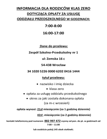 INFORMACJA DLA RODZICÓW KLAS ZERO DOTYCZĄCA OPŁATY ZA USŁUGĘ ODDZIAŁU PRZEDSZKOLNEGO W GODZINACH: 7:00-8:00 16:00-17:00 Dane do przelewu: Zespół Szkolno-Przedszkolny nr 1 ul: Zemska 16 c 54-438 Wrocław 34 1020 5226 0000 6202 0416 1444 tytuł przelewu: nazwisko i imię dziecka klasa zero opłata za usługę oddziału przedszkolnego okres za jaki została dokonana opłata (za m-c wrzesień) opłata wynosi: 21zł miesięcznie (za 1 godzinę dziennie) 42zł -miesięcznie (za 2 godziny dziennie) kontakt telefoniczny pod numerem 882 997 472 czynny od pon. do pt. w godzinach od 7:00 – 11:00 lub osobiście pokój 145 obok stołówki.