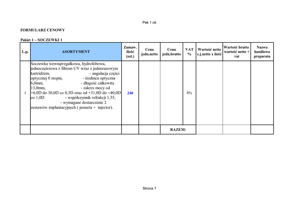 Pak 1 ok FORMULARZ CENOWY Pakiet 1 – SOCZEWKI 1 L.p. 1 ASORTYMENT Soczewka wewnątrzgałkowa, hydrofobowa, jednoczęściowa z filtrem UV wraz z jednorazowym kartridżem, - angulacja części optycznej 0 stopni, - średnica optyczna 6,0mm, - długość całkowita 13,0mm, - zakres mocy od +6,0D do 30,0D co 0,5D oraz od +31,0D do +40,0D co 1,0D - współczynnik refrakcji 1,55, - wymagane dostarczenie 2 zestawów implantacyjnych ( penseta + injector). Zamaw. Ilość (szt.) Cena jedn.netto Cena jedn.brutto Wartość brutto VAT Wartość netto wartość netto + % c.j.netto x ilość vat 8% 240 RAZEM: Strona 1 Nazwa handlowa preparatu Pak 1 ok Producent Strona 2 Pak 2 ok Pak.2 SOCZEWKI 2 L.p. 1 ASORTYMENT Soczewka wewnątrzgałkowa zwijalna jednoczęściowa, akrylowa, hydrofilna, asferyczna z zestawem do implantacji, -średnica optyczna 6,0 mm; -długość całkowita 13,00 mm; -stopień uwodnienia 26%; -angulacja 9 stopni; -dioptraż od -10,0 D do +40,0 D; -implantacja przez cięcie 2,2 mm- 2,4mm, dwie części haptyczne, w których znajdują się po dwa otwory umożliwiające w razie potrzeby podszycie soczewki, podwójne ostre krawędzie 360 stopni zapobiegające migracji komórek, filtr UV- benzofenon. Zamaw. Ilość Cena (szt.) jedn.netto Cena VAT jedn.brutto % 8% 220 RAZEM: Strona 3 Wartość netto c.j.netto x ilość Wartość brutto wartość netto + vat Nazwa handlowa preparatu Pak 2 ok Producent Strona 4 Pak 3 ok FORMULARZ CENOWY Pakiet 3 – SOCZEWKI 3 L.p. ASORTYMENT Soczewka wewnątrzgałkowa, zwijalna, jednoczęściowa, tylnokomorowa wraz z jednorazowym systemem implantacyjnym ; - akrylowa hydrofobowa o stopniu uwodnienia poniżej 0,5% ; - z chromoforami filtrującymi promieniowanie UV; - angulacja części haptycznych 0-5 stopni; 1 - współczynnik refrakcji >1,52; - średnica części optycznej 6,0 mm; - zakres dioptrażu +6,0D do +30,0D (co 0,5D) ; - długość całkowita od 12,5mm do 13,0mm. Zamaw. Ilość (szt.) Cena jedn.netto Cena jedn.brutto VAT% 8% 140 RAZEM: Strona 5 Wartość netto c.j.netto x ilość Wartość brutto wartość netto + vat Nazwa handlowa preparatu Pak 3 ok Producent Strona 6 Pak 4 ok FORMULARZ CENOWY Pakiet 4 – SOCZEWKI 4 L.p. ASORTYMENT Soczewka jednoczęściowa, tylnokomorowa wykonana z PMMA; do podszycia w zaćmach powikłanych; część optyczna dwuwypukła; z filtrem UV; - moc optyczna od +10,0 D do +30,0 D; - średnica optyczna 7,0mm; - długość całkowita 12,5mm; 1 - angulacja haptenów 5 stopni; Soczewka zaopatrzona jest w oczka na obu częściach haptycznych, umożliwiające twardówkowe podszycie soczewki w rowku (bruździe). Zamaw. Ilość (szt.) Cena jedn.netto Cena VAT% jedn.brutto 8% 6 RAZEM: Strona 7 Wartość netto c.j.netto x ilość Wartość brutto wartość netto + vat Nazwa handlowa preparatu Producent Pak 5 ok FORMULARZ CENOWY Pakiet 5 – SOCZEWKI 5 L.p. 1 ASORTYMENT Jednoczęściowa soczewka wykonana z PMMA (polimetakrylanu metylu) - średnica optyczna: 6 mm - -długość całkowita: 13 mm - miejsce wszczepienia: przednia komora oka -dwuwypukła - kompatybilna z laserem Nd-YAG -stała A: 115,8 (SRKII/wg biometrii amerykańskiej) - teoretyczna wartość ACD: 3,68 mm -ukątowienie/angulacja: 12,5° - dostępna w następujących dioptriach: od -10D do +14D (skok co 1D) ;od +15D do +25D (skok co 0,5D); od +26D do +30D (skok co 1D). Zamaw. Cena Ilość (szt.) jedn.netto Cena VAT% jedn.brutto 8% 12 RAZEM: Strona 8 Wartość netto c.j.netto x ilość Wartość brutto wartość netto + vat Nazwa handlowa preparatu Pak 5 ok Producent Strona 9 Pak. 6 ok FORMULARZ CENOWY Pakiet 6 – SOCZEWKI 6 L.p. 1 ASORTYMENT Soczewka jednoczęściowa, sferyczna akrylowa, hydrofobowa; pokryta heparyną. Fabrycznie załadowana do kartridża. -Średnica optyczna 6,0 mm; -długość całkowita 13,0 mm; -haptyka typu C-LOOP; -dioptraż od +4,0D do +30,0D ( narastający co 0,5D) ; - angulacja haptenów 5 stopni. Zamaw. Ilość Cena (szt.) jedn.netto Cena VAT% jedn.brutto 8% 50 RAZEM: Strona 10 Wartość netto c.j.netto x ilość Wartość brutto wartość netto + vat Nazwa handlowa preparatu Pak. 6 ok Producent Strona 11 Pak.7 ok FORMULARZ CENOWY Pakiet 7 – PIERŚCIEŃ dotorebkowy L.p. ASORTYMENT Pierścień dotorebkowy atraumatyczny do stabilizacji soczewki wewnątrzgałkowej, wykonany z PMMA (polimetakrylan metylu),jałowy, załadowany fabrycznie do jałowego jednorazowego injektora, -średnica pierścienia(w stanie sprężonym, przy stykających się pierścieniach fiksacyjnych): 11mm oraz 12mm; 1 -średnica pierścienia rozprężonego: 13mm oraz 14mm. Zamaw. Ilość Cena (szt.) jedn.netto Cena VAT% jedn.brutto 8% 20 RAZEM: Strona 12 Wartość netto c.j.netto x ilość Wartość brutto wartość netto + vat Nazwa handlowa preparatu Pak.7 ok Producent Strona 13 Pak.8 ok FORMULARZ CENOWY Pakiet 8– MATERIAŁ WISKOELASTYCZNY. L.p. 1 ASORTYMENT Materiał wiskoelastyczny o właściwościach dyspersyjno-kohezyjnych pakowany w strzykawce z kaniulą o pojemności 1 ml. Nie dopuszcza się domieszki metylocelulozy do składu wiskoelastyku. Wymagany zakres stężeń preparatu: 1,0%, 1,4%, 1,6%, 1,8%, 3,0%, zgodnie z potrzebami Zamawiającego. Wymagane chłodne, tj. od 2 do 8 stopni C warunki transportu i magazynowania. Zamaw. Ilość (szt.) Cena jedn.netto Cena VAT% jedn.brutto 8% 610 RAZEM: Strona 14 Wartość netto c.j.netto x ilość Wartość brutto wartość netto + vat Nazwa handlowa preparatu Producent Pak. 9 ok FORMULARZ CENOWY Pakiet 9 – ROZTWÓR DO BARWIENIA TKANEK. L.p. 1 ASORTYMENT Roztwór stosowany do barwienia tkanek, sterylny, skład- błękit trypanu o stężeniu 0,06% (tkanki), fiolka 1ml, op.5szt. Nie daje efektu tzw czerwonego odblasku. Zamaw. Ilość (op.) Cena jedn. Netto/op. Cena jedn. Brutto/op. VAT% 8% 25 RAZEM: Strona 15 Wartość netto c.j.netto x ilość Wartość brutto wartość netto + vat Nazwa handlowa preparatu Producent Pak.10 ok FORMULARZ CENOWY Pakiet 10– RETRAKTORY L.p. ASORTYMENT Zamaw. Ilość Cena (szt.) jedn.netto