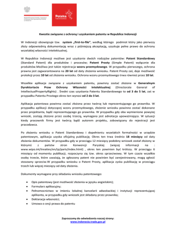 Kwestie związane z ochroną i uzyskaniem patentu w Republice Indonezji W Indonezji obowiązuje tzw. system „first-to-file”, według którego podmiot który jako pierwszy złoży odpowiednią dokumentację wraz z późniejszą akceptacją, uzyskuje pełne prawo do ochrony wszelakiej własności intelektualnej. W Republice Indonezji możliwe jest uzyskanie dwóch rodzajów patentów: Patent Standardowy (Standard Patent) dla produktów i procesów; Patent Prosty (Simple Patent) wyłącznie dla produktów.Możliwa jest także rejestracja wzoru przemysłowego. W przypadku pierwszego, ochrona prawna jest zagwarantowana na 20 lat od daty złożenia wniosku. Patent Prosty zaś, daje możliwość protekcji przez 10 lat od złożenia wniosku. Ochrona wzoru przemysłowego trwa również przez 10 lat. Wszelkie aplikacje związane z uzyskaniem patentu, powinny zostać złożone w Generalnym Dyrektoriacie Praw Ochrony Własności Intelektualnej (Directorate General of IntellectualPropertyRights) . Średni czas uzyskania Patentu Standardowego to od 3 do 5 lat, zaś w przypadku Patentu Prostego okres ten wynosi od 2 do 3 lat. Aplikacja patentowa powinna zostać złożona przez twórcę lub reprezentującego go prawnika. W przypadku aplikacji dotyczącej wzoru przemysłowego, złożenie wniosku powinno zostać dokonane przez projektanta, bądź reprezentującego go prawnika. W przypadku gdy oba wymienione powyżej wnioski, zostają złożone przez osobę trzecią, wymagana jest adnotacja upoważniająca. W sytuacji kiedy pracownik firmy jest twórcą bądź autorem projektu, zobowiązany do rejestracji jest pracodawca. Po złożeniu wniosku o Patent Standardowy i dopełnieniu wszelakich formalności w urzędzie patentowym, aplikacja uzyska oficjalną publikację. Okres ten trwa średnio 18 miesięcy od daty złożenia dokumentów. W przypadku gdy w przeciągu 12 miesięcy podobny wniosek został złożony w którymś z państw stron Konwencji Paryskiej (więcej informacji na : www.wipo.int/treaties/en/ip/paris/index.html) , okres ten powinien być krótszy. W przeciągu 6 miesięcy od momentu publikacji, rozpoczyna się tzw. okres sprzeciwowy. W tym czasie wszelkie osoby trzecie, które uważają, że zgłoszony patent nie powinien być zarejestrowany, mogą zgłosić stosowny sprzeciw.W przypadku wniosku o Patent Prosty, aplikacja zyska publikację w przeciągu trzech lub więcej miesięcy od daty złożenia. Dokumenty wymagane przy składaniu wniosku patentowego: • • • • • Opis patentowy (jest możliwość złożenia w języku angielskim); Formularz aplikacyjny; Pełnomocnictwo w imieniu lokalnej kancelarii adwokackiej i instytucji reprezentującej aplikanta, w przypadku gdy wniosek jest składany przez prawnika; Deklaracja własności; Umowa o cesji prawa do patentu Zapraszamy do odwiedzenia naszej strony: www.indonesia.trade.gov.pl Żaden z powyżej opisanych dokumentów nie wymaga legalizacji ani potwierdzenia notarialnego. W przypadku rejestracji wzoru przemysłowego wymagane są następujące dokumenty: • • • Rysunek bądź fotografia projektu; Opis projektu w formie papierowej; Formularz aplikacyjny. Wniosek powinien zostać złożony w Generalnym Dyrektoriacie Ochrony Własności Intelektualnej. Przewidywany okres całego postępowania aplikacyjnego wynosi od 24 do 36 miesięcy. Aplikacje należy składać w języku indonezyjskim. Przewidywane koszty: Opłata urzędowa Opłata za agenta Tłumaczenie Dodatkowe koszty w okresie pomiędzy aplikacją, a uzyskaniem patentu 55 EUR od 580 EUR do 800 EUR od 10 EUR do 40 EUR za jedną stronę A4 od 2000 EUR do 3000 EUR wliczając: Urzędowa opłata za rozpatrzenie: 150 EUR (przeliczone z 2 milionów IDR); Koszty związane z publikacją Certyfikaty Wskazówki i uwagi: • • • • Większość sędziów w Indonezji, nie jest odpowiednio zaznajomiona ze sprawami związanymi z ochroną patentów, dlatego w dużej mierze opierają się oni w swoich werdyktach na opinii Urzędu Patentowego. Ponadto, pomocne mogą okazać się orzeczenia innych sądów z zagranicy. Często pojawiają się błędy w tłumaczeniach dokumentów wymaganych do rejestracji. Zaleca się szczególną ostrożność co do tłumaczonego tekstu. Nie jest prowadzony pełny skomputeryzowany spis patentów. W przypadku rejestracji wzoru przemysłowego, projekt musi być nowy i nie może już funkcjonować na rynku. Zapraszamy do odwiedzenia naszej strony: www.indonesia.trade.gov.pl