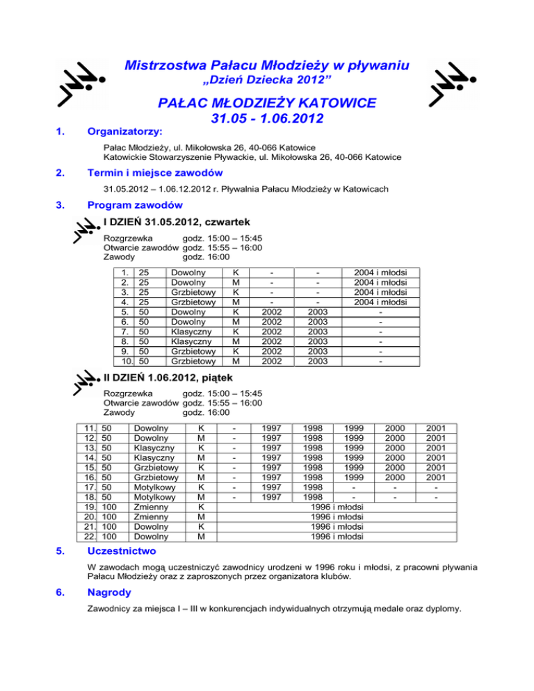 Mistrzostwa Pa acu M odzie y w p ywaniu „Dzie Dziecka 2012” PA AC M ODZIE Y KATOWICE 31.05 - 1.06.2012 1. Organizatorzy: Pa ac M odzie y, ul. Miko owska 26, 40-066 Katowice Katowickie Stowarzyszenie P ywackie, ul. Miko owska 26, 40-066 Katowice 2. Termin i miejsce zawodów 31.05.2012 – 1.06.12.2012 r. P ywalnia Pa acu M odzie y w Katowicach 3. Program zawodów I DZIE 31.05.2012, czwartek Rozgrzewka godz. 15:00 – 15:45 Otwarcie zawodów godz. 15:55 – 16:00 Zawody godz. 16:00 1. 2. 3. 4. 5. 6. 7. 8. 9. 10. 25 25 25 25 50 50 50 50 50 50 Dowolny Dowolny Grzbietowy Grzbietowy Dowolny Dowolny Klasyczny Klasyczny Grzbietowy Grzbietowy K M K M K M K M K M 2002 2002 2002 2002 2002 2002 2003 2003 2003 2003 2003 2003 2004 i m odsi 2004 i m odsi 2004 i m odsi 2004 i m odsi - II DZIE 1.06.2012, pi tek Rozgrzewka godz. 15:00 – 15:45 Otwarcie zawodów godz. 15:55 – 16:00 Zawody godz. 16:00 11. 12. 13. 14. 15. 16. 17. 18. 19. 20. 21. 22. 5. 50 50 50 50 50 50 50 50 100 100 100 100 Dowolny Dowolny Klasyczny Klasyczny Grzbietowy Grzbietowy Motylkowy Motylkowy Zmienny Zmienny Dowolny Dowolny K M K M K M K M K M K M - 1997 1997 1997 1997 1997 1997 1997 1997 1998 1999 1998 1999 1998 1999 1998 1999 1998 1999 1998 1999 1998 1998 1996 i m odsi 1996 i m odsi 1996 i m odsi 1996 i m odsi 2000 2000 2000 2000 2000 2000 - 2001 2001 2001 2001 2001 2001 - Uczestnictwo W zawodach mog uczestniczy zawodnicy urodzeni w 1996 roku i m odsi, z pracowni p ywania Pa acu M odzie y oraz z zaproszonych przez organizatora klubów. 6. Nagrody Zawodnicy za miejsca I – III w konkurencjach indywidualnych otrzymuj medale oraz dyplomy. Najlepsi zawodnicy w poszczególnych kategoriach wiekowych wg punktacji FINA 2012 (SC) otrzymuj puchary. W kategoriach 7, 8, 9 dodatkowo od miejsca 4 wszyscy zawodnicy otrzymuj dyplomy. 7. Zg oszenie do zawodów Obowi zuje zg oszenie z programu Entry Edytor – SPLASH. Program Entry Edytor Splash, zaproszenie Splash do pobrania ze strony: http://www.pm.katowice.pl/basen/zawody Zg oszenie w formacie LXF SPLASH nale y [email protected] do 28.05.2012 8. przes na adresy poczty e-mail: Przepisy techniczne - Zawody zostan przeprowadzone na p ywalni 25 m. - Zawodnik ma prawo startu: w 1 dniu zawodów w jednej konkurencji, w 2 dniu zawodów w dwóch konkurencjach indywidualnych na dystansach – 50m i 100m - Dopuszcza si biegi PK. - Skre lenia zawodników na 2 godz. przed rozpocz ciem zawodów. 9. Sprawy organizacyjne Zapisy do zawodów prowadz trenerzy poszczególnych grup dydaktycznych pracowni p ywania Pa acu M odzie y oraz trenerzy z zaproszonych klubów. 10. O wiadczenie, stan zdrowia Jednocze nie z oddaniem zg osze , zaproszony klub zapewnia, e zg oszeni do tych zawodów uczestnicy posiadaj wa ne badania lekarskie (karty zdrowia sportowca) lub o wiadczenia prawnych opiekunów. 11. Zasady finansowania Wszystkie koszty zwi zane z organizacj zawodów ponosi organizator. (nagrody, op aty startowe, komunikaty, komisja s dziowska) 12. Komisja s dziowska Komisj s dziowsk powo uje 13. skie Kolegium S dziów w Katowicach na zlecenie organizatora. Sprawy ró ne Wr czanie medali oraz dyplomów: na bie co podczas zawodów, po zako czeniu danej konkurencji. Nagrodzenie najlepszych zawodników (9 dziewczynek 9 ch opców) pucharami po zako czeniu ka dego bloku wg punktacji FINA 2012 (SC) Wyniki z zawodów zostan opublikowane na stronie internetowej pracowni p ywania Wyniki poszczególnych konkurencji na bie co b wywieszane w holu p ywalni Organizator nie ponosi odpowiedzialno ci za rzeczy zagubione, jak równie szkody i wypadki. 14. Informacja Sprawy organizacyjne: Jacek Czarnecki; e-mail: [email protected] Zapisy zawodników, uczestników pracowni p ywania: trenerzy poszczególnych grup dydaktycznych. tel. 32 2516432 wew. 347 Kierownik Pracowni P ywania Jacek Czarnecki -2-