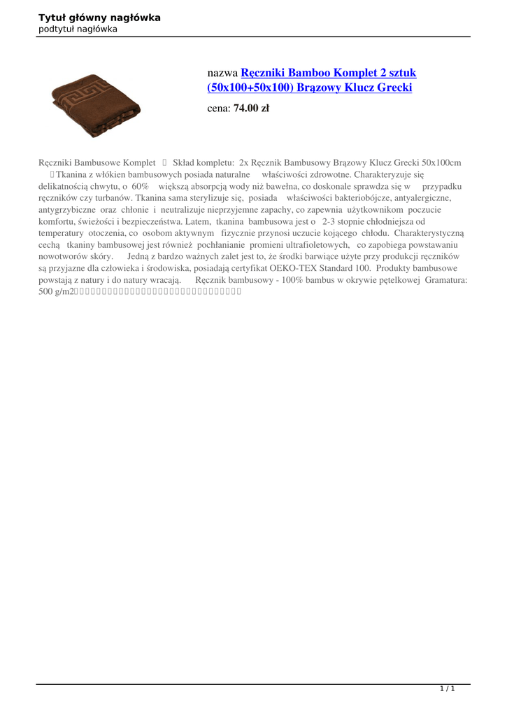 Tytuł główny nagłówka podtytuł nagłówka nazwa Ręczniki Bamboo Komplet 2 sztuk (50x100+50x100) Brązowy Klucz Grecki cena: 74.00 zł Ręczniki Bambusowe Komplet Skład kompletu: 2x Ręcznik Bambusowy Brązowy Klucz Grecki 50x100cm Tkanina z włókien bambusowych posiada naturalne właściwości zdrowotne. Charakteryzuje się delikatnością chwytu, o 60% większą absorpcją wody niż bawełna, co doskonale sprawdza się w przypadku ręczników czy turbanów. Tkanina sama sterylizuje się, posiada właściwości bakteriobójcze, antyalergiczne, antygrzybiczne oraz chłonie i neutralizuje nieprzyjemne zapachy, co zapewnia użytkownikom poczucie komfortu, świeżości i bezpieczeństwa. Latem, tkanina bambusowa jest o 2-3 stopnie chłodniejsza od temperatury otoczenia, co osobom aktywnym fizycznie przynosi uczucie kojącego chłodu. Charakterystyczną cechą tkaniny bambusowej jest również pochłanianie promieni ultrafioletowych, co zapobiega powstawaniu nowotworów skóry. Jedną z bardzo ważnych zalet jest to, że środki barwiące użyte przy produkcji ręczników są przyjazne dla człowieka i środowiska, posiadają certyfikat OEKO-TEX Standard 100. Produkty bambusowe powstają z natury i do natury wracają. Ręcznik bambusowy - 100% bambus w okrywie pętelkowej Gramatura: 500 g/m2 1/1