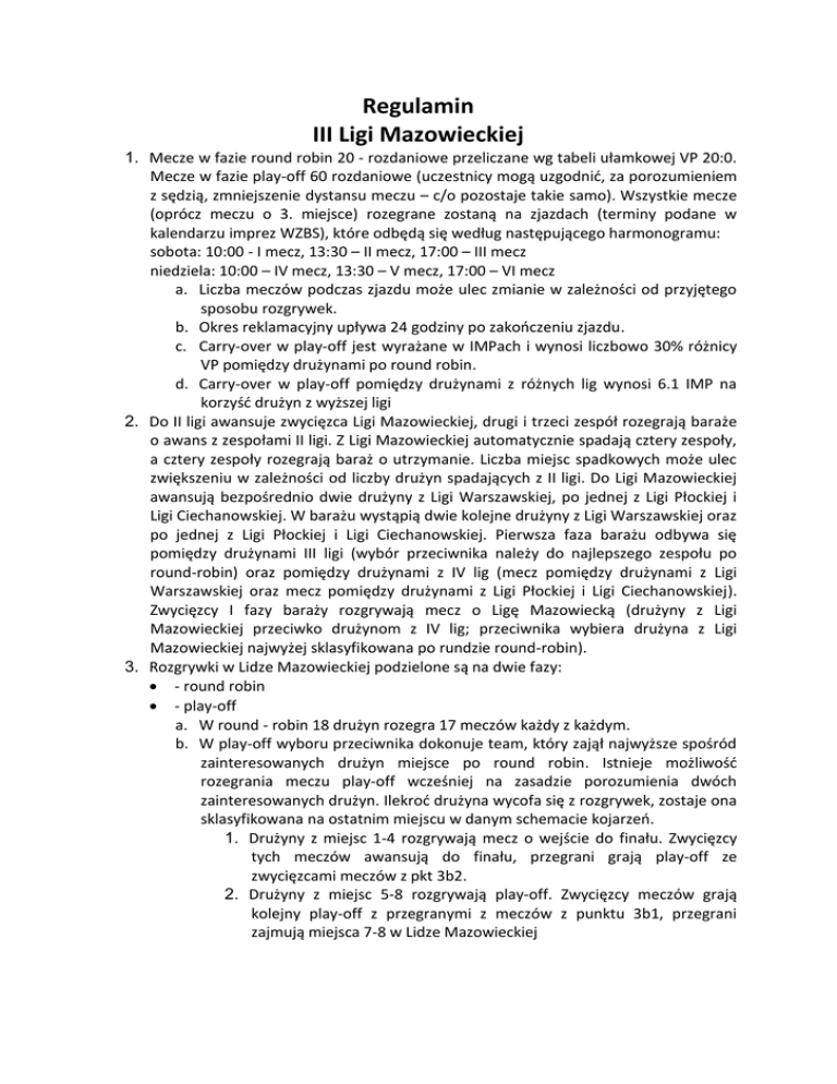 Regulamin III Ligi Mazowieckiej 1. Mecze w fazie round robin 20 - rozdaniowe przeliczane wg tabeli ułamkowej VP 20:0. Mecze w fazie play-off 60 rozdaniowe (uczestnicy mogą uzgodnić, za porozumieniem z sędzią, zmniejszenie dystansu meczu – c/o pozostaje takie samo). Wszystkie mecze (oprócz meczu o 3. miejsce) rozegrane zostaną na zjazdach (terminy podane w kalendarzu imprez WZBS), które odbędą się według następującego harmonogramu: sobota: 10:00 - I mecz, 13:30 – II mecz, 17:00 – III mecz niedziela: 10:00 – IV mecz, 13:30 – V mecz, 17:00 – VI mecz a. Liczba meczów podczas zjazdu może ulec zmianie w zależności od przyjętego sposobu rozgrywek. b. Okres reklamacyjny upływa 24 godziny po zakończeniu zjazdu. c. Carry-over w play-off jest wyrażane w IMPach i wynosi liczbowo 30% różnicy VP pomiędzy drużynami po round robin. d. Carry-over w play-off pomiędzy drużynami z różnych lig wynosi 6.1 IMP na korzyść drużyn z wyższej ligi 2. Do II ligi awansuje zwycięzca Ligi Mazowieckiej, drugi i trzeci zespół rozegrają baraże o awans z zespołami II ligi. Z Ligi Mazowieckiej automatycznie spadają cztery zespoły, a cztery zespoły rozegrają baraż o utrzymanie. Liczba miejsc spadkowych może ulec zwiększeniu w zależności od liczby drużyn spadających z II ligi. Do Ligi Mazowieckiej awansują bezpośrednio dwie drużyny z Ligi Warszawskiej, po jednej z Ligi Płockiej i Ligi Ciechanowskiej. W barażu wystąpią dwie kolejne drużyny z Ligi Warszawskiej oraz po jednej z Ligi Płockiej i Ligi Ciechanowskiej. Pierwsza faza barażu odbywa się pomiędzy drużynami III ligi (wybór przeciwnika należy do najlepszego zespołu po round-robin) oraz pomiędzy drużynami z IV lig (mecz pomiędzy drużynami z Ligi Warszawskiej oraz mecz pomiędzy drużynami z Ligi Płockiej i Ligi Ciechanowskiej). Zwycięzcy I fazy baraży rozgrywają mecz o Ligę Mazowiecką (drużyny z Ligi Mazowieckiej przeciwko drużynom z IV lig; przeciwnika wybiera drużyna z Ligi Mazowieckiej najwyżej sklasyfikowana po rundzie round-robin). 3. Rozgrywki w Lidze Mazowieckiej podzielone są na dwie fazy: - round robin - play-off a. W round - robin 18 drużyn rozegra 17 meczów każdy z każdym. b. W play-off wyboru przeciwnika dokonuje team, który zajął najwyższe spośród zainteresowanych drużyn miejsce po round robin. Istnieje możliwość rozegrania meczu play-off wcześniej na zasadzie porozumienia dwóch zainteresowanych drużyn. Ilekroć drużyna wycofa się z rozgrywek, zostaje ona sklasyfikowana na ostatnim miejscu w danym schemacie kojarzeń. 1. Drużyny z miejsc 1-4 rozgrywają mecz o wejście do finału. Zwycięzcy tych meczów awansują do finału, przegrani grają play-off ze zwycięzcami meczów z pkt 3b2. 2. Drużyny z miejsc 5-8 rozgrywają play-off. Zwycięzcy meczów grają kolejny play-off z przegranymi z meczów z punktu 3b1, przegrani zajmują miejsca 7-8 w Lidze Mazowieckiej 3. Przegrani z meczów z pkt 3b1 i zwycięzcy meczów z punktu 3b2 rozgrywają play-off. Zwycięzcy grają mecz o 3. miejsce, przegrani zajmują miejsca 5-6 w Lidze Mazowieckiej 4. W finale grają zwycięzcy meczów z pkt 3b1. Zwycięzca finału awansuje do II ligi. W meczu o 3. miejsce grają zwycięzcy meczów z pkt 3b3, odbywa się on w miejscu i terminie indywidualnie uzgodnionym z zainteresowanymi drużynami. Przegrani z finału oraz zwycięzcy z meczu o 3. miejsce awansują do baraży o II ligę. 5. Drużyny z miejsc 9-12 rozgrywają mecz o utrzymanie. Zwycięzcy tych meczów rozgrywają play-off o miejsca 9-10 w Lidze Mazowieckiej, przegrani grają mecz ze zwycięzcami meczów z punktu 3b6. 6. Drużyny z miejsc 13-16 rozgrywają play-off. Zwycięzcy tych meczów grają kolejny play-off z przegranymi z punktu 3b5, przegrani zajmują miejsca 15-16. 7. Przegrani z punktu 3b5 i zwycięzcy z punktu 3b6 grają play-off o miejsca 11-14. Zwycięzcy zajmują miejsca 11-12 a przegrani 13-14. Drużyny, które zajęły miejsca 17-18 po round robin spadają do IV ligi. 4. W rozgrywkach obowiązują przepisy „Regulaminu Drużynowych Mistrzostw Polski” oraz przywołanych tam innych regulacji; w szczególności: „Regulaminu Zawodów Brydża Porównawczego PZBS", „Polityki systemowej PZBS".
