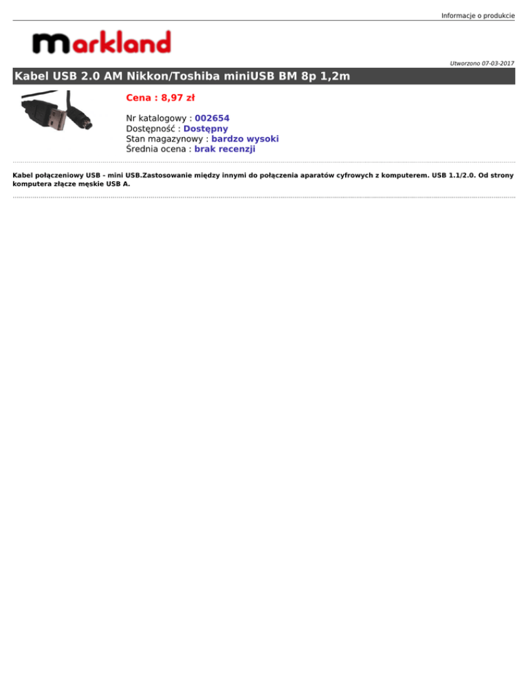 Informacje o produkcie Utworzono 07-03-2017 Kabel USB 2.0 AM Nikkon/Toshiba miniUSB BM 8p 1,2m Cena : 8,97 zł Nr katalogowy : 002654 Dostępność : Dostępny Stan magazynowy : bardzo wysoki Średnia ocena : brak recenzji Kabel połączeniowy USB - mini USB.Zastosowanie między innymi do połączenia aparatów cyfrowych z komputerem. USB 1.1/2.0. Od strony komputera złącze męskie USB A.