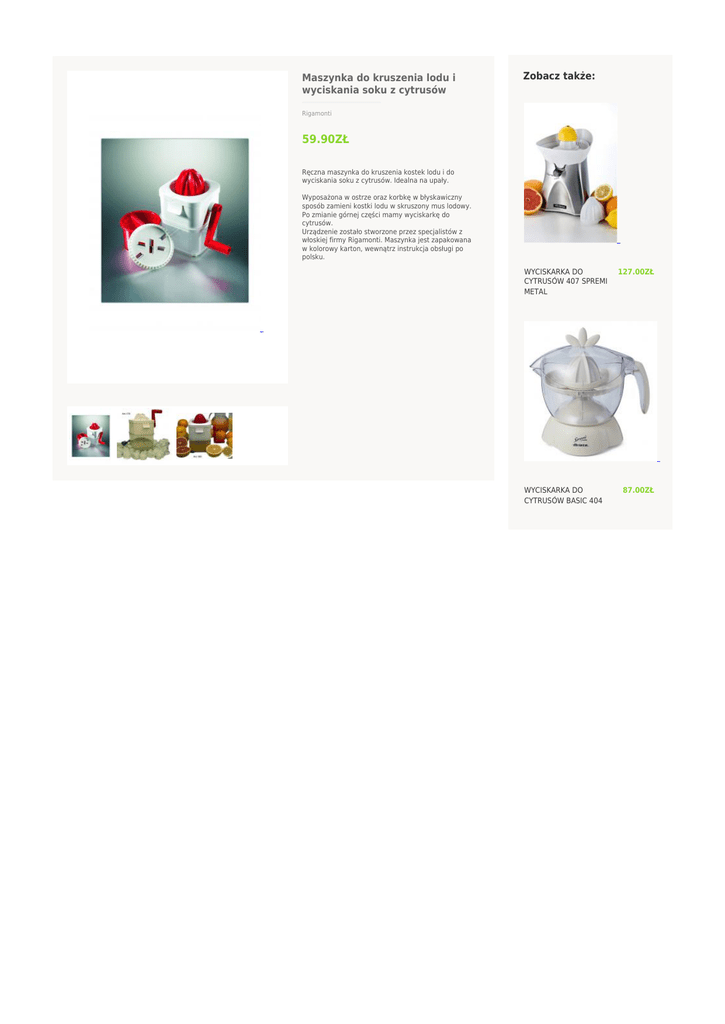 Maszynka do kruszenia lodu i wyciskania soku z cytrusów Zobacz także: Rigamonti 59.90ZŁ Ręczna maszynka do kruszenia kostek lodu i do wyciskania soku z cytrusów. Idealna na upały. Wyposażona w ostrze oraz korbkę w błyskawiczny sposób zamieni kostki lodu w skruszony mus lodowy. Po zmianie górnej części mamy wyciskarkę do cytrusów. Urządzenie zostało stworzone przez specjalistów z włoskiej firmy Rigamonti. Maszynka jest zapakowana w kolorowy karton, wewnątrz instrukcja obsługi po polsku. WYCISKARKA DO CYTRUSÓW 407 SPREMI METAL WYCISKARKA DO CYTRUSÓW BASIC 404 127.00ZŁ 87.00ZŁ