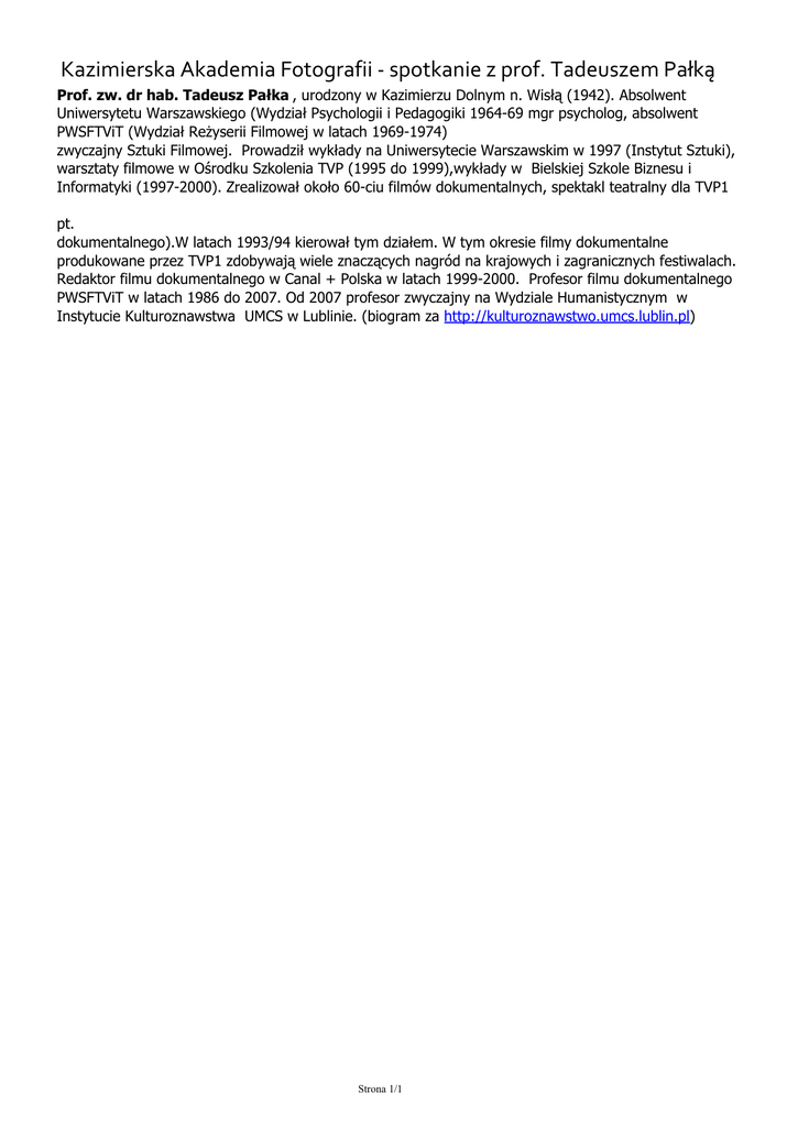Kazimierska Akademia Fotografii - spotkanie z prof. Tadeuszem Pałką Prof. zw. dr hab. Tadeusz Pałka , urodzony w Kazimierzu Dolnym n. Wisłą (1942). Absolwent Uniwersytetu Warszawskiego (Wydział Psychologii i Pedagogiki 1964-69 mgr psycholog, absolwent PWSFTViT (Wydział Reżyserii Filmowej w latach 1969-1974) zwyczajny Sztuki Filmowej. Prowadził wykłady na Uniwersytecie Warszawskim w 1997 (Instytut Sztuki), warsztaty filmowe w Ośrodku Szkolenia TVP (1995 do 1999),wykłady w Bielskiej Szkole Biznesu i Informatyki (1997-2000). Zrealizował około 60-ciu filmów dokumentalnych, spektakl teatralny dla TVP1 pt. dokumentalnego).W latach 1993/94 kierował tym działem. W tym okresie filmy dokumentalne produkowane przez TVP1 zdobywają wiele znaczących nagród na krajowych i zagranicznych festiwalach. Redaktor filmu dokumentalnego w Canal + Polska w latach 1999-2000. Profesor filmu dokumentalnego PWSFTViT w latach 1986 do 2007. Od 2007 profesor zwyczajny na Wydziale Humanistycznym w Instytucie Kulturoznawstwa UMCS w Lublinie. (biogram za http://kulturoznawstwo.umcs.lublin.pl) Strona 1/1 Powered by TCPDF (www.tcpdf.org)