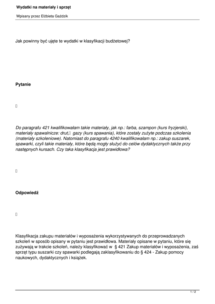 Wydatki na materiały i sprzęt Wpisany przez Elżbieta Gaździk Jak powinny być ujęte te wydatki w klasyfikacji budżetowej? Pytanie Do paragrafu 421 kwalifikowałam takie materiały, jak np.: farba, szampon (kurs fryzjerski), materiały spawalnicze: drut, gazy (kurs spawania), które zostały zużyte podczas szkolenia (materiały szkoleniowe). Natomiast do paragrafu 4240 kwalifikowałam np.: zakup suszarek, spawarki, czyli takie materiały, które będą mogły służyć do celów dydaktycznych także przy następnych kursach. Czy taka klasyfikacja jest prawidłowa? Odpowiedź Klasyfikacja zakupu materiałów i wyposażenia wykorzystywanych do przeprowadzanych szkoleń w sposób opisany w pytaniu jest prawidłowa. Materiały opisane w pytaniu, które się zużywają w trakcie szkoleń, należy klasyfikować w § 421 Zakup materiałów i wyposażenia, zaś sprzęt typu suszarki czy spawarki podlegają zaklasyfikowaniu do § 424 - Zakup pomocy naukowych, dydaktycznych i książek. 1/2 Wydatki na materiały i sprzęt Wpisany przez Elżbieta Gaździk Wszelkie wydatki ponoszone przez jednostki budżetowe, niezbędne do poniesienia dla zapewnienia prawidłowego działania jednostki winny być klasyfikowane na podstawie rozporządzenia Ministra finansów z 2 marca 2010 r. w sprawie szczegółowej klasyfikacji dochodów, wydatków, przychodów i rozchodów oraz środków pochodzących ze źródeł zagranicznych (Dz.U. z 2010 r. nr 38, poz. 207). Uwzględniając przepisy powołanego rozporządzenia, a zwłaszcza załącznika nr 4, jednostka powinna poprzedzić zastosowanie odpowiednich podziałek klasyfikacji budżetowej każdorazową analizą. Jak widać z opisu pytania. Podstawa prawna: załącznik nr 4 do rozporządzenia Ministra Finansów z 2 marca 2010 r. w sprawie szczegółowej klasyfikacji dochodów, wydatków, przychodów i rozchodów oraz środków pochodzących ze źródeł zagranicznych (Dz.U. z 2010 r. nr 38, poz. 207). 2/2
