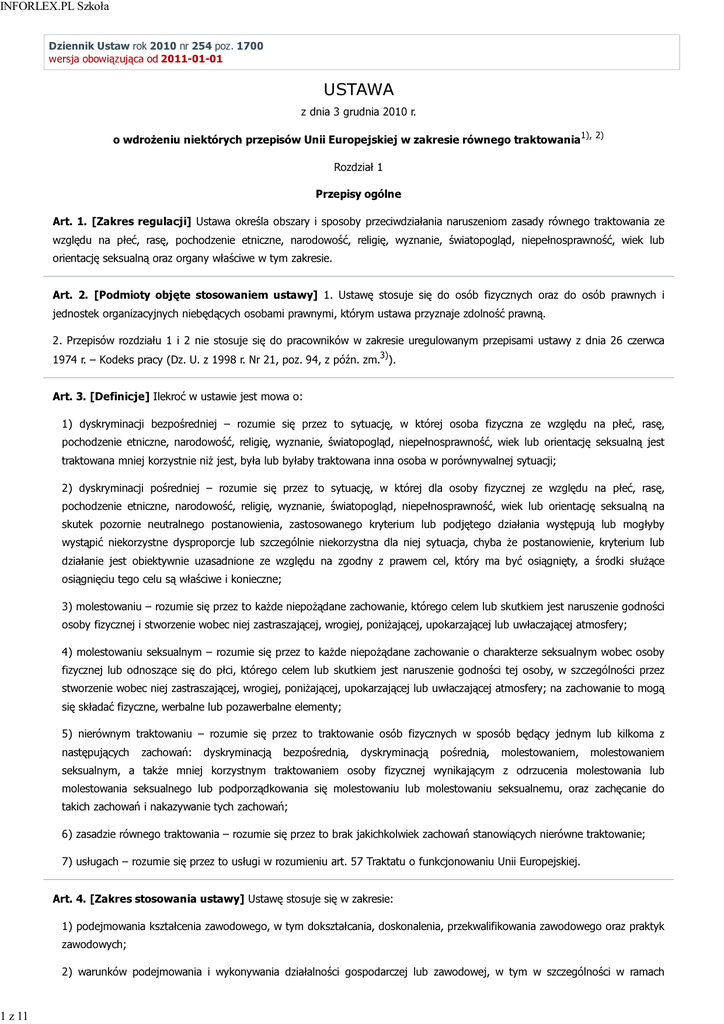 INFORLEX.PL Szkoła 1 z 11 Dziennik Ustaw rok 2010 nr 254 poz. 1700 wersja obowiązująca od 2011-01-01 USTAWA z dnia 3 grudnia 2010 r. o wdrożeniu niektórych przepisów Unii Europejskiej w zakresie równego traktowania1), 2) Rozdział 1 Przepisy ogólne Art. 1. [Zakres regulacji] Ustawa określa obszary i sposoby przeciwdziałania naruszeniom zasady równego traktowania ze względu na płeć, rasę, pochodzenie etniczne, narodowość, religię, wyznanie, światopogląd, niepełnosprawność, wiek lub orientację seksualną oraz organy właściwe w tym zakresie. Art. 2. [Podmioty objęte stosowaniem ustawy] 1. Ustawę stosuje się do osób fizycznych oraz do osób prawnych i jednostek organizacyjnych niebędących osobami prawnymi, którym ustawa przyznaje zdolność prawną. 2. Przepisów rozdziału 1 i 2 nie stosuje się do pracowników w zakresie uregulowanym przepisami ustawy z dnia 26 czerwca 1974 r. – Kodeks pracy (Dz. U. z 1998 r. Nr 21, poz. 94, z późn. zm.3)). Art. 3. [Definicje] Ilekroć w ustawie jest mowa o: 1) dyskryminacji bezpośredniej – rozumie się przez to sytuację, w której osoba fizyczna ze względu na płeć, rasę, pochodzenie etniczne, narodowość, religię, wyznanie, światopogląd, niepełnosprawność, wiek lub orientację seksualną jest traktowana mniej korzystnie niż jest, była lub byłaby traktowana inna osoba w porównywalnej sytuacji; 2) dyskryminacji pośredniej – rozumie się przez to sytuację, w której dla osoby fizycznej ze względu na płeć, rasę, pochodzenie etniczne, narodowość, religię, wyznanie, światopogląd, niepełnosprawność, wiek lub orientację seksualną na skutek pozornie neutralnego postanowienia, zastosowanego kryterium lub podjętego działania występują lub mogłyby wystąpić niekorzystne dysproporcje lub szczególnie niekorzystna dla niej sytuacja, chyba że postanowienie, kryterium lub działanie jest obiektywnie uzasadnione ze względu na zgodny z prawem cel, który ma być osiągnięty, a środki służące osiągnięciu tego celu są właściwe i konieczne; 3) molestowaniu – rozumie się przez to każde niepożądane zachowanie, którego celem lub skutkiem jest naruszenie godności osoby fizycznej i stworzenie wobec niej zastraszającej, wrogiej, poniżającej, upokarzającej lub uwłaczającej atmosfery; 4) molestowaniu seksualnym – rozumie się przez to każde niepożądane zachowanie o charakterze seksualnym wobec osoby fizycznej lub odnoszące się do płci, którego celem lub skutkiem jest naruszenie godności tej osoby, w szczególności przez stworzenie wobec niej zastraszającej, wrogiej, poniżającej, upokarzającej lub uwłaczającej atmosfery; na zachowanie to mogą się składać fizyczne, werbalne lub pozawerbalne elementy; 5) nierównym traktowaniu – rozumie się przez to traktowanie osób fizycznych w sposób będący jednym lub kilkoma z następujących zachowań: dyskryminacją bezpośrednią, dyskryminacją pośrednią, molestowaniem, molestowaniem seksualnym, a także mniej korzystnym traktowaniem osoby fizycznej wynikającym z odrzucenia molestowania lub molestowania seksualnego lub podporządkowania się molestowaniu lub molestowaniu seksualnemu, oraz zachęcanie do takich zachowań i nakazywanie tych zachowań; 6) zasadzie równego traktowania – rozumie się przez to brak jakichkolwiek zachowań stanowiących nierówne traktowanie; 7) usługach – rozumie się przez to usługi w rozumieniu art. 57 Traktatu o funkcjonowaniu Unii Europejskiej. Art. 4. [Zakres stosowania ustawy] Ustawę stosuje się w zakresie: 1) podejmowania kształcenia zawodowego, w tym dokształcania, doskonalenia, przekwalifikowania zawodowego oraz praktyk zawodowych; 2) warunków podejmowania i wykonywania działalności gospodarczej lub zawodowej, w tym w szczególności w ramach INFORLEX.PL Szkoła 2 z 11 stosunku pracy albo pracy na podstawie umowy cywilnoprawnej; 3) przystępowania i działania w związkach zawodowych, organizacjach pracodawców oraz samorządach zawodowych, a także korzystania z uprawnień przysługujących członkom tych organizacji; 4) dostępu i warunków korzystania z: a) instrumentów rynku pracy i usług rynku pracy określonych w ustawie z dnia 20 kwietnia 2004 r. o promocji zatrudnienia i instytucjach rynku pracy (Dz. U. z 2008 r. Nr 69, poz. 415, z późn. zm.4)) oferowanych przez instytucje rynku pracy oraz instrumentów rynku pracy i usług rynku pracy oferowanych przez inne podmioty działające na rzecz zatrudnienia, rozwoju zasobów ludzkich i przeciwdziałania bezrobociu, b) zabezpieczenia społecznego, c) opieki zdrowotnej, d) oświaty i szkolnictwa wyższego, e) usług, w tym usług mieszkaniowych, rzeczy oraz nabywania praw i energii, jeżeli są one oferowane publicznie. Art. 5. [Wyłączenie stosowania ustawy] Ustawy nie stosuje się do: 1) sfery życia prywatnego i rodzinnego oraz czynności prawnych pozostających w związku z tymi sferami; 2) treści zawartych w środkach masowego przekazu oraz ogłoszeniach w zakresie dostępu i dostarczania towarów i usług, w zakresie dotyczącym odmiennego traktowania ze względu na płeć; 3) swobody wyboru strony umowy, o ile tylko nie jest oparty na płci, rasie, pochodzeniu etnicznym lub narodowości; 4) usług edukacyjnych w zakresie dotyczącym odmiennego traktowania ze względu na płeć; 5) odmiennego traktowania ze względu na płeć w dostępie i warunkach korzystania z usług, rzeczy oraz nabywania praw lub energii, jeżeli ich zapewnienie wyłącznie lub głównie dla przedstawicieli jednej płci jest obiektywnie i racjonalnie uzasadnione celem zgodnym z prawem, a środki służące realizacji tego celu są właściwe i konieczne; 6) odmiennego traktowania co do możliwości i warunków podejmowania i wykonywania działalności zawodowej oraz podejmowania, odbywania i ukończenia nauki w zakresie kształcenia zawodowego, w tym w zakresie studiów wyższych, jeżeli rodzaj lub warunki wykonywania danej dzi