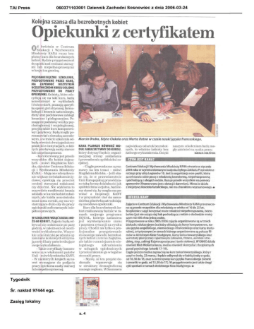 060371103001 Dziennik Zachodni Sosnowiec z dnia 2006-03-24 TAI Press Kolejna szansa dla bezrobotnych kobiet Opiekunki z certyfikatem kwietnia w Centrum Edukacji i Wychowania Młódź eży KANA rusza bezpla tny kurs dla bezrobotnych kobiet Będzie przygotowywał do opii tó nad osobami slarszymi In ) niepełnosprawnymi wkraji j i za granicą. PIĘCIOMIESIĘCZNE SZKOLENIE, PRZYGOTOWANE PRZEZ KANĘ, MA ZAPEWNIĆ WSZYSTKIM UCZESTNICZKOM KURSU SOLIDNE PRZYGOTOWANIE DO PRACY OPIEKUNKI. Kobiely, które zdecydują się na taki kurs, będą uczest liczyć w wykładach i ćwicz eniach, poznają specyfikę opii ki geriatrycznej, 1'armakologi i leczenia naturalnego, diety o raz podstawowe zabiegi leczniirze i pielęgnacyjne. Poznają t ;ż podstawy wiedzy psycholog icznej i socjologicznej, przejd j także kurs komputerowy i je łykowy. Będą mogły porozma wiać z doradcą zawodowym, i i w trakcie szkolenia odbędą n iwnież dwutygodniowe prakty ki w instytucjach, w których p -zebywają osoby starsze lub nie pełnosprawne. - Ki irs kierowanyjest przede wszystkim dla kobiet dojrzałych - mówi Magdalena Kieł ska, dj rektor Centrum Edukacji i V Wychowania Młodzieży KANA - Mają one zdecydowanie wi ;ksze doświadczenie życiowe, opiekują się przecież swoimi starszymi rodzicami czy dziećmi. Nie wyklucza to oczywiście możliwości brania udziału w kursie kobiet młodszych, ale każda uczestniczka musi s ama ocenić, czy ma wystarczająco dużo siły do pracy opieki inki osób starszych i niepełnos prawnych. W SZKOLENIU WZIĄĆ UDZIAŁ MO ŻE 60 iłOBIET. Zajęcia będą odbywać się codziennie po parę godzir , w zależności od możliwości wykładowców. _ ___ Wszystkie uc lestniczki po zdaniu egzamin uw końcowych otrzymają certyfikaty potwierdzające swoje vykształcenie. -T; kie certyfikaty honorowane ;ą w większości państw Unii, nowi dyrektorka KANY. - W niektórych krajach są nawet wymagane do podjęcia pracy jpiekuna osoby starszej lub nii jpelnosprawnej. Marcin Oruba, Edyta Ciskała oraz Marta Raton w czasie nauki języka francuskiego. KANA PLANUJE RÓWNIEŻ MODUŁ FAKULTATYWNY DO KURSU, który dotyczył będzie organi zacyjnej strony zakładania i prowadzenia spółdzielni socjalnej. - Ciągle prowadzone są rozmowy na ten temat - mówi Magdalena Kielska. - Jeśli okaże się, że w prawodawstwie Unii Europejskiej przewidziano taką formę działalności jak spółdzielnia socjalna, będziemy starać się, by mogła ona powstać z inspiracji KANY i w przyszłości stać się samodzielną placówką zatrudniającą zawodowe opiekunki. Kurs dla bezrobotnych kobiet realizowany będzie w ra mach unijnego programu EQUAL, którego zadaniem jest wyrównywanie szans i poprawa sytuacji na rynku pracy. Chodzi nie tylko o profesjonalne przygotowanie do nowego zawodu bezrobotnych koniei z terenu Zagłębia, ale także o zmniejszenie nielegalnego zatrudnienia w usługach opiekuńczych i przekształcenie go w legalne stosunki pracy. - Myślę, że ten projekt doskonale wpasowuje się w strukturę demograficzną naszego regionu. W Sosnowcu Tygodnik Śr. nakład 97444 egz. Zasięg lokalny s. 4 największy odsetek bezrobot nych, to właśnie kobiety bez żadnego wykształcenia. Dzięki naszym szkoleniom będą mogły zaistnieć na rynku pracy, NATALIA DOUYCKA CZYM Jf ST KASA? Centrum Edukacji i Wychowania Młodzieży KANA otwarto w styczniu 2004 roku w wyremontowanym budynku byłego Zakładu Przyrodoleczniczego przy ulicy Legionów 10. Jest to organizacja non-prof it, która za cel stawia sobie pracę z młodzieżą bezrobotną, niepełnosprawną i pochodzącą z ubogich rodzin. Bazuje przede wszystkim na pomocy sponsorów (finansowana jest z dotacji i darowizn). Mimo że działa z inicjatywy Kościoła Katolickiego, nie ma charakteru wyznaniowego. • •.'OFERTA .KANY. Zajęcia w Centrum Edukacji i Wychowania Młodzieży KANA przeznaczone są przede wszystkim dla młodzieży w wieku od 16 do 25 lat. Bezpłatnie z zajęć korzystać może młodzież niepełnosprawna, bezrobotna (już nie ucząca się) lub pochodząca z rodzin o dochodzie mniejszym niż 600 zł na jedną osobę. Przygotowane w roku 2005/2006 zajęcia organizowane są w trzech blokach: edukacyjnym (na który składają się kursy komputerowe, nauka języka angielskiego, niemieckiego i francuskiego oraz kursy maturalne), artystycznym (w ramach którego organizowane są pokazy filmów w Ambitnym Kinie Studyjnym, kursy tańca towarzyskiego oraz warsztaty plastyczne) i sportowym (siłownia, fitness, aerobik l streching, step, zabiegi fizjoterapeutyczne i tenis stołowy). W KANIE działa również Klub Wolontariusza, można również skorzystać z bezpłatnych porad psychologa (wtorki 17-19). Ciągle jeszcze można zapisać się na kurs tańca towarzyskiego, który r uszył w środę, 22 marca, i będzie odbywał się w każdą środę w godz. od 16.30 do 18, oraz na intensywny kurs języka francuskiego (wtorki i czwartki w godz. od 15.30 do 17). W przygotowaniu jest także drugi cykl spotkań w ramach Ambitnego Kina Studyjnego. •