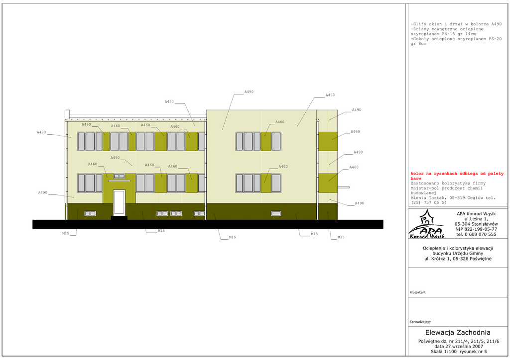 -Glify okien i drzwi w kolorze A490 -Ściany zewnętrzne ocieplone styropianem FS-15 gr 14cm -Cokoły ocieplone styropianem FS-20 gr 8cm A490 A490 A490 A490 A460 A460 A460 A460 A460 A460 A490 A490 A490 A460 A460 A460 A460 A460 A490 A490 M15 M15 M15 M15 kolor na rysunkach odbiega od palety barw Zastosowano kolorystykę firmy Majster-pol producent chemii budowlanej Mienia Tartak, 05-319 Cegłów tel. (25) 757 05 54 APA Konrad Wąsik ul.Leśna 1, 05-304 Stanisławów NIP 822-199-05-77 tel. 0 608 070 555 M15 Ocieplenie i kolorystyka elewacji budynku Urzędu Gminy ul. Krótka 1, 05-326 Poświętne Projektant Sprawdzający Elewacja Zachodnia Poświętne dz. nr 211/4, 211/5, 211/6 data 27 września 2007 Skala 1:100 rysunek nr 5 -Glify okien i drzwi w kolorze A490 -Ściany zewnętrzne ocieplone styropianem FS-15 gr 14cm -Cokoły ocieplone styropianem FS-20 gr 8cm A490 A490 A490 A460 A460 A460 A460 A460 A460 A490 A460 A460 A490 A460 A460 A460 kolor na rysunkach odbiega od palety barw Zastosowano kolorystykę firmy Majster-pol producent chemii budowlanej Mienia Tartak, 05-319 Cegłów tel. (25) 757 05 54 APA Konrad Wąsik ul.Leśna 1, 05-304 Stanisławów NIP 822-199-05-77 tel. 0 608 070 555 A490 M15 A490 M15 M15 A490 M15 Ocieplenie i kolorystyka elewacji budynku Urzędu Gminy ul. Krótka 1, 05-326 Poświętne Projektant Sprawdzający Elewacja Wschodnia Poświętne dz. nr 211/4, 211/5, 211/6 data 27 września 2007 Skala 1:100 rysunek nr 4 -Glify okien i drzwi w kolorze A490 -Ściany zewnętrzne ocieplone styropianem FS-15 gr 14cm -Cokoły ocieplone styropianem FS-20 gr 8cm A490 A490 A490 A490 A460 A460 A460 A460 A460 A460 A460 A490 A460 A460 A460 A460 A460 A460 A460 A490 A490 kolor na rysunkach odbiega od palety barw Zastosowano kolorystykę firmy Majster-pol producent chemii budowlanej Mienia Tartak, 05-319 Cegłów tel. (25) 757 05 54 APA Konrad Wąsik ul.Leśna 1, 05-304 Stanisławów NIP 822-199-05-77 tel. 0 608 070 555 A490 M15 M15 A490 M15 A490 M15 Ocieplenie i kolorystyka elewacji budynku Urzędu Gminy ul. Krótka 1, 05-326 Poświętne Projektant Sprawdzający Elewacja Południowa Poświętne dz. nr 211/4, 211/5, 211/6 data 27 września 2007 Skala 1:100 rysunek nr 3 -Glify okien i drzwi w kolorze A490 -Ściany zewnętrzne ocieplone styropianem FS-15 gr 14cm -Cokoły ocieplone styropianem FS-20 gr 8cm A490 A490 A490 A460 A460 A460 A460 A490 A460 A460 A460 A460 A490 kolor na rysunkach odbiega od palety barw Zastosowano kolorystykę firmy Majster-pol producent chemii budowlanej Mienia Tartak, 05-319 Cegłów tel. (25) 757 05 54 APA Konrad Wąsik ul.Leśna 1, 05-304 Stanisławów NIP 822-199-05-77 tel. 0 608 070 555 M15 A490 A490 A490 M15 M15 Ocieplenie i kolorystyka elewacji budynku Urzędu Gminy ul. Krótka 1, 05-326 Poświętne Projektant Sprawdzający Elewacja Północna Poświętne dz. nr 211/4, 211/5, 211/6 data 27 września 2007 Skala 1:100 rysunek nr 2