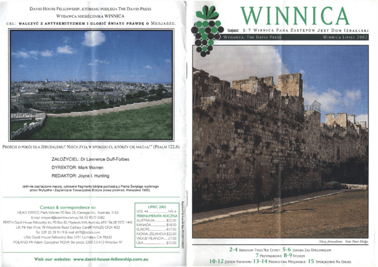 D A V I D H O U S E FELLOWSHIP, K T Ó R E M U PODLEGA T H E D A V I D PRESS W Y D A W C A MIESIĘCZNIKA W I N N I C A CEL: WALCZYĆ Z ANTYSEMITYZMEM I GŁOSIĆ ŚWIATU PRAWDĘ o MESJASZU. PROŚCIE o POKÓJ DLA JERUZALEMU! NIECH ŻYJĄ W SPOKOJU C I , KTÓRZY CIĘ MILLIJĄ!" (PSALM 122,6) ZAŁOŻYCIEL: Dr Lawrence Duff-Forbes DYREKTOR: Mark Warren REDAKTOR: Joyce I. Hunting Jeśli nie zaznaczono inaczej, cytowane fragmenty biblijne p o c h o d z ą z Pisma Świętego wydanego przez Brytyjskie I Zagraniczne Towarzystwo Biblijne (nowy przekład, Warszawa 1985). Contact & correspondence to: HEAD OFFICE: Mark Warren PO Box 25, Carnegie,Vic, Australia. 3163 E-mail [email protected] Tej. 03 9570 5582 PERTH: David House Fellowship Inc. PO Box 82, Maylands,WAAustralia 6931 Tel. 08 9272 1442 UK: Mr Ken Price 78 Woodyille Road Cathays CardifT; WALES CF24 4ED Tel. 029 20 39 9 I 19 E-mail [email protected] USA: David House Fellowship Box 2191 La Habra, CA 90632 POIWND: Mr Adam CzwojdrakTIQVA Skr poczt. 2300 53-413 Wrocław 47 LIPIEC 2002 V O L 44 NR 6 PERENUMERATA R O C Z N A AUSTRALIA $22.00 KANADA $ 18.00 EUROPĘ NOWA €17.00 ZELA,NDIA.$22.00 WLK.B/IRI^NDIA USA £7.00 Mury Jeruzalemu $15.00 2-4 Yisit our website: www.david-house-fellowship.com.au ABRAHAM T E G O N I E C Z Y N I T 5-6 7 P R Z Y P A D K O W E 8-9 10-12 J E S T E M N I E W I N N Y 13-14 Foto Peter Malgo JAKUBA ZAS UMIŁOWAŁEM SYCHEM PROROCTWA M E S J A Ń S K I E 15 SPORJRZENIE N A IZRAEL ^ m m Poczynając od I wieku p.n.e. do II wieku n.e. za „Wtedy rzekli do niego: Gdzie jest Sara, żona Wysłuchał poselstwa i przyjął je jak obietnicę. Jego głoszącego prawdę. Ponadto cuda tego rodzaju, duchowych przywódców Izraela uchodzili faryzeusze twoja? A on odpowiedział: W tym oto namiocie. serce było gotowe przyjąć nadzieję. Umysł nie jakich On dokonywał, w szczególny sposób i saduceusze. Cieszyli się czcią i poważaniem. Tedy rzekł [gość]: Na pewno wrócę do ciebie za wykluczał tego, co niemożliwe. Przyjął gości - i świadczyły o pochodzeniu Jego poselstwa nie od Słynęli z dobrych uczynków, miłosierdzia dla chorych rok o tym samym czasie, a wtedy żona twoja przyjął wieść, jaką mu oni przynieśli. Ciekawe, że ludzi, ale od Boga. Tymczasem ówcześni przywódcy i wdów - i ze znajomości Pisma Świętego. Żydzi Sara będzie miała syna. mimo iż nie byłby w stanie sprawdzić jej duchowi nie tylko odrzucali Jego słowa, ale wręcz wiarygodności do momentu, aż Sara zaczęłaby usiłowali Go zgładzić. Abraham by tak nie postąpił. darzyli ich wielką estymą. Regularnie modlili się i pościli, żarliwie szukali Boga i starali się naśladować swego przodka Abrahama. Studiowali pod okiem słynnych nauczycieli, których życie stanowiło przykład godny naśladowania. Nie wszystko jednak było bez zarzutu. „Wiem, że jesteście potomstwem Abrahama, lecz chcecie Mnie zabić" (Ew. Jana 8,37). Zdumiewające - oto powszechnie szanowani potomkowie Abrahama nie chcą przyjąć słowa Jeszuy. Tak jak gdyby ich umysły były zamknięte na wszystko, 00 Jeszua ma do powiedzenia: „słowo Moje nie ma do was przystępu". „Odpowiadając, rzekli Mu: Abraham jest naszym ojcem". A Jeszua odpowiedział: „Jeżeli jesteście dziećmi Abrahama, spełniajcie u c ^ n k i Abrahama" (J 8,38). Innymi słowy - gdyby Abraham żył, słuchałby słów Jeszuy. i choć ludzie ci mogli się „Sara zaś podsłuchiwała u wejścia do namiotu, które było za nim. A Abraham i Sara byli starzy, w podeszłym wieku. Ustało zaś już u Sary to, co zwykle bywa u kobiet. Toteż roześmiała się Sara sama do siebie, mówiąc: Teraz, gdy się zestarzałam, mam tej rozkoszy zażywać! I pan mój jest stary!" (1 Ks. Mojżeszowa 8,9-12). My nie jesteśmy zrodzeni z nierządu; mamy wypełnienia. I rzeczywiście, Sara urodziła Jednego Ojca, Boga" (J 8,41). Niestety, od razu obiecanego Izaaka. odrzucili Jeszuę, nie siląc się na próbę rozważenia A gdyby działo się to w czasach Jeszuy? Gdyby Boże miłosierdzie, a jego umysł otwarty na nie. „żona twoja Sara urodzi ci syna i nazwiesz go Abraham czekałby na potwierdzenie słów Jeszuy. imieniem Izaak, a Ja ustanowię przymierze Moje z nim jako przymierze wieczne dla jego potomstwa po nim" (1 Mojż 17,19). Za drugim jednak razem posłaniec Pana zapytał: „Gdzie jest Sara, żona twoja?". A ona stała u wejścia do namiotu. I tym razem usłyszała obietnicę - i śmiała się z niej, podobnie jak Abraham, gdy usłyszał tę roześmiała się Sara, mówiąc: Czyżbym naprawdę mogła rodzić, gdy się zestarzałam? Czy jest cokolwiek niemożliwego dla PANA?" (1 Mojż 18,13-14). A zatem i Abraham, i Sara śmiali się, kiedy po raz Przyjęli gościnę i wdali się z Abrahamem w pierwszy usłyszeli tę zapowiedź. Za drugim jednak pogawędkę. razem Abraham udzielił posłańcowi gościny. WINNICA Abrahama Bóg musiał doprowadzić do jej pierwszym razem, kiedy Pan obiecywał Abrahamowi: powstał i zaprosił gości na posiłek i odpoczynek. 2 spełniacie uczynki swojego ojca. Na to Mu rzekli: Jego poselstwo, gdyż serce Abrahama było czułe na „Na to rzekł PAN do Abrahama: Dlaczego to Mamre. Gdy tak odpoczywał w cieniu drzewa, obietnica była od Pana Boga, to w przekonaniu obietnicę. Sara najpewniej nie była obecna za czyny ich przodka, w tym przypadku nie zachowywali zbliżyło się do niego trzech mężów. Abraham Abrahama. Jeszua oskarżył ich zresztą: „Wy Abraham żył w czasach Jeszuy, przyjąłby Jego i wieść pierwszy raz. Pewnego razu Abraham siedział pod dębem w Postępując tak, dowodzili, że nie są wcale dziećmi był gotów złożyć tę sprawę w Bożych rękach. Jeśli Już po raz drugi usłyszał zatem Abraham tę samą szczycić wieloma dobrymi uczynkami, naśladującymi się tak, jak on by się zachował. przejawiać pierwsze oznaki brzemienności, to jednak Taka była jego postawa. Jego słów i cudów. Jego słowa nie miały dla nich znaczen