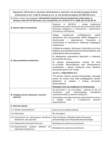 Zapytanie ofertowe w sprawie zamówienia o wartości nie przekraczającej kwoty wskazanej w art. 4 pkt 8 ustawy p.z.p. tj. nie przekraczającej 30 000,00 euro. 1) Nazwa i adres zamawiającego: Wojewódzki Inspektorat Ochrony Środowiska w Warszawie, ul. Bartycka 110A, 00-716 Warszawa, woj. mazowieckie, tel. 22 651 07 07 w. 2008, faks 22 651 06 76. Zapytanie nr 109/2016 – Usługa świadczenia profilaktycznej opieki zdrowotnej dla pracowników WIOŚ Warszawa Delegatura w Ciechanowie i Laboratorium Pracownia w Ciechanowie. 2) Nazwa nadana zamówieniu: Usługa świadczenia profilaktycznej opieki zdrowotnej dla pracowników WIOŚ Delegatura w Ciechanowie i Laboratorium Pracownia w Ciechanowie ul. Strażacka 6, obejmuje następujące świadczenia: a) Badania wstępne, okresowe i kontrolne oraz inne badania, do prowadzenia których Zleceniodawca jest zobowiązany jako pracodawca, b) Wydawania zaświadczeń lekarskich o zdolności pracownika do pracy. 3) Opis przedmiotu zamówienia: W okresie obowiązywania umowy do dnia 31.12.2018r. Zleceniodawca zleci Zleceniobiorcy przebadanie z zakresu medycyny pracy (badania okresowe) łącznie 34* osoby, zgodnie z załącznikiem nr1. *W okresie trwania umowy Zamawiający zastrzega prawo do zmiany listy osób podlegającym danym badaniom w związku z rotacją personelu Zleceniodawcy. Placówka musi się znajdować w Ciechanowie. Od 01.01.2017 r. do 31.12.2018r. , płatność 21 dni od otrzymania przez Zamawiającego prawidłowo wystawionej faktury, płatność miesięczna. 4) Pożądany termin wykonania i warunki płatności Zamawiający zastrzega możliwość wypowiedzenia umowy w każdym czasie z 1-miesięcznym okresem wypowiedzenia. 5) Warunki udziału: 5.1) Wiedza i doświadczenie: Konieczne do realizacji zadania. 5.2) Referencje: Nie wymagane. 5.3) Uprawnienia do wykonywania określonej Wpis do Rejestru Zakładów Opieki Zdrowotnej działalności lub czynności: prowadzonego przez Wojewodę Mazowieckiego. 5.4) Odpowiedni potencjał techniczny: 5.5) Dysponowanie osobami wykonania zamówienia: zdolnymi Niezbędny do wykonania zamówienia. do Niezbędne do wykonania zamówienia. 6) Miejsce i forma składania zgłoszeń: Siedziba Delegatury WIOŚ w Ciechanowie ul. Strażacka 6, 06-400 Ciechanów: osobiście w godzinach pracy Inspektoratu lub drogą pocztową (decyduje data wpływu do WIOŚ) lub drogą elektroniczną na e-mail: [email protected] (w temacie wiadomości prosimy wpisać: „Oferta do zapytania nr 109/2016”). 7) Termin składania zgłoszeń: Do dnia 30.11.2016 r. 8) 1. 2. 3. Osoba do kontaktu ze strony Zamawiającego: Marzena Kudriawcew, Tel.(23) 672 38 62 Wojewódzki Inspektorat Ochrony Środowiska w Warszawie w przypadku zaakceptowania zakupu przez kierownika jednostki i zagwarantowania finansowania realizacji zamówienia, spośród prawidłowo zgłoszonych kandydatur wybierze podmiot, któremu powierzy realizację zamówienia. Wojewódzki Inspektorat Ochrony Środowiska w Warszawie zastrzega sobie prawo kontaktu jedynie z wybranymi podmiotami. Niniejsze ogłoszenie nie stanowi oferty w rozumieniu kodeksu cywilnego i nie może stanowić podstawy do wysuwania roszczeń względem Wojewódzkiego Inspektoratu Ochrony Środowiska w Warszawie. FORMULARZ ZGŁOSZENIA W ZAŁĄCZENIU II ZASTĘPCA MAZOWIECKIEGO WOJEWÓDZKIEGO INSPEKTORA OCHRONY ŚRODOWISKA /-/ Joanna Piekutowska Dn. 23.11.2016 r. Załącznik nr 1 do zapytania ofertowego nr 109/2016 Zakres i ilość planowanych badań W okresie obowiązywania umowy do dnia 31.12.2018r. Zleceniodawca zleci Zleceniobiorcy przebadanie z zakresu medycyny pracy (badania okresowe) łącznie 34 osoby*: a) 3 * osoby na stanowisku biurowym - praca przy monitorze komputerowym; -Konsultacja okulistyczna, -Zaświadczenie lekarza medycyny pracy, b) 5 * osób na stanowisku inspektor w terenie – praca przy monitorze komputerowym; -Konsultacja okulistyczna, -Zaświadczenie lekarza medycyny pracy, c) 6* osób na stanowisku inspektor- praca w terenie, praca przy monitorze komputerowym, prowadzenie pojazdów służbowych; -Glukoza, EKG, -Konsultacja laryngologiczna, -Konsultacja neurologiczna, -Konsultacja okulistyczna -Zaświadczenie lekarza medycyny pracy, -Psychotechnika, d) 3* osoby na stanowisku specjalisty - pobierający próby na wysokości + prowadzenie pojazdów służbowych, mający kontakt z kwasami i rozpuszczalnikami; -Badania analityczne ( mocz badanie ogólne, morfologia, OB., retykulocyty, bilirubina całkowita, transaminazy, GGTP), -Spirometria -Glukoza, -EKG, -Konsultacja laryngologiczna, -Konsultacja neurologiczna, -Konsultacja okulistyczna, -Zaświadczenie lekarza medycyny pracy, -Psychotechnika, e) 4* osoby pracujące na stanowisku kierowniczym, decyzyjnym; -Praca przy monitorze komputerowym, -Cholesterol, -EKG, -Konsultacja okulistyczna, -Zaświadczenie od lekarza medycyny pracy, f) 1* osoba na stanowisku pracownik pobierający próby na wysokości do 3 metrów i wykonujący analizy, mający kontakt z kwasami, rozpuszczalnikami praca przy monitorze ekranowym; -Badania analityczne ( mocz badanie ogólne, morfologia, OB., retykulocyty, bilirubina całkowita, transaminazy, GGTP), -Spirometria, -Konsultacja laryngologiczna, -Konsultacja neurologiczna, -Konsultacja okulistyczna, -Zaświadczenie lekarza medycyny pracy, g) 1* osoba Kierowca* -Glukoza, -EKG, -Konsultacja laryngologiczna, -Konsultacja neurologiczna, -Konsultacja okulistyczna, -Zaświadczenie lekarza medycyny pracy, -Psychotechnika, h) 6* osób na stanowisku pracownik laboratorium wykonujący analizy, mający kontakt z kwasami ,rozpuszczalnikami , monitorem komputerowym; -Badania analityczne ( mocz badanie ogólne, morfologia, OB., retykulocyty, bilirubina całkowita, transaminazy, GGTP), -spirometria, -Konsultacja okulistyczna, -Zaświadczenie lekarza medycyny pracy, i) 1* osoba – radca prawny (niepełny wymiar czasu pracy); -zaświadczenie lekarza medycyny pracy, j) 1* osoba – Informatyk (niepełny wymiar czasu pracy); -Zaświadczen