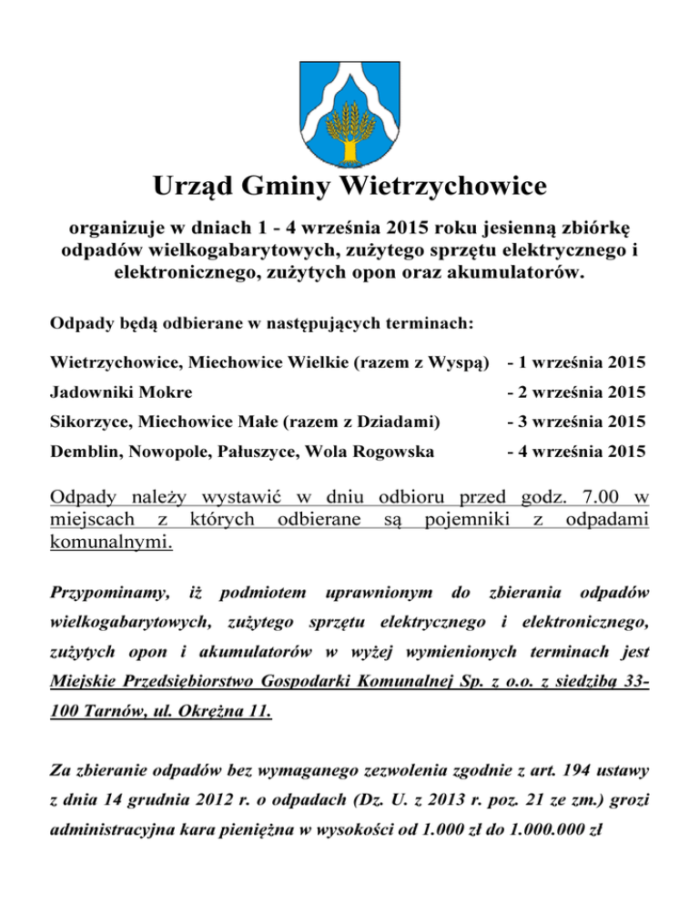 Urząd Gminy Wietrzychowice organizuje w dniach 1 - 4 września 2015 roku jesienną zbiórkę odpadów wielkogabarytowych, zużytego sprzętu elektrycznego i elektronicznego, zużytych opon oraz akumulatorów. Odpady będą odbierane w następujących terminach: Wietrzychowice, Miechowice Wielkie (razem z Wyspą) - 1 września 2015 Jadowniki Mokre - 2 września 2015 Sikorzyce, Miechowice Małe (razem z Dziadami) - 3 września 2015 Demblin, Nowopole, Pałuszyce, Wola Rogowska - 4 września 2015 Odpady należy wystawić w dniu odbioru przed godz. 7.00 w miejscach z których odbierane są pojemniki z odpadami komunalnymi. Przypominamy, iż podmiotem uprawnionym do zbierania odpadów wielkogabarytowych, zużytego sprzętu elektrycznego i elektronicznego, zużytych opon i akumulatorów w wyżej wymienionych terminach jest Miejskie Przedsiębiorstwo Gospodarki Komunalnej Sp. z o.o. z siedzibą 33100 Tarnów, ul. Okrężna 11. Za zbieranie odpadów bez wymaganego zezwolenia zgodnie z art. 194 ustawy z dnia 14 grudnia 2012 r. o odpadach (Dz. U. z 2013 r. poz. 21 ze zm.) grozi administracyjna kara pieniężna w wysokości od 1.000 zł do 1.000.000 zł w ramach zbiórki odebrane zostaną: Meblościanki, meble kuchenne, szafy, kredensy, fotele, wersalki, narożniki, kanapy, sofy, pufy, stoły, krzesła, łóżka, stoliki wszelkiego rodzaju, regały, umywalki, muszle klozetowe, dywany, wykładziny. Chłodziarki, zamrażarki, pralki, suszarki do ubrań, zmywarki, mikrofalówki, grzejniki elektryczne, wentylatory elektryczne, odkurzacze, zmiatacze dywanów, żelazka, tostery, frytkownice, nożyce elektryczne, wagi, komputery kieszonkowe i biurowe, elektryczne i elektroniczne maszyny do pisania, faksy teleksy, telefony, telefony komórkowe, radia, telewizory, kamery video, sprzęt hi-fi, wzmacniacze dźwięku, maszyny do szycia. Lampy fluorescencyjne, niskoprężne lampy sodowe, wiertarki, piły, zabawki, kolejki elektryczne tory wyścigowe, gry wideo, kieszonkowe konsole do gier. Zużyte akumulatory i opony. ZBIÓRKA NIE DOTYCZY bieżących śmieci domowych, gruzu, styropianu, opakowań po środkach ochrony roślin i odzieży. Szczegółowe informacje można uzyskać w Urzędzie Gminy Wietrzychowice pok. nr 2, tel. 14 641 80 45 wew. 2 lub pod adresem e-mail: [email protected]