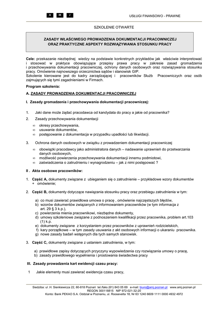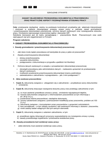 A M J USŁUGI FINANSOWO - PRAWNE SZKOLENIE OTWARTE ZASADY WŁAŚCIWEGO PROWADZENIA DOKUMENTACJI PRACOWNICZEJ ORAZ PRAKTYCZNE ASPEKTY ROZWIĄZYWANIA STOSUNKU PRACY Cele: przekazanie niezbędnej wiedzy na podstawie konkretnych przykładów jak właściwie interpretować i stosować w praktyce obowiązujące przepisy prawa pracy w zakresie zasad gromadzenia i przechowywania dokumentacji pracowniczej, ochrony danych osobowych oraz rozwiązywania stosunku pracy. Omówienie najnowszego orzecznictwa sądów i stanowisk GIP. Szkolenie kierowane jest do kadry zarządzającej i pracowników SłuŜb Pracowniczych oraz osób zajmujących się tymi zagadnieniami w Firmach. Program szkolenia: A. ZASADY PROWADZENIA DOKUMENTACJI PRACOWNICZEJ I. Zasady gromadzenia i przechowywania dokumentacji pracowniczej: 1. Jaki dane moŜe Ŝądać pracodawca od kandydata do pracy a jakie od pracownika? 2. Zasady przechowywania dokumentacji • • • 3. okresy przechowywania, usuwanie dokumentów, postępowanie z dokumentacja w przypadku upadłości lub likwidacji. Ochrona danych osobowych w związku z prowadzeniem dokumentacji pracowniczej • • • obowiązki pracodawcy jako administratora danych – nadawanie uprawnień do przetwarzania danych osobowych, moŜliwość powierzenia przechowywania dokumentacji innemu podmiotowi, zaświadczenia o zatrudnieniu i wynagrodzeniu – jak z nimi postępować ? II . Akta osobowe pracowników: 1. Część A, dokumenty związane z ubieganiem się o zatrudnienie – przykładowe wzory dokumentów + omówienie; 2. Część B, dokumenty dotyczące nawiązania stosunku pracy oraz przebiegu zatrudnienia w tym: a) co musi zawierać prawidłowa umowa o pracę , omówienie najczęstszych błędów, b) wzorów dokumentów związanych z informowaniem pracowników (w tym informacja z art. 29 § 3 k.p.), c) powierzenia mienia pracownikowi, niezbędne dokumenty, d) umowy szkoleniowe związane z podnoszeniem kwalifikacji przez pracownika, problem art.103 (1) k.p. e) dokumenty związane z korzystaniem przez pracowników z uprawnień rodzicielskich, f) kary porządkowe – w tym zasady usuwania z akt osobowych informacji o ukaraniu pracownika. g) nowe zasady badań wstępnych dla tych samych stanowisk. 3. Część C, dokumenty związane z ustaniem zatrudnienia, w tym: a) prawidłowe zapisy dotyczących przyczyny wypowiedzenia czy rozwiązania umowy o pracę, b) zasady prawidłowego wypełnienia i prostowania świadectwa pracy III. Zasady prowadzenia kart ewidencji czasu pracy: 1 Jakie elementy musi zawierać ewidencja czasu pracy, Siedziba: ul .H. Sienkiewicza 22, 60-818 Poznań tel./faks (61) 843 05 69 e-mail: [email protected] www.amj.poznan.pl REGON 300118815 NIP 972-021-32-20 Konto: Bank PEKAO S.A. Oddział w Poznaniu, ul. Roosevelta 18, Nr 63 1240 6609 1111 0000 4932 4972 A 2. 3. 4. M J USŁUGI FINANSOWO - PRAWNE Papierowa czy elektroniczna? Zakres ewidencji dla kadry zarządzającej i pracowników z zadaniowym czasem oraz otrzymujących ryczałt za prace w porze nocnej i godzinach nadliczbowych. Skutki braku lub niewłaściwej ewidencji czasu pracy – orzecznictwo Sądu NajwyŜszego. B. PRAKTYCZNE ASPEKTY ROZWIĄZYWANIA STOSUNKU PRACY 1. Zasady rozwiązywania umów o pracę w drodze wypowiedzenia oraz za porozumieniem stron: • • • • • • • • • • • przygotowywanie wypowiedzeń umów o pracę, oświadczeń o rozwiązaniu umowy o pracę, porozumień rozwiązujących umowy o pracę, formułowanie dobrej przyczyny wypowiedzenia umowy o pracę z przyczyn leŜących po jego stronie (m.in. częste, powtarzające się zwolnienia lekarskie) oraz po stronie pracodawcy, zasady rozwiązywania umów o pracę zawartych na okres próbny, na czas określony, tryb konsultowania ze związkami, sposoby obliczania terminów wypowiedzeń, zasady prawidłowego doręczania pism wypowiadających umowę o pracę, konstruowanie porozumienia rozwiązującego stosunek pracy, zasady wypowiadania umów o pracę pracownikom chronionym: - działacze związkowi, - kobiety w ciąŜy, - osoby w wieku przedemerytalnym, - praca zamiast urlopu wychowawczego Kiedy szczególna ochrona? dopuszczalność rozwiązania stosunku pracy w wyniku wypowiedzenia warunków pracy lub płacy moŜliwe roszczenia pracownicze na skutek wadliwego wypowiedzenia stosunku pracy omówienie kazusów orzecznictwa Sądu NajwyŜszego. 2. Zasady rozwiązywania umów o pracę w trybie natychmiastowym: • dopuszczalne przyczyny rozwiązania umowy o pracę w trybie dyscyplinarnym tj. z winy pracownika ( art. 52 k.p.), • zasady rozwiązywania umów o pracę w trybie natychmiastowym bez winy pracownika ( długotrwała choroba) (art. 53 k.p.) • tryb konsultacji ze związkiem zawodowym, • zasady doręczania rozwiązania stosunku pracy, • rozwiązanie stosunku pracy przez pracownika „ z winy pracodawcy” (art. 55 k.p. ), • moŜliwe roszczenia pracownicze na skutek wadliwego wypowiedzenia stosunku pracy • omówienie kazusów orzecznictwa Sądu NajwyŜszego. C. PYTANIA I ODPOWIEDZI ORAZ INDYWIDULANE KONSULTACJE. Metodyka: zajęcia prowadzone są w formie wykładu połączonego z ćwiczeniami, dyskusją i indywidualnymi konsultacjami. Konsultacje mają na celu wskazanie moŜliwych rozwiązań konkretnych problemów praktycznych. Wykładowca: radca prawny - wysokiej klasy specjalista - posiada kilkunastoletnie doświadczenie w praktycznym stosowaniu prawa pracy i obsłudze prawnej , zdobytym przy współpracy z największymi pracodawcami w regionie wielkopolski, gdzie głównym zakresem wykonywanych zadań jest prowadzenie spraw z zakresu prawa pracy. Siedziba: ul .H. Sienkiewicza 22, 60-818 Poznań tel./faks (61) 843 05 69 e-mail: [email protected] www.amj.poznan.pl REGON 300118815 NIP 972-021-32-20 Konto: Bank PEKAO S.A. Oddział w Poznaniu, ul. Roosevelta 18, Nr 63 1240 6609 1111 0000 4932 4972 A M J USŁUGI FINANSOWO - PRAWNE DANE ORGANIZACYJNE Termin szkolenia: 27 listopada 2013 r. Czas trwania zajęć: 1 dzień, w godz