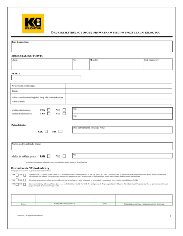 DRUK REJESTRUJĄCY OSOBĘ PRYWATNĄ W SIECI WYPOŻYCZALNI KILOUTOU Imię i nazwisko: ADRES STAŁEGO POBYTU Ulica: Nr: Miasto: kod pocztowy: PESEL: Nr dowodu osobistego: Bank: Adres zameldowania (jeżeli inny niż zamieszkania) Adres e-mail: telefon stacjonarny: TAK NIE telefon komórkowy: TAK NIE Nr: Nr: Zatrudnienie: Data zatrudnienia (miesiąc-rok): TAK NIE Nazwa i adres zakładu pracy: telefon do zakładu pracy: TAK NIE Nr: * w sytuacji posiadania zaświadczenia o zatrudnieniu należy dołączyć do dokumentu Oświadczenie Wnioskodawcy Niniejszym oświadczam, że podane dane są prawdziwe. TAK NIE Zgodnie z art. 23 ustawy z dnia 29.08.1977 o ochronie danych osobowych (Dz. U. nr 101, poz 926 z 2002 r ) oświadczam, że wyrażam zgodę na przetwarzanie moich danych osobowych przekazanych w arkuszu rejestracyjnym na potrzeby wewnętrzne sieci wypożyczalni Kiloutou Polska w celu umożliwienia dokonywania umów najmu. TAK NIE Wyrażam zgodę na przesyłanie drogą elektroniczną na mój adres e-mail informacji o nowościach i promocjach sieci wypożyczalni Kiloutou Polska. TAK NIE Upoważniam firmę Kiloutou Polska Sp. z o.o., ul. Rokicińska 142, 92-412 Łódź do wystąpienia do Krajowego Rejestru Długów Biura Informacji Gospodarczej S.A. o ujawnienie informacji gospodarczych dotyczących mojej osoby. DATA * wstawić X w odpowiedniej kratce PODPIS WNIOSKODAWCY DATA PODPIS PRACOWNIKA PRZYJMUJĄCEGO WNIOSEK 1
