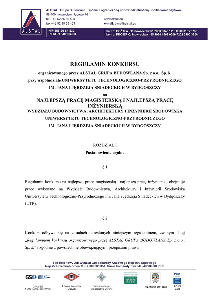 REGULAMIN KONKURSU organizowanego przez ALSTAL GRUPA BUDOWLANA Sp. z o.o., Sp. k. przy współudziale UNIWERSYTETU TECHNOLOGICZNO-PRZYRODNICZEGO IM. JANA I JĘRDZEJA ŚNIADECKICH W BYDGOSZCZY na NAJLEPSZĄ PRACĘ MAGISTERSKĄ I NAJLEPSZĄ PRACĘ INŻYNIERSKĄ WYDZIAŁU BUDOWNICTWA, ARCHITEKTURY I INŻYNIERII ŚRODOWISKA UNIWERSYTETU TECHNOLOGICZNO-PRZYRODNICZEGO IM. JANA I JĘRDZEJA ŚNIADECKICH W BYDGOSZCZY ROZDZIAŁ I Postanowienia ogólne §1 Regulamin konkursu na najlepszą pracę magisterską i najlepszą pracę inżynierską obejmuje prace wykonane na Wydziale Budownictwa, Architektury i Inżynierii Środowiska Uniwersytetu Technologiczno-Przyrodniczego im. Jana i Jędrzeja Śniadeckich w Bydgoszczy (UTP). §2 Konkurs odbywa się na zasadach określonych niniejszym regulaminem, zwanym dalej „Regulaminem konkursu organizowanego przez ALSTAL GRUPA BUDOWLANA Sp. z o.o., Sp. k.” i zgodnie z powszechnie obowiązującymi przepisami prawa. RODZIAŁ II Organizator, Patronat §3 Inicjatorem konkursu jest ALSTAL GRUPA BUDOWLANA Sp. z o.o., Sp. k. z siedzibą w Jacewie, organizatorem konkursu jest ALSTAL GRUPA BUDOWLANA Sp. z o.o., Sp. k. przy współudziale Uniwersytetu Technologiczno-Przyrodniczego im. Jana i Jędrzeja Śniadeckich. W imieniu ALSTAL GRUPA BUDOWLANA może występować Agencja Marketingowa TANDEM z siedzibą w Bydgoszczy. §4 Patronat nad Konkursem obejmują prezesi ALSTAL GRUPA BUDOWLANA: Alojzy Szczupak oraz Jarosław Szczupak. Rozdział III Przedmiot konkursu §5 Przedmiotem konkursu jest wyłonienie najlepszej pracy magisterskiej oraz najlepszej pracy inżynierskiej napisanej przez studentów Wydziału Budownictwa, Architektury i Inżynierii Środowiska UTP w Bydgoszczy studiujących w trybie studiów stacjonarnych. Rozdział IV Warunki uczestnictwa w Konkursie §6 Uczestnikiem konkursu może zostać absolwent studiów stacjonarnych magisterskich, bądź stacjonarnych inżynierskich, który obronił pracę magisterską/inżynierską na ocenę co najmniej dobrą, na Wydziale wymienionym w § 1. 1. Warunkiem uczestnictwa w konkursie jest złożenie pracy magisterskiej jako opracowania zwartego w Dziekanacie Wydziału Budownictwa, Architektury i Inżynierii Środowiska (WBAiIŚ) w formie drukowanej lub na nośniku elektronicznym najpóźniej do dnia 30 września każdego roku, albo pracy inżynierskiej do 31 kwietnia każdego roku. 2. Do złożonej pracy należy dołączyć wypełniony wniosek zgłoszenia do konkursu, stanowiący załącznik do Regulaminu, opinię promotora i recenzję pracy. 3. Pracę do konkursu powinien wytypować przede wszystkim promotor pracy dyplomowej. Ostateczną decyzję podejmuje w tej sprawie Dziekan Wydziału. Rozdział V Zasady wyboru najlepszej pracy magisterskiej i najlepszej pracy inżynierskiej §7 1. Najlepsza praca magisterska i najlepsza praca inżynierska zostaną wyłonione przez Komisję Konkursową. 2. Komisja Konkursowa, w tym Przewodniczący zostaną powołani przez Prorektora ds. Współpracy z Gospodarką UTP w Bydgoszczy na wniosek Dziekana WBAiIŚ oraz przez inicjatora i organizatora konkursu ALSTAL GRUPA BUDOWLANA Sp. z o.o., Sp. k. 3. Prace oceniane będą pod kątem: wartości merytorycznej, przedstawienia ciekawych innowacyjnych rozwiązań, indywidualnego podejścia do rozważanej problematyki. 4. Komisja podejmuje decyzję o wyborze najlepszej pracy zwykłą większością głosów, w obecności co najmniej 2/3 członków. Przy równości głosów decyduje głos Przewodniczącego. 5. Z posiedzenia Komisji zostanie sporządzony protokół, zawierający przebieg głosowania, nazwiska osób nagrodzonych, tytuł pracy oraz przyznane nagrody. 6. Od decyzji Komisji nie przysługuje odwołanie. Rozdział VI Nagrody §8 1. Pula nagród w konkursie to nagrody pieniężne. 2. Przewidziane nagrody pieniężne w wysokości: Najlepsza praca magisterska – 5 000zł brutto Najlepsza praca inżynierska – 3 000zł brutto 3. Fundatorem nagród jest ALSTAL GRUPA BUDOWLANA Sp. z o.o., Sp. k. Rozdział VII Ogłoszenie wyników i wręczenie nagród §9 1. Wyniki konkursu zostaną ogłoszone najpóźniej 30 listopada (ogłoszenie wyniku konkursu prac magisterskich) i 31 maja (ogłoszenie wyniku konkursu prac inżynierskich) każdego roku. 2. Ogłoszenie wyników konkursu nastąpi w drodze publikacji pod adresem organizatora www.utp.edu.pl, inicjatora i organizatora: www.alstal.eu, oraz na łamach kwartalnika Format UTP. 3. Oficjalne ogłoszenie nagrodzonych prac magisterskich nastąpi podczas najbliższej uroczystości wręczenia dyplomów absolwentom Wydziału Budownictwa, Architektury i Inżynierii Środowiska UTP (w grudniu każdego roku), a prac inżynierskich podczas uroczystości Święta Uczelni (w czerwcu każdego roku). 4. Nagrody wymienione w § 8 regulaminu zostaną przekazane w ciągu 30 dni od oficjalnego ogłoszenia nagrodzonych prac, na wskazane przez laureatów rachunki bankowe, po potrąceniu należnego podatku. Rozdział VIII Postanowienia końcowe § 10 1. Regulamin konkursu jest udostępniony na stronie internetowej inicjatora www.alstal.eu, oraz na stronie internetowej organizatora www.utp.edu.pl. 2. Inicjator konkursu jest uprawniony do zmian postanowień Regulaminu. 3. Inicjator i organizator konkursu zastrzega sobie prawo do dokonywania wykładni regulaminu oraz rozstrzygania wszelkich sporów powstałych przy jego stosowaniu. 4. Każdy uczestnik konkursu poprzez przystąpienie do konkursu oraz podpisanie zgody na przetwarzanie danych osobowych akceptuje warunki Regulaminu. 5. Prace magisterskie i inżynierskie udostępnione organizatorowi będą wykorzystywane w celu wyłonienia laureatów konkursu. 6. Inicjator i organizator konkursu zastrzega sobie prawo do publikowania imion, nazwisk, zdjęć i informacji o laureatach konkursu, a także informacji o nagrodzonych pracach magisterskich i nagrodzonych pracach inżynierskich. 7. W przypadku otrzymania przez organizatora informacji, po lub przed przyznaniem nagrody