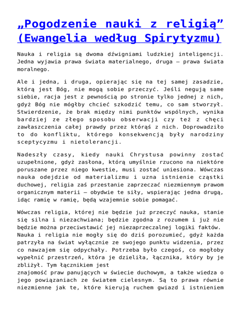 „Pogodzenie nauki z religią” (Ewangelia według Spirytyzmu) Nauka i religia są dwoma dźwigniami ludzkiej inteligencji. Jedna wyjawia prawa świata materialnego, druga — prawa świata moralnego. Ale i jedna, i druga, opierając się na tej samej zasadzie, którą jest Bóg, nie mogą sobie przeczyć. Jeśli negują same siebie, racja jest z pewnością po stronie tylko jednej z nich, gdyż Bóg nie mógłby chcieć szkodzić temu, co sam stworzył. Stwierdzenie, że brak między nimi punktów wspólnych, wynika bardziej ze złego sposobu obserwacji czy też z chęci zawłaszczenia całej prawdy przez którąś z nich. Doprowadziło to do konfliktu, którego konsekwencją były narodziny sceptycyzmu i nietolerancji. Nadeszły czasy, kiedy nauki Chrystusa powinny zostać uzupełnione, gdyż zasłona, którą umyślnie rzucono na niektóre poruszane przez niego kwestie, musi zostać uniesiona. Wówczas nauka odejdzie od materializmu i uzna istnienie cząstki duchowej, religia zaś przestanie zaprzeczać niezmiennym prawom organicznym materii — obydwie te siły, wspierając jedna drugą, idąc ramię w ramię, będą wzajemnie sobie pomagać. Wówczas religia, której nie będzie już przeczyć nauka, stanie się silna i niezachwiana; będzie zgodna z rozumem i już nie będzie można przeciwstawić jej niezaprzeczalnej logiki faktów. Nauka i religia nie mogły się do dziś porozumieć, gdyż każda patrzyła na świat wyłącznie ze swojego punktu widzenia, przez co nawzajem się odpychały. Potrzeba było czegoś, co mogłoby wypełnić przestrzeń, która je dzieliła, łącznika, który by je zbliżył. Tym łącznikiem jest znajomość praw panujących w świecie duchowym, a także wiedza o jego powiązaniach ze światem cielesnym. Są to prawa równie niezmienne jak te, które kierują ruchem gwiazd i istnieniem życia. Gdy wykazano eksperymentalnie, że takie powiązania istnieją, pojawiło się nowe światło. Wiara zwróciła się w stronę rozumu, rozum nie znalazł nic nielogicznego w wierze i materializm został pokonany. Ale i dziś niektórzy ludzie pozostawać będą w tyle, dopóki nie pociągnie ich ze sobą powszechny ruch, który zmiażdży ich, gdy będą chcieli mu się oprzeć, zamiast się podporządkować. Obecnie trwa rewolucja moralna, dzięki której dusze stają się lepsze. Przygotowywano ją przez osiemnaście stuleci — dziś zbliża się do końca, by rozpocząć nową erę w dziejach ludzkości. Łatwo jest przewidzieć następstwa tej rewolucji. Przyniesie ona nieuniknione zmiany w relacjach społecznych, którym nikt nie jest w stanie się sprzeciwić, gdyż wynikają z zamiarów Stwórcy i z prawa postępu, które jest Bożym prawem. Źródło: Ewangelia według spirytyzmu