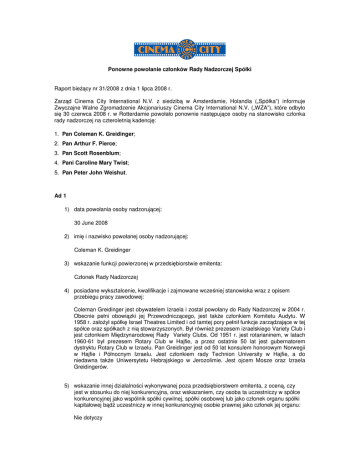 Ponowne powołanie członków Rady Nadzorczej Spółki Raport bieżący nr 31/2008 z dnia 1 lipca 2008 r. Zarząd Cinema City International N.V. z siedzibą w Amsterdamie, Holandia („Spółka”) informuje Zwyczajne Walne Zgromadzenie Akcjonariuszy Cinema City International N.V. („WZA”), które odbyło się 30 czerwca 2008 r. w Rotterdamie powołało ponownie następujące osoby na stanowisko członka rady nadzorczej na czteroletnią kadencję: 1. Pan Coleman K. Greidinger; 2. Pan Arthur F. Pierce; 3. Pan Scott Rosenblum; 4. Pani Caroline Mary Twist; 5. Pan Peter John Weishut. Ad 1 1) data powołania osoby nadzorującej: 30 June 2008 2) imię i nazwisko powołanej osoby nadzorującej: Coleman K. Greidinger 3) wskazanie funkcji powierzonej w przedsiębiorstwie emitenta: Członek Rady Nadzorczej 4) posiadane wykształcenie, kwalifikacje i zajmowane wcześniej stanowiska wraz z opisem przebiegu pracy zawodowej: Coleman Greidinger jest obywatelem Izraela i został powołany do Rady Nadzorczej w 2004 r. Obecnie pełni obowiązki jej Przewodniczącego, jest także członkiem Komitetu Audytu. W 1958 r. założył spółkę Israel Theatres Limited i od tamtej pory pełnił funkcje zarządzające w tej spółce oraz spółkach z nią stowarzyszonych. Był również prezesem izraelskiego Variety Club i jest członkiem Międzynarodowej Rady Variety Clubs. Od 1951 r. jest rotarianinem, w latach 1960-61 był prezesem Rotary Club w Hajfie, a przez ostatnie 50 lat jest gubernatorem dystryktu Rotary Club w Izraelu. Pan Greidinger jest od 50 lat konsulem honorowym Norwegii w Hajfie i Północnym Izraelu. Jest członkiem rady Technion University w Hajfie, a do niedawna także Uniwersytetu Hebrajskiego w Jerozolimie. Jest ojcem Mosze oraz Izraela Greidingerów. 5) wskazanie innej działalności wykonywanej poza przedsiębiorstwem emitenta, z oceną, czy jest w stosunku do niej konkurencyjna, oraz wskazaniem, czy osoba ta uczestniczy w spółce konkurencyjnej jako wspólnik spółki cywilnej, spółki osobowej lub jako członek organu spółki kapitałowej bądź uczestniczy w innej konkurencyjnej osobie prawnej jako członek jej organu: Nie dotyczy 6) informacje o wpisie powołanej osoby zarządzającej, zamieszczonym w Rejestrze Dłużników Niewypłacalnych, prowadzonym na podstawie ustawy o KRS: Nie dotyczy Ad 2 1) data powołania osoby nadzorującej: 30 June 2008 2) imię i nazwisko powołanej osoby nadzorującej: Arthur F. Pierce 3) wskazanie funkcji powierzonej w przedsiębiorstwie emitenta: Członek Rady Nadzorczej 4) posiadane wykształcenie, kwalifikacje i zajmowane wcześniej stanowiska wraz z opisem przebiegu pracy zawodowej Artur Pierce jest członkiem Rady Nadzorczej od 2004 r., a od listopada 2006 r. członkiem Komitetu ds. wynagrodzeń i Komitetu ds. powoływania i mianowań. Od 1996 r. do chwili obecnej pełni funkcję konsultanta, świadcząc usługi w zakresie międzynarodowej dystrybucji filmów. W latach 1954 -1972 zajmował kierownicze stanowiska w Columbia Pictures International, Paramount Pictures International oraz Cinema International Corporation. Od 1972 do 1993 r. był Wiceprezesem na Europę w Warner Brothers Theatrical Distributions, zaś od 1993 r. do 1996 r. Starszym Wiceprezesem w European Theatrical Distributions Time Warner Entertainment. Obecnie pan Pierce jest dyrektorem Luna Productions, Limited, brytyjskiej filii New Regency Productions, Inc., oraz Prezesem Frank Pierce Partners, International Theatrical Representation. Jest absolwentem Boston College w USA. Arthur Pierce spełnia kryteria niezależności określone w statucie Spółki. 5) wskazanie innej działalności wykonywanej poza przedsiębiorstwem emitenta, z oceną, czy jest w stosunku do niej konkurencyjna, oraz wskazaniem, czy osoba ta uczestniczy w spółce konkurencyjnej jako wspólnik spółki cywilnej, spółki osobowej lub jako członek organu spółki kapitałowej bądź uczestniczy w innej konkurencyjnej osobie prawnej jako członek jej organu: Nie dotyczy 6) informacje o wpisie powołanej osoby zarządzającej, zamieszczonym w Rejestrze Dłużników Niewypłacalnych, prowadzonym na podstawie ustawy o KRS: Nie dotyczy Ad 3 1) data powołania osoby nadzorującej: 30 June 2008 2) imię i nazwisko powołanej osoby nadzorującej: Scott Rosenblum 3) wskazanie funkcji powierzonej w przedsiębiorstwie emitenta: Członek Rady Nadzorczej 4) posiadane wykształcenie, kwalifikacje i zajmowane wcześniej stanowiska wraz z opisem przebiegu pracy zawodowej: Scott Rosenblum został członkiem Rady Nadzorczej w 2004 r., a w listopadzie 2006 r. Przewodniczącym Komitetu ds. wynagrodzeń i Komisji ds. powoływania i mianowań. Jest również członkiem Komitetu Audytu. Jest adwokatem oraz członkiem Rady Adwokackiej w Nowym Jorku. Od dziesięciu lat jest wspólnikiem w nowojorskiej firmie prawniczej Kramer Levin Naftalis & Frankel LLP, gdzie od 1993 r. do 2000 r. był wspólnikiem zarządzającym, zaś obecnie jest dyrektorem działu korporacyjnego i członkiem komitetu wykonawczego. Jest także dyrektorem Temco Service Industries, Inc., a do czerwca 2007 r. pełnił tę funkcję w Escala Group Inc.. Jest doradcą prawnym Israel Theatres Limited, pośredniego udziałowca Spółki. 5) wskazanie innej działalności wykonywanej poza przedsiębiorstwem emitenta, z oceną, czy jest w stosunku do niej konkurencyjna, oraz wskazaniem, czy osoba ta uczestniczy w spółce konkurencyjnej jako wspólnik spółki cywilnej, spółki osobowej lub jako członek organu spółki kapitałowej bądź uczestniczy w innej konkurencyjnej osobie prawnej jako członek jej organu: Nie dotyczy 6) informacje o wpisie powołanej osoby zarządzającej, zamieszczonym w Rejestrze Dłużników Niewypłacalnych, prowadzonym na podstawie ustawy o KRS: Nie dotyczy Ad 4 1) data powołania osoby nadzorującej: 30 June 2008 2) imię i nazwisko powołanej osoby nadzorującej: Caroline Mary Twist 3) wskazanie funkcji powierzonej w przedsiębiorstwie em