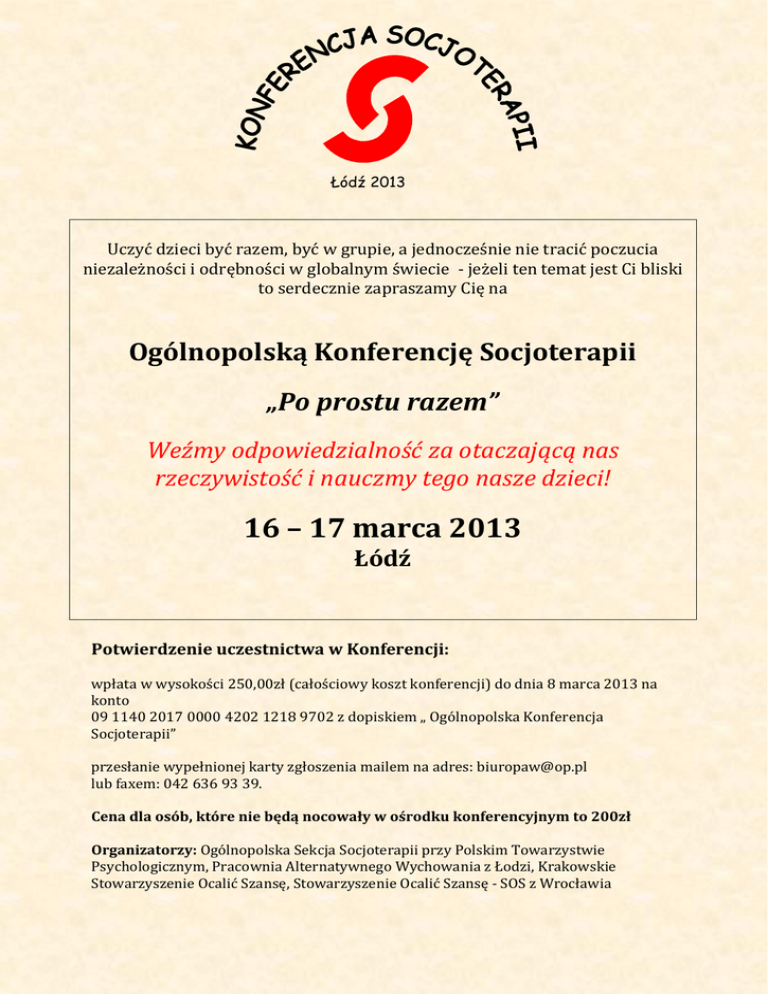 Łódź 2013 Uczyć dzieci być razem, być w grupie, a jednocześnie nie tracić poczucia niezależności i odrębności w globalnym świecie - jeżeli ten temat jest Ci bliski to serdecznie zapraszamy Cię na Ogólnopolską Konferencję Socjoterapii „Po prostu razem” Weźmy odpowiedzialność za otaczającą nas rzeczywistość i nauczmy tego nasze dzieci! 16 – 17 marca 2013 Łódź Potwierdzenie uczestnictwa w Konferencji: wpłata w wysokości 250,00zł (całościowy koszt konferencji) do dnia 8 marca 2013 na konto 09 1140 2017 0000 4202 1218 9702 z dopiskiem „ Ogólnopolska Konferencja Socjoterapii” przesłanie wypełnionej karty zgłoszenia mailem na adres: [email protected] lub faxem: 042 636 93 39. Cena dla osób, które nie będą nocowały w ośrodku konferencyjnym to 200zł Organizatorzy: Ogólnopolska Sekcja Socjoterapii przy Polskim Towarzystwie Psychologicznym, Pracownia Alternatywnego Wychowania z Łodzi, Krakowskie Stowarzyszenie Ocalić Szansę, Stowarzyszenie Ocalić Szansę - SOS z Wrocławia Wszelkie dodatkowe informacje można uzyskać w Pracowni Alternatywnego Wychowania pod numerami telefonu: (042) 637-03-12, 667 966 471, fax.: (042) 636-93-39 od poniedziałku do piątku w godzinach 830-1600 lub pisząc na adres mailowy: [email protected] Program Ogólnopolskiej Konferencji Socjoterapii Łódź, 16– 17.03. 2013. Sobota 16.03.2013. 11.00 Zakwaterowanie uczestników Konferencji 12.00 - 12.30 Uroczyste rozpoczęcie Konferencji 13.00 – 13.30 Obiad 14.00 – 16.00 Wykład prof. Anny Brzezińskiej „Po co dziecku dorosły? Po co dziecku rówieśnicy?” Pani Profesor uświetnia konferencje swoją obecnością od kilku lat. Jest absolwentką psychologii (specjalizacja psychologia kliniczna) Uniwersytetu im. Adama Mickiewicza w Poznaniu (1972). Doktorantka na Uniwersytecie Warszawskim (1976), habilitacja na UAM (1986), profesor od 2001. Profesor zwyczajny UAM w Poznaniu i SWPS w Warszawie. Członek Komitetu Psychologii PAN, kierownik Zakładu Psychologii Socjalizacji i Wspomagania Rozwoju w Instytucie Psychologii UAM oraz Katedry Psychologii Rozwoju i Edukacji w SWPS w Warszawie. Wybrane publikacje: W Poszukiwaniu Złotego Środka. Rozmowy o Rozwoju Człowieka. (2005), Portrety Psychologiczne Człowieka. Praktyczna Psychologia Rozwojowa. (2005), Społeczna Psychologia Rozwoju. (2007),Rozwój i Wychowanie Dzieci i Młodzieży z Ograniczeniami Sprawności. (2009). 16.00 – 17.00 Dyskusja po wykładzie 17.15 – 18.15 18.30 – 19.15 19.30 – 20.30 Spotkanie w grupach Kolacja Spektakl teatralny „Złap mnie” Teatr Sparowani. Teatr Sparowani powstał wraz z dniem premiery jego pierwszego spektaklu pt. Złap mnie 21 czerwca 2012 roku w Państwowej Wyższej Szkole Teatralnej we Wrocławiu. Spektakl Złap mnie stworzyła dwójka studentów PWST – Angelika Pytel i Jakub Kowalczyk, w zbiorowej reżyserii ze studentem Wydziału Reżyserii Przemysławem Jaszczakiem. Złap mnie Teatru Sparowani w roku 2012 był prezentowany na licznych festiwalach, m.in. na: Letniej Akcji Teatralnej 2012 w Teatrze Druga Strefa w Warszawie, Nocnych Teatraliach Strachy w krośnie, XIII Goleniowskich Spotkaniach Teatralnych Bramat, Spotkaniach w Łodzi oraz XXII Zimowych Spotkaniach Teatralnych w Czechowicach – Dziedzicach. Od 2013 roku Teatr Sparowani nawiązał stałą współpracę z Przestrzenią Twórczą Stacja Ligota w Katowicach. „Złap mnie” to przedstawienie o grze, w której uczestniczy każdy, kto kocha. Ale cóż znaczy kochać? Sztuka ukazuje skomplikowaną relację między dwojgiem ludzi- kobietą i mężczyzną, w której kochać znaczy nienawidzić, a nienawidzić znaczy kochać, w której pożądanie miesza się z pogardą, a pogarda z pożądaniem. Spektakl o tym, jak bardzo obcy może okazać się najbliższy człowiek, a jak bliskim może stać się ktoś, kogo nie znamy... Co dzieje się kiedy cały Twój świat okazuje się iluzją, grą z której nie ma ucieczki? 21.00 Wieczór z gitarą - Zuzanna Krasuska Niedziela 17.03.2013. 8.30 – 9.15 Śniadanie 9.30 – 11.00 Wykład dr Leszka Putyńskiego „Razem czy osobno – na chwilę czy na wieki. Dylematy współczesnych związków” Leszek Putyński – dr n. med., psycholog kliniczny. Pracownik Zakładu Psychopatologii i Psychologii Klinicznej Instytutu Psychologii Uniwersytetu Łódzkiego. Rzeczoznawca MEN w zakresie przedmiotu Wychowanie do życia w rodzinie. Przedmiotem jego szczególnych zainteresowań naukowych i zawodowych są płciowość i seksuologia, zaburzenia w odżywianiu oraz psychosomatyka ginekologiczna i położnicza. Jest autorem kilkudziesięciu artykułów naukowych, publikowanych głównie w czasopismach medycznych o zasięgu krajowym i międzynarodowym. Pracę naukowo-dydaktyczną łączy z praktycznym wykonywaniem zawodu psychologa klinicznego. 11.15 – 12.15 Spotkanie w grupach 12.30 - 14.00 Wykład Artura Lutarewicza „Redukcja szkód w profilaktyce” oraz Pawła Siłakowskiego „Tendencje na rynku narkotyków” Artur Lutarewicz absolwent psychologii Uniwersytetu Warszawskiego, psycholog w Młodzieżowym Ośrodku Socjoterapii nr 2 Kąt w Warszawie, członek Społecznego Komitetu ds. Aids, doradca Anonimowergo Punktu Testowania Hiv, profilaktyk, zajmuje się problemami młodzieży. Paweł Siłakowski psycholog, streetworker, psycholog w Rodzinnej Poradni Profilaktyki Uzależnień. 14.15 – 14.45 Oficjalne zakończenie Konferencji 15.00 – 15.30 Obiad