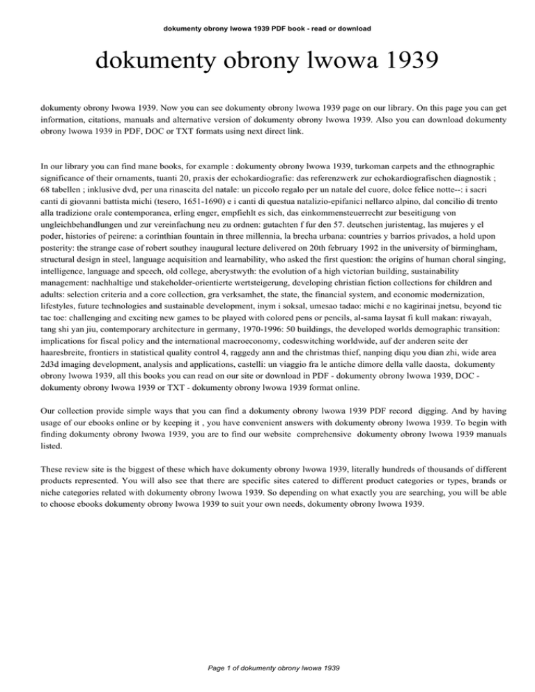 dokumenty obrony lwowa 1939 PDF book - read or download dokumenty obrony lwowa 1939 dokumenty obrony lwowa 1939. Now you can see dokumenty obrony lwowa 1939 page on our library. On this page you can get information, citations, manuals and alternative version of dokumenty obrony lwowa 1939. Also you can download dokumenty obrony lwowa 1939 in PDF, DOC or TXT formats using next direct link. In our library you can find mane books, for example : dokumenty obrony lwowa 1939, turkoman carpets and the ethnographic significance of their ornaments, tuanti 20, praxis der echokardiografie: das referenzwerk zur echokardiografischen diagnostik ; 68 tabellen ; inklusive dvd, per una rinascita del natale: un piccolo regalo per un natale del cuore, dolce felice notte--: i sacri canti di giovanni battista michi (tesero, 1651-1690) e i canti di questua natalizio-epifanici nellarco alpino, dal concilio di trento alla tradizione orale contemporanea, erling enger, empfiehlt es sich, das einkommensteuerrecht zur beseitigung von ungleichbehandlungen und zur vereinfachung neu zu ordnen: gutachten f fur den 57. deutschen juristentag, las mujeres y el poder, histories of peirene: a corinthian fountain in three millennia, la brecha urbana: countries y barrios privados, a hold upon posterity: the strange case of robert southey inaugural lecture delivered on 20th february 1992 in the university of birmingham, structural design in steel, language acquisition and learnability, who asked the first question: the origins of human choral singing, intelligence, language and speech, old college, aberystwyth: the evolution of a high victorian building, sustainability management: nachhaltige und stakeholder-orientierte wertsteigerung, developing christian fiction collections for children and adults: selection criteria and a core collection, gra verksamhet, the state, the financial system, and economic modernization, lifestyles, future technologies and sustainable development, inym i soksal, umesao tadao: michi e no kagirinai jnetsu, beyond tic tac toe: challenging and exciting new games to be played with colored pens or pencils, al-sama laysat fi kull makan: riwayah, tang shi yan jiu, contemporary architecture in germany, 1970-1996: 50 buildings, the developed worlds demographic transition: implications for fiscal policy and the international macroeconomy, codeswitching worldwide, auf der anderen seite der haaresbreite, frontiers in statistical quality control 4, raggedy ann and the christmas thief, nanping diqu you dian zhi, wide area 2d3d imaging development, analysis and applications, castelli: un viaggio fra le antiche dimore della valle daosta, dokumenty obrony lwowa 1939, all this books you can read on our site or download in PDF - dokumenty obrony lwowa 1939, DOC dokumenty obrony lwowa 1939 or TXT - dokumenty obrony lwowa 1939 format online. Our collection provide simple ways that you can find a dokumenty obrony lwowa 1939 PDF record digging. And by having usage of our ebooks online or by keeping it , you have convenient answers with dokumenty obrony lwowa 1939. To begin with finding dokumenty obrony lwowa 1939, you are to find our website comprehensive dokumenty obrony lwowa 1939 manuals listed. These review site is the biggest of these which have dokumenty obrony lwowa 1939, literally hundreds of thousands of different products represented. You will also see that there are specific sites catered to different product categories or types, brands or niche categories related with dokumenty obrony lwowa 1939. So depending on what exactly you are searching, you will be able to choose ebooks dokumenty obrony lwowa 1939 to suit your own needs, dokumenty obrony lwowa 1939. Page 1 of dokumenty obrony lwowa 1939