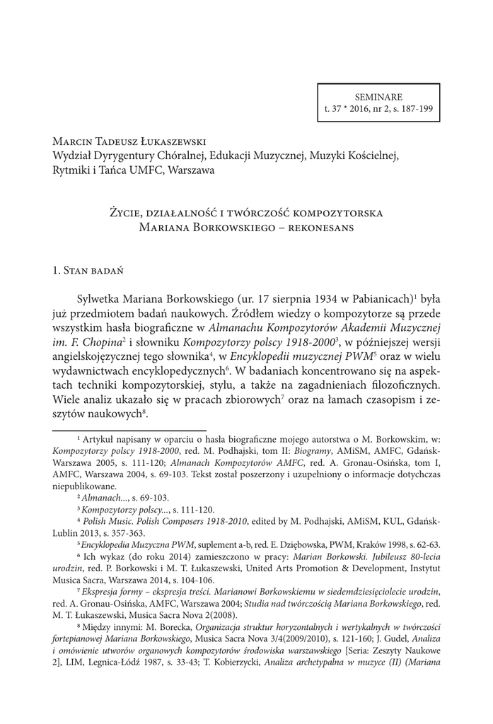 SEMINARE t. 37 * 2016, nr 2, s. 187-199 Marcin Tadeusz Łukaszewski Wydział Dyrygentury Chóralnej, Edukacji Muzycznej, Muzyki Kościelnej, Rytmiki i Tańca UMFC, Warszawa Życie, działalność i twórczość kompozytorska Mariana Borkowskiego – rekonesans 1. Stan badań Sylwetka Mariana Borkowskiego (ur. 17 sierpnia 1934 w Pabianicach)1 była już przedmiotem badań naukowych. Źródłem wiedzy o kompozytorze są przede wszystkim hasła biograficzne w Almanachu Kompozytorów Akademii Muzycznej im. F. Chopina2 i słowniku Kompozytorzy polscy 1918-20003, w późniejszej wersji angielskojęzycznej tego słownika4, w Encyklopedii muzycznej PWM5 oraz w wielu wydawnictwach encyklopedycznych6. W badaniach koncentrowano się na aspektach techniki kompozytorskiej, stylu, a także na zagadnieniach filozoficznych. Wiele analiz ukazało się w pracach zbiorowych7 oraz na łamach czasopism i zeszytów naukowych8. 1 Artykuł napisany w oparciu o hasła biograficzne mojego autorstwa o M. Borkowskim, w: Kompozytorzy polscy 1918-2000, red. M. Podhajski, tom II: Biogramy, AMiSM, AMFC, GdańskWarszawa 2005, s. 111-120; Almanach Kompozytorów AMFC, red. A. Gronau-Osińska, tom I, AMFC, Warszawa 2004, s. 69-103. Tekst został poszerzony i uzupełniony o informacje dotychczas niepublikowane. 2 Almanach..., s. 69-103. 3 Kompozytorzy polscy..., s. 111-120. 4 Polish Music. Polish Composers 1918-2010, edited by M. Podhajski, AMiSM, KUL, GdańskLublin 2013, s. 357-363. 5 Encyklopedia Muzyczna PWM, suplement a-b, red. E. Dziębowska, PWM, Kraków 1998, s. 62-63. 6 Ich wykaz (do roku 2014) zamieszczono w pracy: Marian Borkowski. Jubileusz 80-lecia urodzin, red. P. Borkowski i M. T. Łukaszewski, United Arts Promotion & Development, Instytut Musica Sacra, Warszawa 2014, s. 104-106. 7 Ekspresja formy – ekspresja treści. Marianowi Borkowskiemu w siedemdziesięciolecie urodzin, red. A. Gronau-Osińska, AMFC, Warszawa 2004; Studia nad twórczością Mariana Borkowskiego, red. M. T. Łukaszewski, Musica Sacra Nova 2(2008). 8 Między innymi: M. Borecka, Organizacja struktur horyzontalnych i wertykalnych w twórczości fortepianowej Mariana Borkowskiego, Musica Sacra Nova 3/4(2009/2010), s. 121-160; J. Gudel, Analiza i omówienie utworów organowych kompozytorów środowiska warszawskiego [Seria: Zeszyty Naukowe 2], LIM, Legnica-Łódź 1987, s. 33-43; T. Kobierzycki, Analiza archetypalna w muzyce (II) (Mariana 188 MARCIN TADEUSZ ŁUKASZEWSKI Twórczość Borkowskiego poruszano w pracach dyplomowych, licencjackich, magisterskich i doktorskich9, w książkach naukowych10 i popularnonaukowych11. Z okazji osiemdziesięciolecia jego urodzin (2014) ukazał się album z wyborem analiz i płytą CD12, a także praca zawierająca wspomnienia uczniów, przyjaciół i współpracowników jubilata13. 2. Droga do muzyki Do 1953 r. Marian Borkowski przebywał w rodzinnych Pabianicach, gdzie w latach 1942-45 uczęszczał na komplety tajnego nauczania. Po wyzwoleniu wstąpił do Szkoły Podstawowej nr 6, a następnie do I Liceum Ogólnokształcącego im. JęBorkowskiego „Dram” na orkiestrę, 1966), w: Ratio musicae, red. S. Dąbek, AMFC, Warszawa 2003, s. 85-100; tenże, Ethos muzyki współczesnej, Heksis 1(1995), s. 27-29; tenże, Kultura muzyczna u progu XXI wieku, ALBO albo 4(2003), s. 170-174; tenże, Wielopoziomowość muzyki. Studium o muzyce M. Borkowskiego, w: tenże, Muzyka i psychika, Stakroos Stowarzyszenie Aktywnego Rozwoju Osobowości dla Studentów, Warszawa 1994, s. 15-19; T. Kobierzycki, F. Maj, Witalizm i egzystencjonalizm w muzyce Mariana Borkowskiego, Heksis 2(2010) [wydanie internetowe, www.heksis.com]; R. Lasocki, Marian Borkowski – Images II na dowolny instrument smyczkowy w wersji na skrzypce solo, w: tenże, Uwagi o pracy nad współczesnym utworem skrzypcowym na przykładzie wybranych dzieł muzyki polskiej powstałych w latach ostatnich [Seria: Prace Specjalne 3], AM im. K. Szymanowskiego, Katowice 1985, s. 29-46; M. T. Łukaszewski, Faktura – brzmienie – ekspresja w twórczości chóralnej i wokalno-instrumentalnej Mariana Borkowskiego, w: Muzyka Chóralna. II Sympozjum Kompozytorskie AMFC, red. A. GronauOsińska, AMFC, Warszawa 2001, s. 146-159; tenże, Utwory na instrumenty solowe Mariana Borkowskiego. Próba charakterystyki wartości instrumentalnych i stylotwórczych, w: Potencjał kompozycyjny utworów na instrumenty solowe. III Sympozjum Kompozytorskie AMFC, red. M. Borkowski, A. Gronau-Osińska, AMFC, Warszawa 2003, s. 76-98; tenże, Sakralna twórczość na chór a cappella Mariana Borkowskiego, Liturgia Sacra 17(2011)2, s. 381-402; tenże; Rola i znaczenie organów w twórczości Mariana Borkowskiego, w: Organy i Muzyka Organowa XIV, red. J. Krassowski i in. [Seria: Prace Specjalne 77], AMiSM, Gdańsk 2009, s. 150-169; W. Węgrzyn-Klisowska, Kolorystyczna rola perkusji w twórczości Mariana Borkowskiego, w: W kręgu sztuki perkusyjnej, red. nauk. S. Skoczyński, [Seria: Zeszyty Naukowe 47], AMFC, Warszawa 1999, s. 105-110; C. Żechowski, Musica Speranza, Heksis 1(1995), s. 22-26. 9 Należą do nich m.in.: G. Hordyjewicz, Utwory na trąbkę i organy w muzyce XX wieku [praca dyplomowa], AMFC, Białystok 2004; J. Kozłowska, Współczesna polska muzyka sakralna w prawykonaniach Chóru ATK. Studium analityczne [praca magisterska], ATK, Warszawa 1998; M. T. Łukaszewski, Twórczość na chór a cappella o tematyce religijnej kompozytorów warszawskich w latach 1945-2000 [praca doktorska], AMFC, Warszawa 2004; A. Mroczek, Nadia Boulanger i jej polscy uczniowie [praca magisterska], AMFC, Warszawa 2003; D. Perkowski, Twórczość chóralna o tematyce religijnej Mariana Borkowskiego [praca magisterska], UKSW, Warszawa 2007; I. Szuwalska, Czynniki warunkujące percepcję muzyki współczesnej przez dzieci w klasie VIII [praca magisterska], WSP, Częstochowa 1984. 10 Np.: M. Szoka, Polska muzyka organowa w latach 1945-1985 [Seria: Zeszyty Naukowe 5], LIM, Łódź 1993; M. T. Łukaszewski, Muzyk