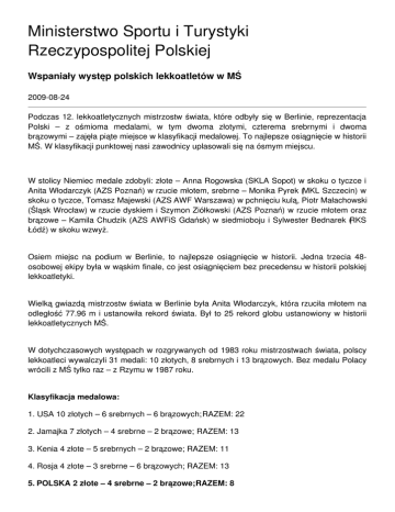 Ministerstwo Sportu i Turystyki Rzeczypospolitej Polskiej Wspaniały występ polskich lekkoatletów w MŚ 2009-08-24 Podczas 12. lekkoatletycznych mistrzostw świata, które odbyły się w Berlinie, reprezentacja Polski – z ośmioma medalami, w tym dwoma złotymi, czterema srebrnymi i dwoma brązowymi – zajęła piąte miejsce w klasyfikacji medalowej. To najlepsze osiągnięcie w historii MŚ. W klasyfikacji punktowej nasi zawodnicy uplasowali się na ósmym miejscu. W stolicy Niemiec medale zdobyli: złote – Anna Rogowska (SKLA Sopot) w skoku o tyczce i Anita Włodarczyk (AZS Poznań) w rzucie młotem, srebrne – Monika Pyrek (MKL Szczecin) w skoku o tyczce, Tomasz Majewski (AZS AWF Warszawa) w pchnięciu kulą, Piotr Małachowski (Śląsk Wrocław) w rzucie dyskiem i Szymon Ziółkowski (AZS Poznań) w rzucie młotem oraz brązowe – Kamila Chudzik (AZS AWFiS Gdańsk) w siedmioboju i Sylwester Bednarek (RKS Łódź) w skoku wzwyż. Osiem miejsc na podium w Berlinie, to najlepsze osiągnięcie w historii. Jedna trzecia 48osobowej ekipy była w wąskim finale, co jest osiągnięciem bez precedensu w historii polskiej lekkoatletyki. Wielką gwiazdą mistrzostw świata w Berlinie była Anita Włodarczyk, która rzuciła młotem na odległość 77.96 m i ustanowiła rekord świata. Był to 25 rekord globu ustanowiony w historii lekkoatletycznych MŚ. W dotychczasowych występach w rozgrywanych od 1983 roku mistrzostwach świata, polscy lekkoatleci wywalczyli 31 medali: 10 złotych, 8 srebrnych i 13 brązowych. Bez medalu Polacy wrócili z MŚ tylko raz – z Rzymu w 1987 roku. Klasyfikacja medalowa: 1. USA 10 złotych – 6 srebrnych – 6 brązowych; RAZEM: 22 2. Jamajka 7 złotych – 4 srebrne – 2 brązowe; RAZEM: 13 3. Kenia 4 złote – 5 srebrnych – 2 brązowe; RAZEM: 11 4. Rosja 4 złote – 3 srebrne – 6 brązowych; RAZEM: 13 5. POLSKA 2 złote – 4 srebrne – 2 brązowe; RAZEM: 8 6. Niemcy 2 złote – 3 srebrne – 4 brązowe; RAZEM: 9 7. Etiopia 2 złote – 2 srebrne – 4 brązowe; RAZEM: 8 8. W. Brytania 2 złote – 2 srebrne – 2 brązowe; RAZEM: 6 9. RPA 2 złote – 1 srebrny – 0 brązowych; RAZEM: 3 10. Australia 2 złote – 0 srebrnych – 2 brązowe; RAZEM: 4 Klasyfikacja punktowa (miejsca 1-8): 1. USA 231 pkt. 2. Rosja 154 3. Jamajka 136 4. Kenia 120 5. Niemcy 104 6. Etiopia 88 7. W. Brytania 81 8. POLSKA 73 9. Kuba 51 10. Chiny 50 Miejsca punktowane Polaków: 1. Anna Rogowska (SKLA Sopot, skok o tyczce) 1. Anita Włodarczyk (AZS Poznań, rzut młotem) 2. Monika Pyrek (MKL Szczecin, skok o tyczce) 2. Tomasz Majewski (AZS AWF Warszawa, pchnięcie kulą) 2. Piotr Małachowski (Śląsk Wrocław, rzut dyskiem) 2. Szymon Ziółkowski (AZS Poznań, rzut młotem) 3. Kamila Chudzik (AZS AWFiS Gdańsk, siedmiobój) 3. Sylwester Bednarek (RKS Łódź, skok wzwyż) 4. Żaneta Glanc (AZS Poznań, rzut dyskiem) 4. Grzegorz Sudoł (AZS AWF Kraków, chód 50 km) 5. sztafeta 4×400 metrów mężczyzn: Marcin Marciniszyn (Śląsk Wrocław), Piotr Klimczak (Śląsk Wrocław), Kacper Kozłowski (AZS UW Olsztyn), Jan Ciepiela (AZS AWF Kraków) i Rafał Wieruszewski (Orkan Środa Wlkp.) 7. Lidia Chojecka (Warszawianka, 1500 metrów) 8. Marcin Lewandowski (Ósemka Police, 800 metrów)