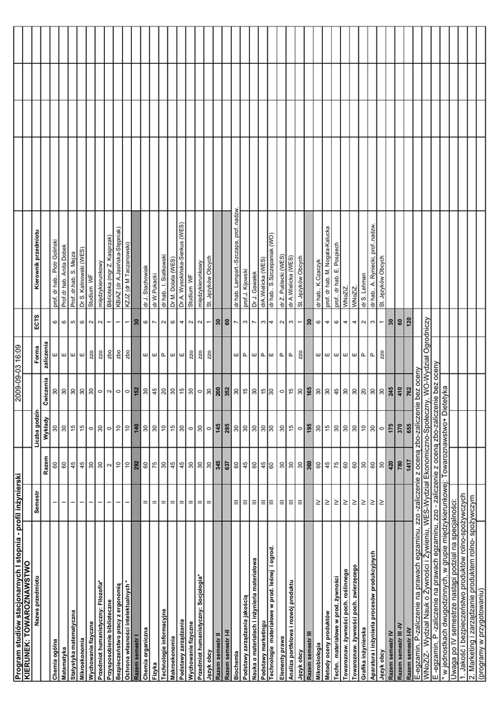 II II II II II Podstawy zarządzania Wychowanie fizyczne Przedmiot humanistyczny: Socjologia* Język obcy 60 III III III III III III III Biochemia Podstawy zarządzania jakością Nauka o materiałach i inŜynieria materiałowa Podstawy marketingu Technologie materiałowe w prod. leśnej i ogrod. Elementy prawa Analiza portfelowa i rozwój produktu Język obcy 60 IV IV IV IV IV IV IV Mikrobiologia Metody oceny produktów Techn. materiałowe w prod. Ŝywności Towaroznaw. Ŝywności poch. roślinnego Towaroznaw. Ŝywności poch. zwierzęcego Grafika inŜynierska Aparatura i inŜynieria procesów produkcyjnych Język obcy 780 1417 Razem semestr III -IV Razem semestr I-IV 655 370 175 0 30 10 30 30 30 15 30 195 0 15 30 30 30 30 30 30 285 145 0 30 0 30 15 10 30 30 140 10 10 0 30 0 15 15 30 30 Wykłady Liczba godzin 762 410 245 30 30 20 30 30 45 30 30 165 30 15 0 15 30 30 15 30 352 200 30 0 30 15 30 20 45 30 152 0 0 2 0 30 30 30 30 30 Ćwiczenia zzo P P E E E E E zzo P P P E E P E zzo zzo zzo E E P E E zbo zbo zbo zzo zzo E E E E zaliczenia Forma 2009-09-03 16:09 120 60 30 1 3 2 4 4 6 4 6 30 1 3 2 3 4 7 3 7 60 30 1 2 2 4 6 2 7 6 30 1 1 1 2 2 6 5 6 6 ECTS E-egzamin, P-zaliczenie na prawach egzaminu, zzo -zaliczenie z oceną zbo-zaliczenie bez oceny WNoZiZ- Wydział Nauk o śywności i śywieniu, WES-Wydział Ekonomiczno-Społeczny, WO-Wydział Ogrodniczy E -egzamin, P -zaliczenie na prawach egzaminu, zzo - zaliczenie z oceną zbo-zaliczenie bez oceny * w jednostkach dwugodzinnych, w grupie międzykierunkowej: Towaroznawstwo+ Dietetyka Uwaga po IV semestrze nastąpi podzial na specjalności: 1. Jakość i bezpieczeństwo produktów rolno-spoŜywczych 2. Marketing i zarządzanie produktem rolno- spoŜywczym (programy w przygotowaniu) 420 Razem semestr IV 30 60 30 60 60 75 45 360 IV Razem semestr III 30 30 30 45 60 60 45 637 III Razem semestr I-II 345 Razem semestr II 30 30 30 45 45 30 75 Makroekonomia 10 II I Ochrona własności intelektualnych * 2 10 Technologie informacyjne I Bezpieczeństwo pracy z ergonomią 60 I Przysposobienie biblioteczne 30 II I Przedmiot humanistyczny: Filozofia* 30 II I Wychowanie fizyczne 45 Fizyka I Mikroekonomia 45 Chemia organiczna I Statystyka matematyczna 60 60 292 I Razem Razem semestr I I Matematyka Semestr Chemia ogólna Nazwa przedmiotu Program studiów stacjonarnych I stopnia - profil inŜynierski KIERUNEK: TOWAROZNAWSTWO St. Języków Obcych dr hab.. A. Ryniecki, prof..nadzw. dr S. Lehman WNoZiZ. WNoZiZ. prof.. dr hab. E. Pospiech prof. dr hab. M. Nogala-Kalucka dr hab.. K.Czaczyk St. Języków Obcych dr A.Wielicka (WES) dr Z. Puślecki (WES) drA.Wielicka (WES) dr hab.. S.Szczepaniak (WO) Dr J. Gawałek prof.J. Kijowski dr hab. Lampart.-Szczapa, prof..nadzw. St. Języków Obcych międzykierunkowy Studium WF Dr.A. Wysokińska-Senkus (WES) Dr M. Dolata (WES) dr hab.. I. Siatkowski dr W.Pukacki dr J. Stachowiak KZJZ (dr M Taczanowski) KBiAZ (dr A.Jasińska-Stępniak) Biblioteka (mgr Z. Kasprzak) międzykierunkowy Studium WF Dr S. Kalinowski (WES) Prof..dr.hab. S. Mejza Prof.dr hab. Anita Dobek prof. dr hab.. Piotr Goliński Kierownik przedmiotu